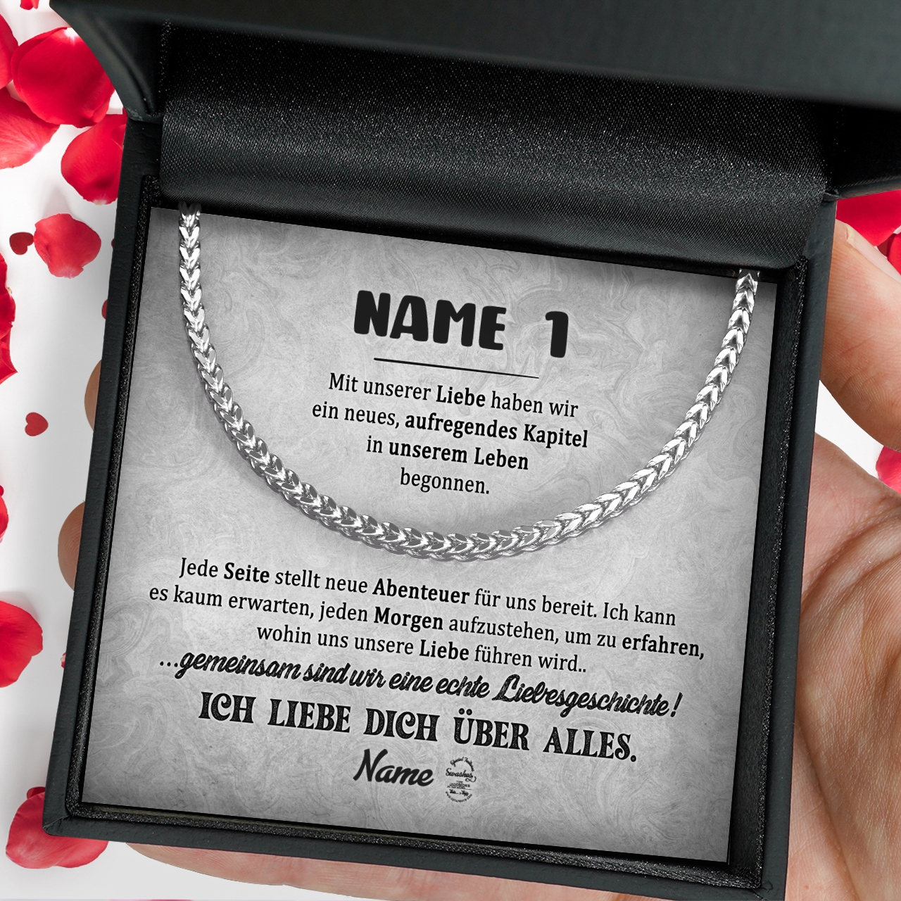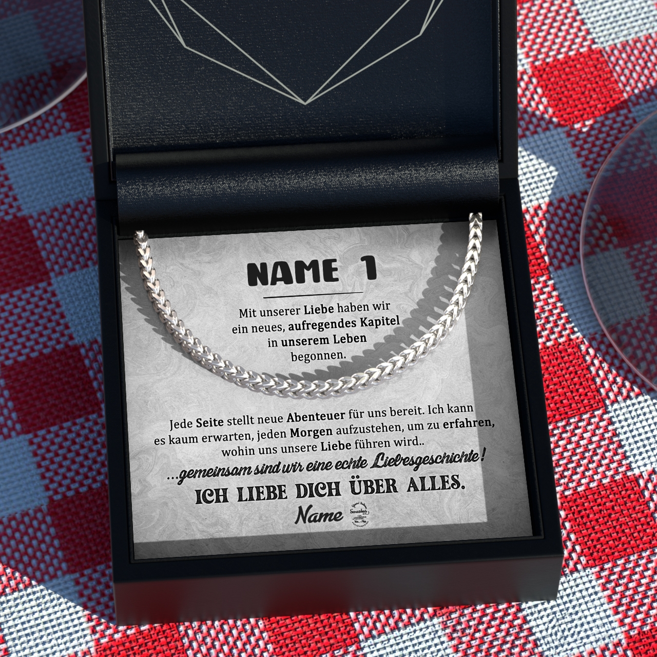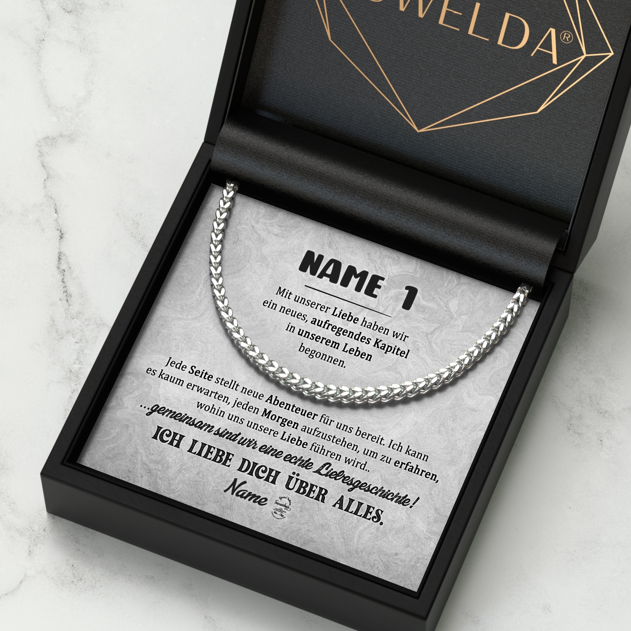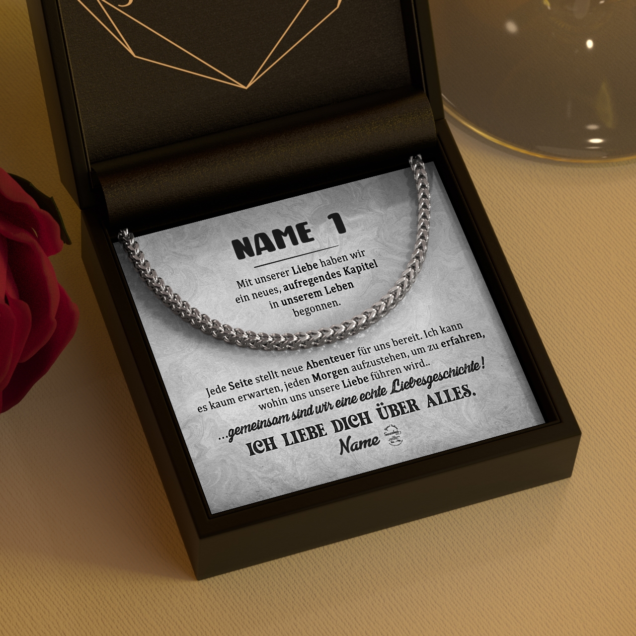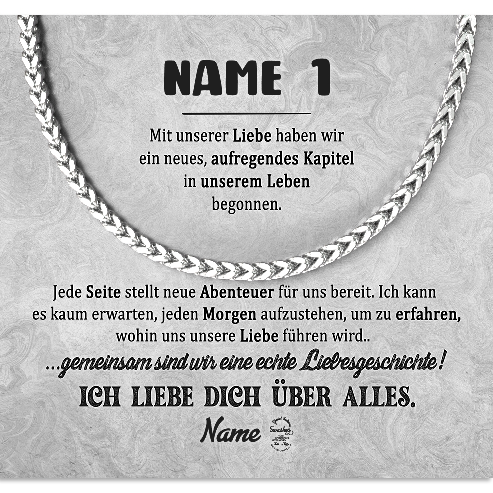 Unsere Halskette aus 316L Edelstahl ist das perfekte Geschenk für Deinen Freund. In Silber oder Gold erhältlich, ist die Kette 55 cm lang und ein perfektes Geschenk für jeden Anlass. Die Halskette ist aus hochwertigem Edelstahl gefertigt und sieht daher sehr elegant aus. Sie ist rostfrei und langlebig und kann daher problemlos jeden Tag getragen werden. Mit dem Konfigurator kannst Du die Karte ganz einfach personalisieren. Anschließend kannst Du Dir eine Vorschau der Karte mit euren Namen und der liebevollen Botschaft anschauen. Die Halskette wird optional in einer schönen Geschenkverpackung geliefert.