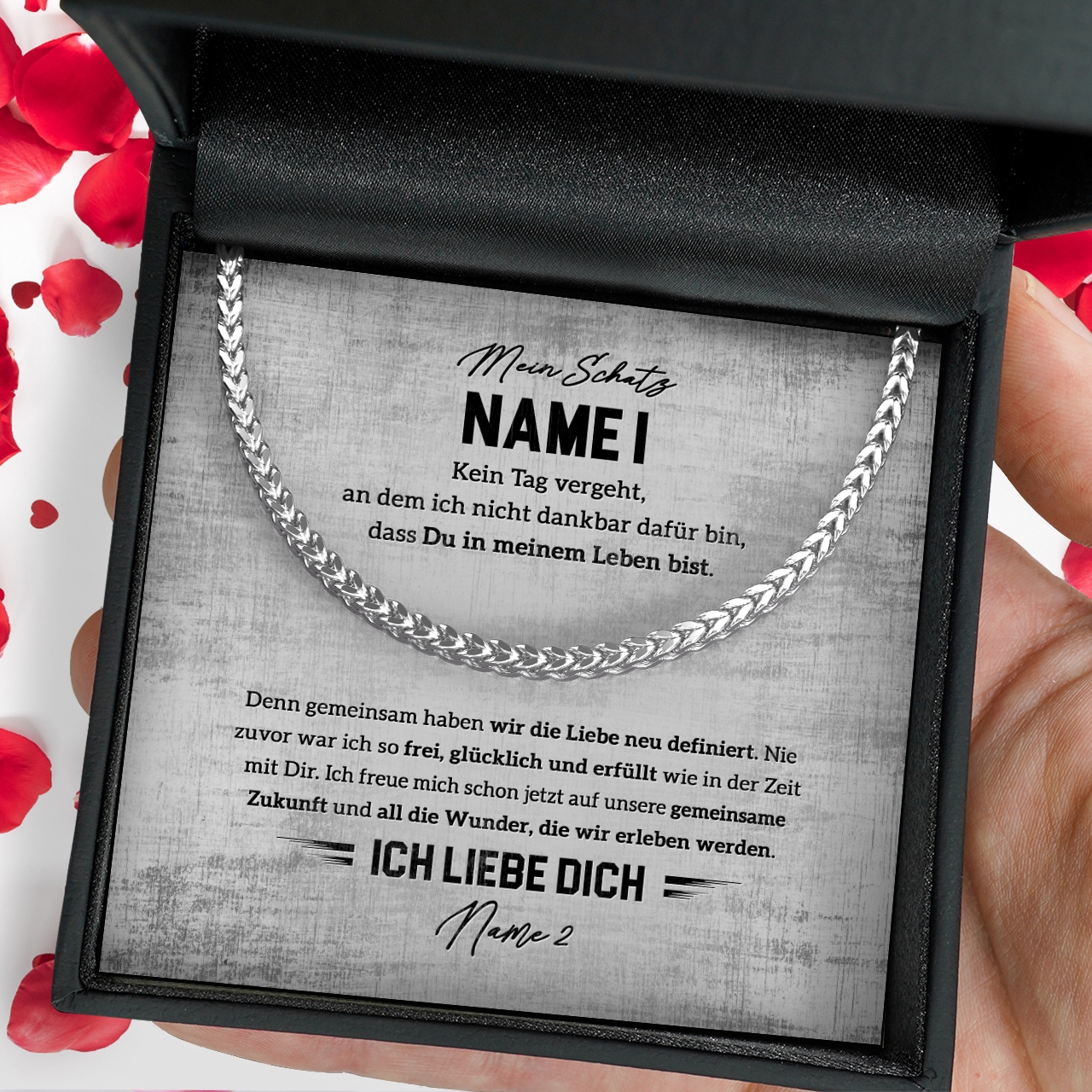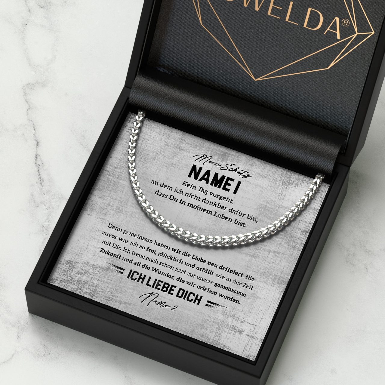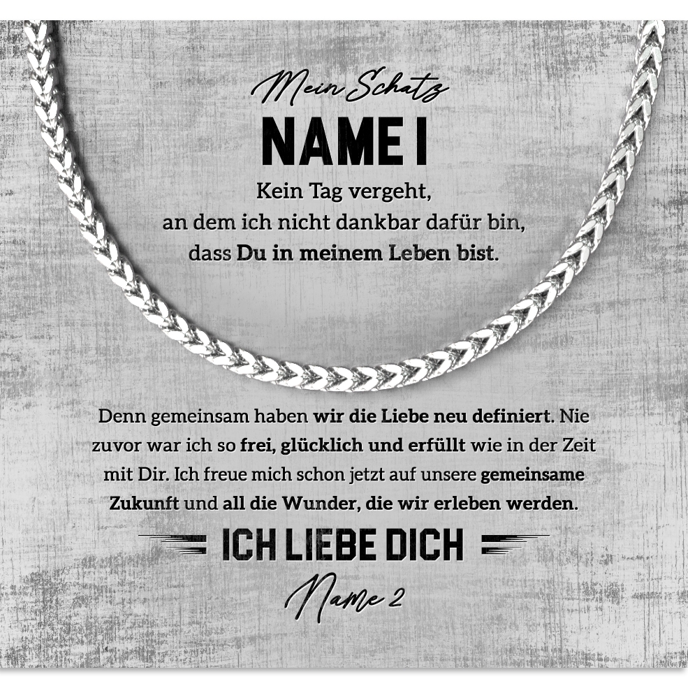 Egal für welchen Anlass, diese Halskette ist das perfekte Geschenk für Deinen Partner. Sie wird in einer schönen Geschenkbox geliefert und ist somit ideal für alle Anlässe. Personalisiere die Kette mit Deinem Namen auf der Grußkarte und überreiche ein Geschenk mit einer sehr persönlichen Nachricht. So hat Dein Freund immer ein schönes Andenken an den besonderen Moment.