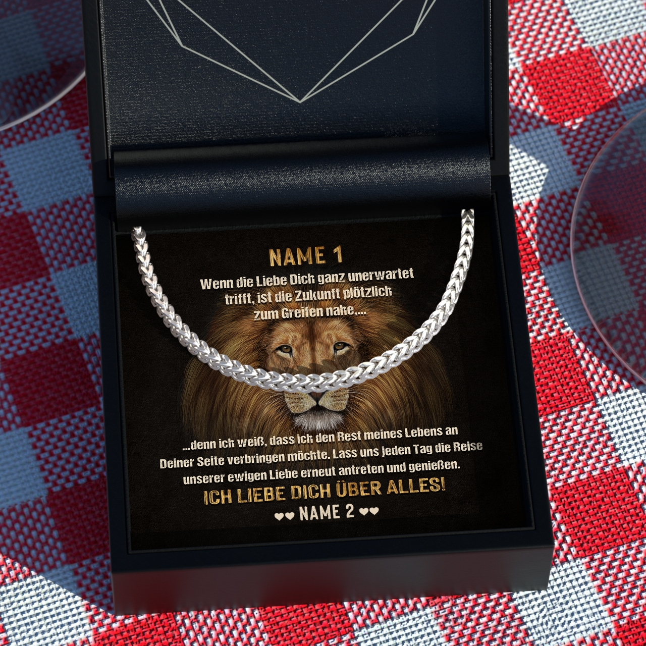 Möchtest Du Dein Geschenk sofort an Deinen Lieblingsmenschen überreichen? Dann solltest Du ein Blick auf die Variante mit der Premium-Geschenkverpackung werfen. Die Halskette Deiner Wahl und Deine personalisierte Karte wird liebevoll in eine hochwertige Schmuckbox mit Kunstlederüberzug und Samt-Innenbezug gelegt. Damit die Überraschung auch wirklich gut ankommt, wird alles behutsam in eine Geschenktasche gelegt, in Seidenpapier verpackt und mit einer Schleife zugebunden. Hier bekommst Du bereits einen kleinen Vorgeschmack: