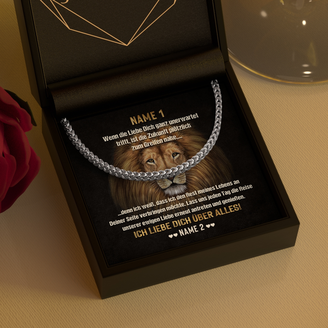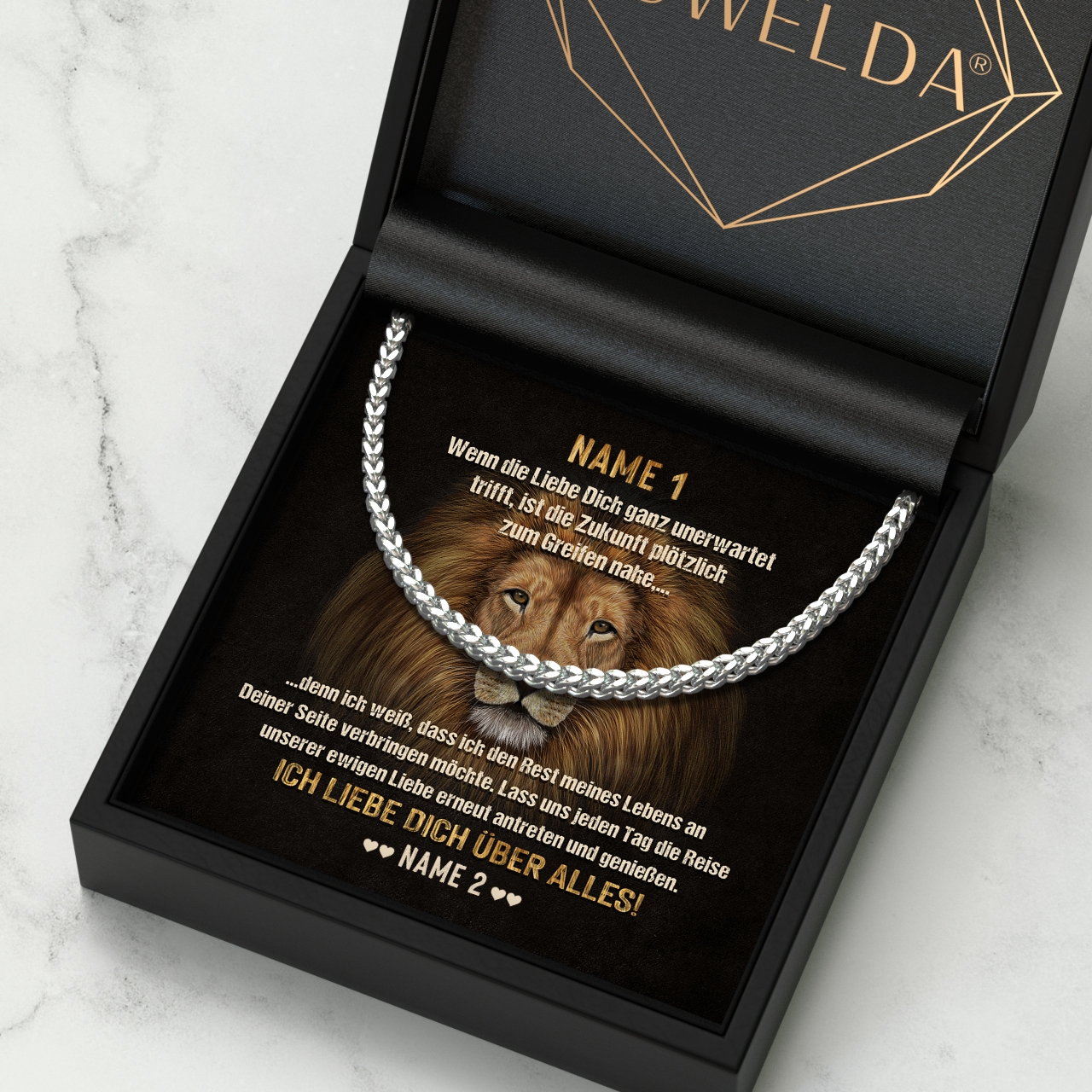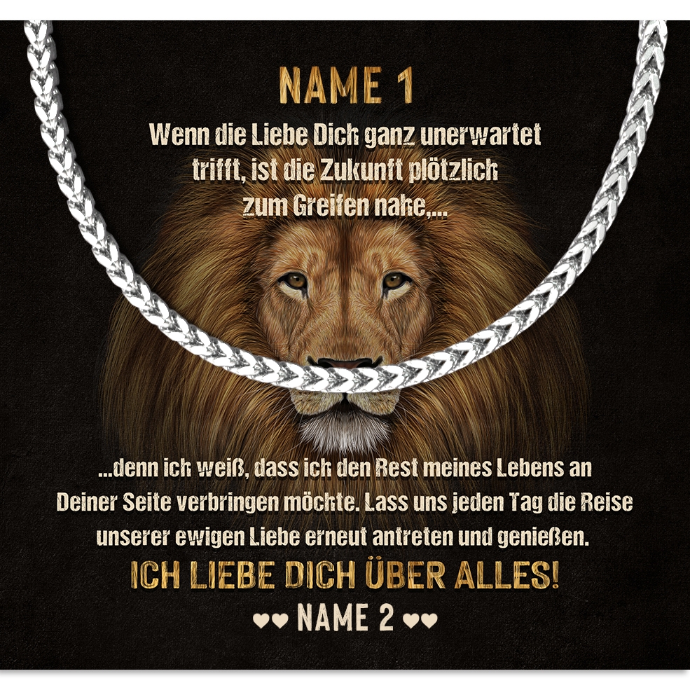 Die Halskette für Herren von Juwelda ist das perfekte Geschenk für Deinen Partner. Er wird es lieben, dass Du Dir so viel Mühe gemacht hast, um ihm etwas so Persönliches und Wertvolles zu schenken. Die Halskette ist aus 316L Edelstahl gefertigt und in Silber oder Gold erhältlich. Die Kette ist 55 cm lang, antiallergisch und somit auch für empfindliche Haut geeignet. Sie ist das perfekte Geschenk für Deinen Liebsten. Die Grußkarte ist personalisiert und mit einer persönlichen Botschaft versehen. Du kannst die Halskette zusätzlich in einer schönen Geschenkverpackung erhalten.