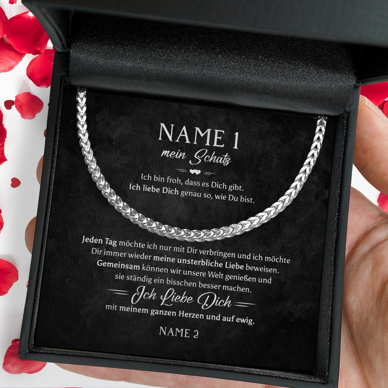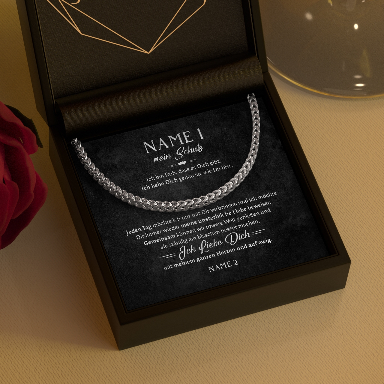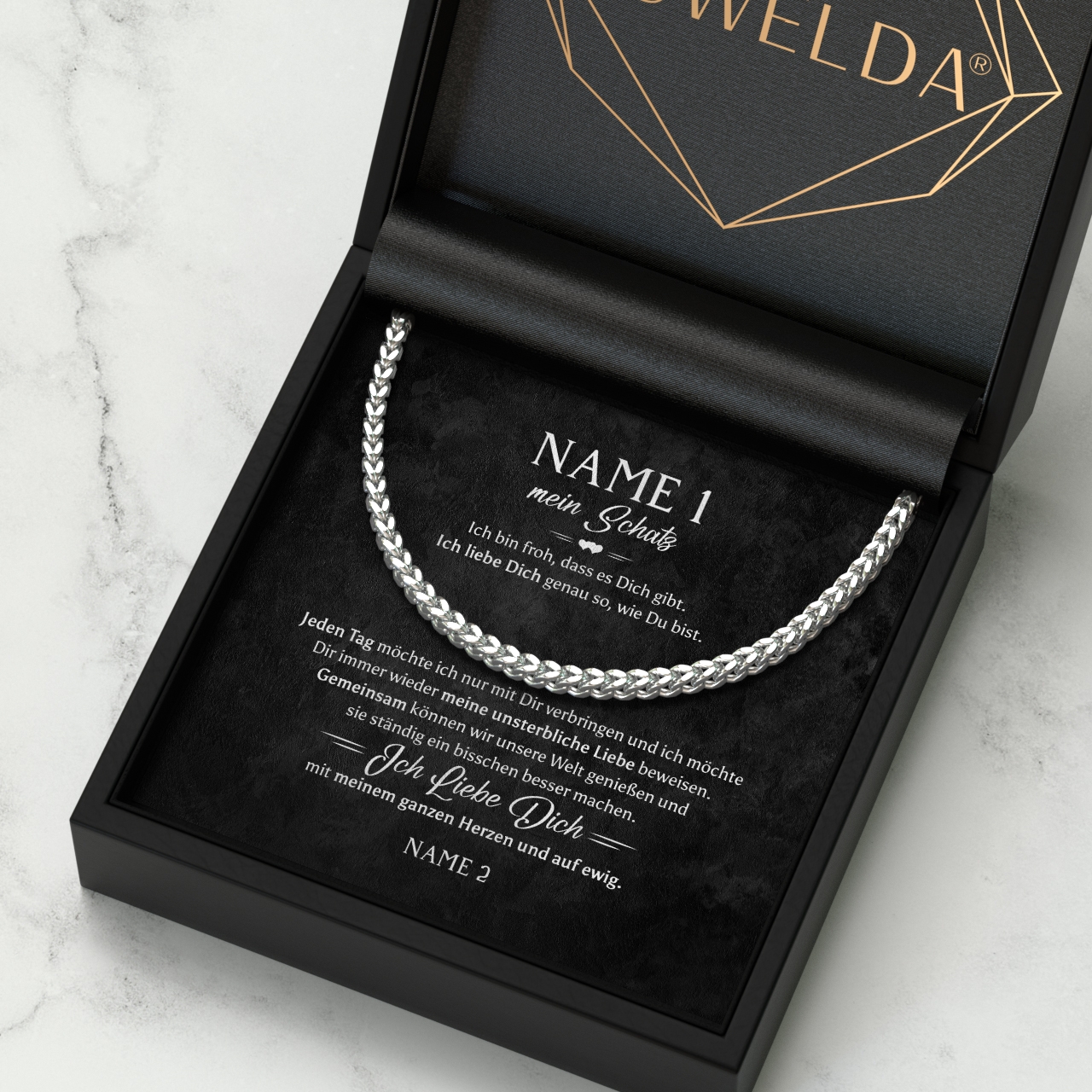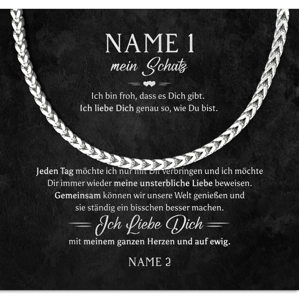Du suchst nach dem perfekten Geschenk für Deinen Partner? Dann ist unsere Halskette aus 316L Edelstahl genau das Richtige für Dich. In Silber oder Gold erhältlich, ist die Kette 55 cm lang und ein wunderschönes Geschenk für jeden Anlass. Die Grußkarte ist personalisiert mit Deinem Namen und Du kannst Dir diese in der Vorschau anschauen. Wir verpacken die Halskette dann für Dich zu einem schönen Geschenk mit Seidenpapier, einer Geschenktasche und einer Schleife.
