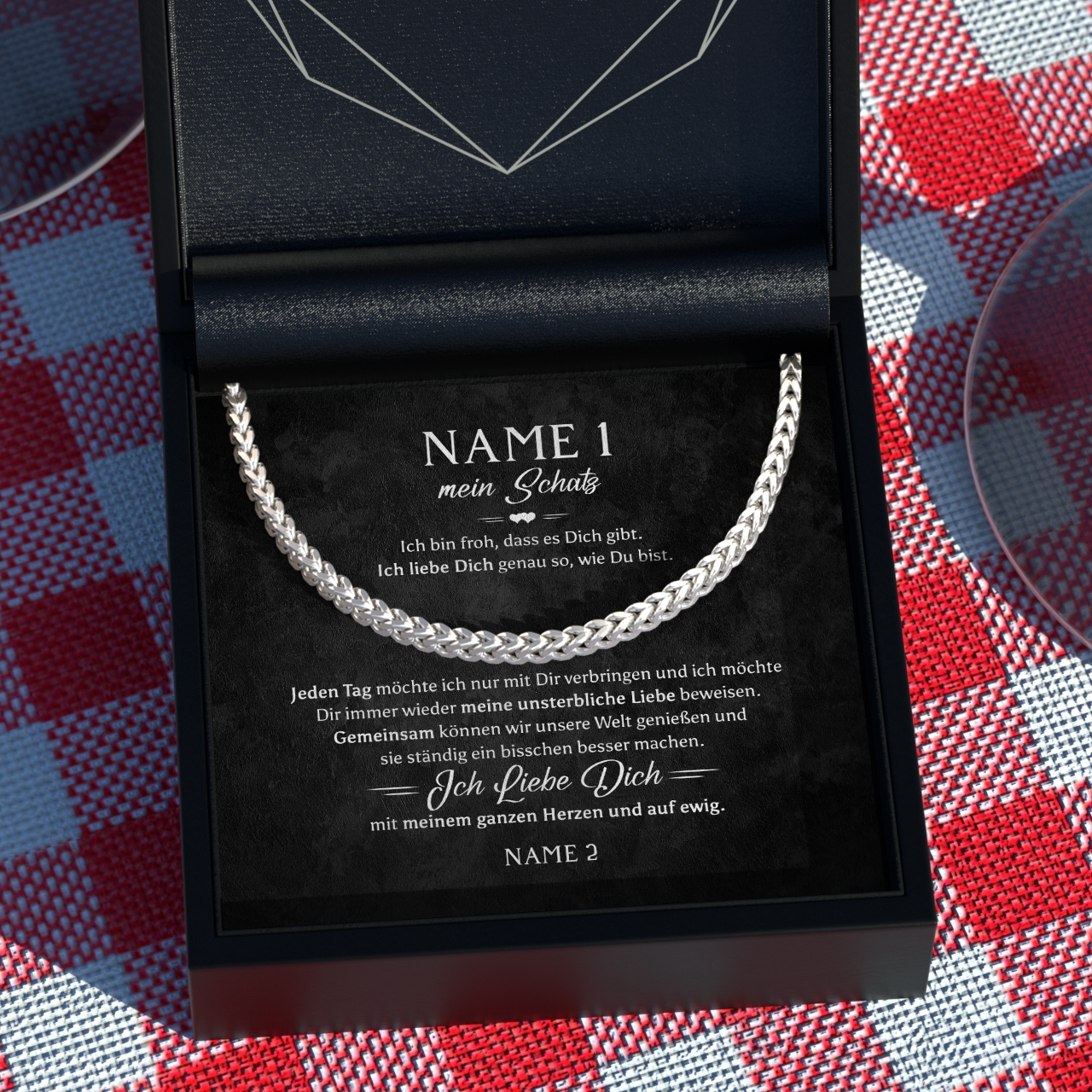 Wenn Du nach einem Geschenk für Deinen Freund suchst, dann ist diese Halskette genau das Richtige. Die Kette ist aus Edelstahl und hat ein modernes und elegantes Design. Sie wird sicherlich überraschen und begeistern. Dein Partner wird sich über dieses emotionale Geschenk mit der persönlichen Botschaft riesig freuen.