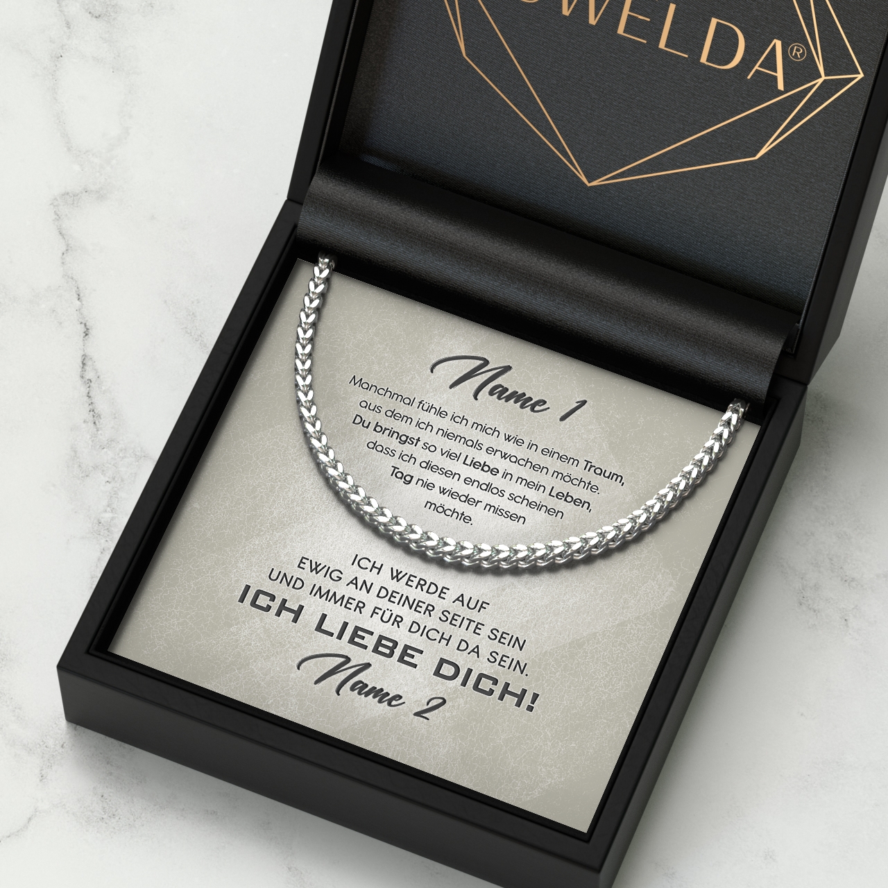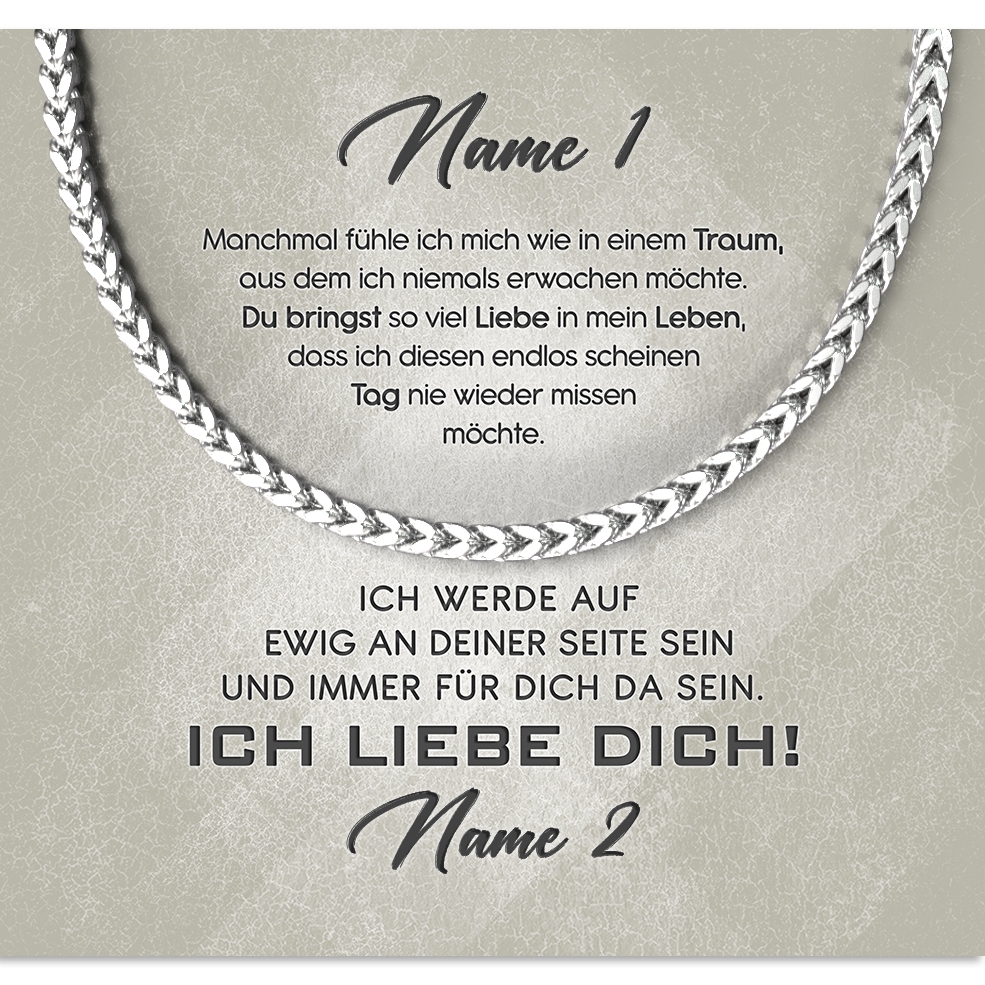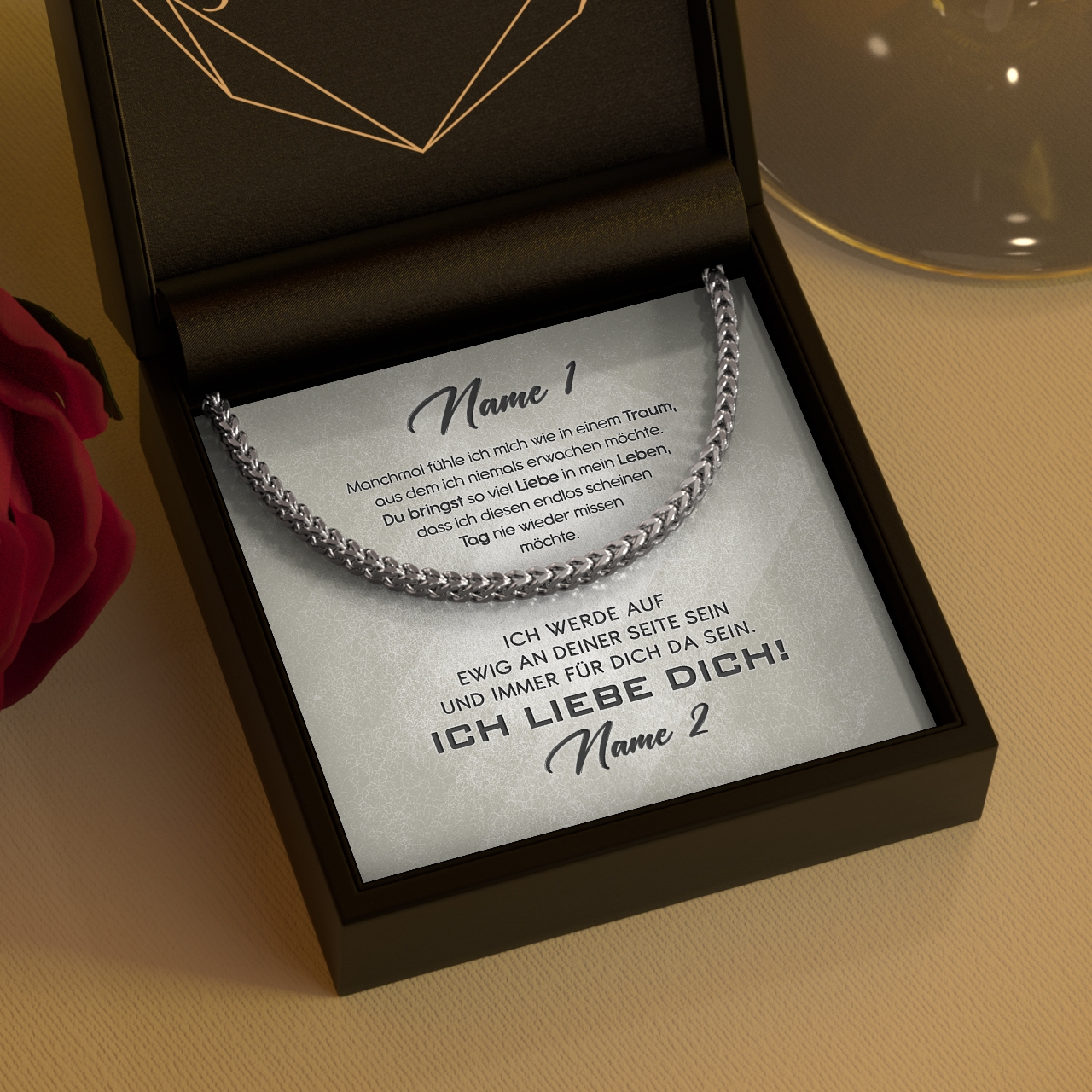 Diese Halskette ist ein tolles Geschenk für Deinen Partner. Sie ist aus 316L Edelstahl gefertigt und in Silber oder Gold erhältlich. Die Kette ist 55 cm lang und kommt in einer hochwertigen Schmuckbox. Zusätzlich kannst Du eine individualisierbare Grußkarte mit einer persönlichen Botschaft personalisieren.