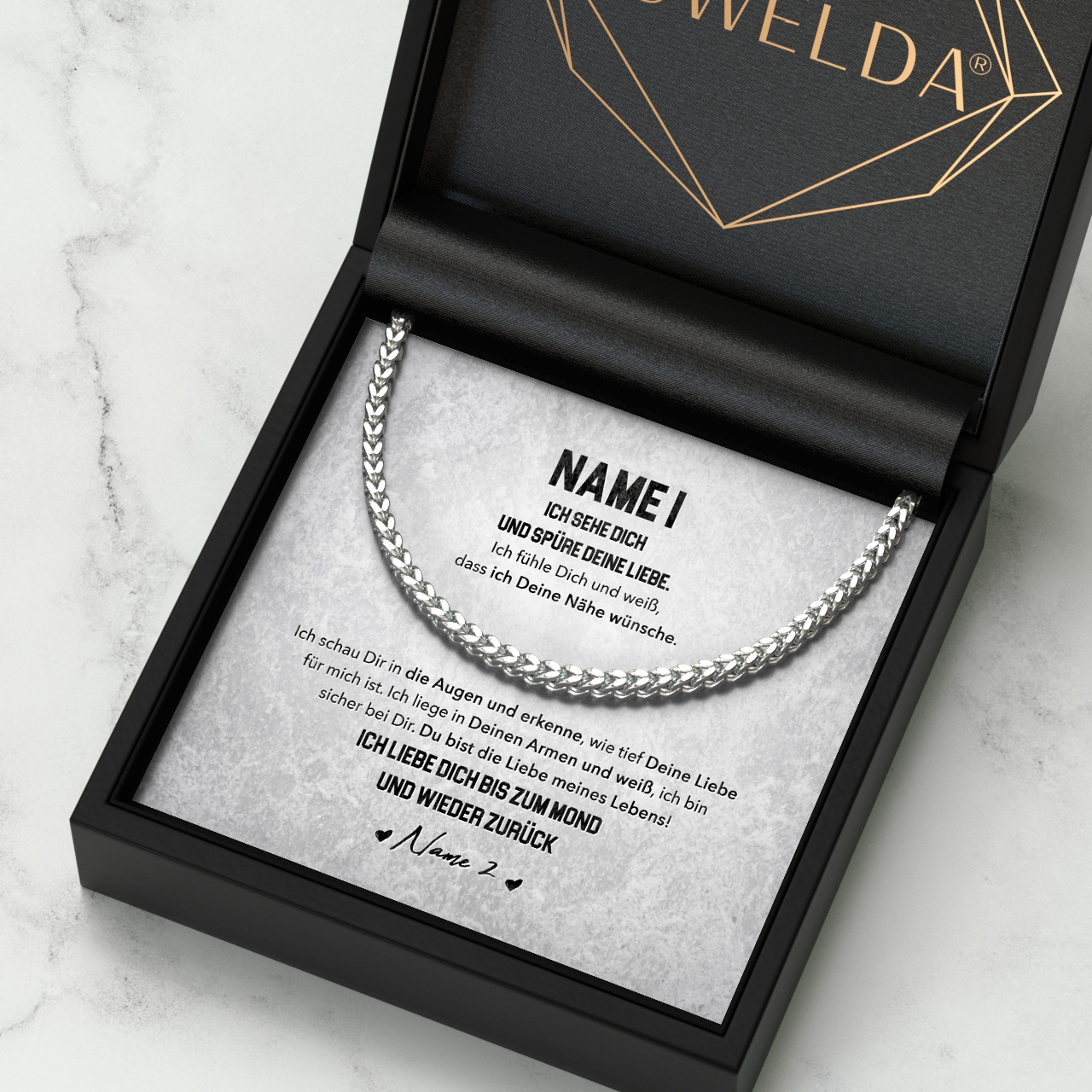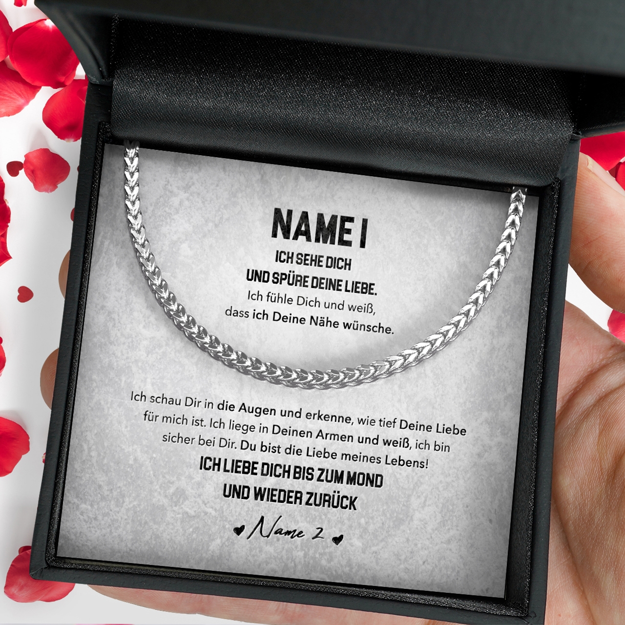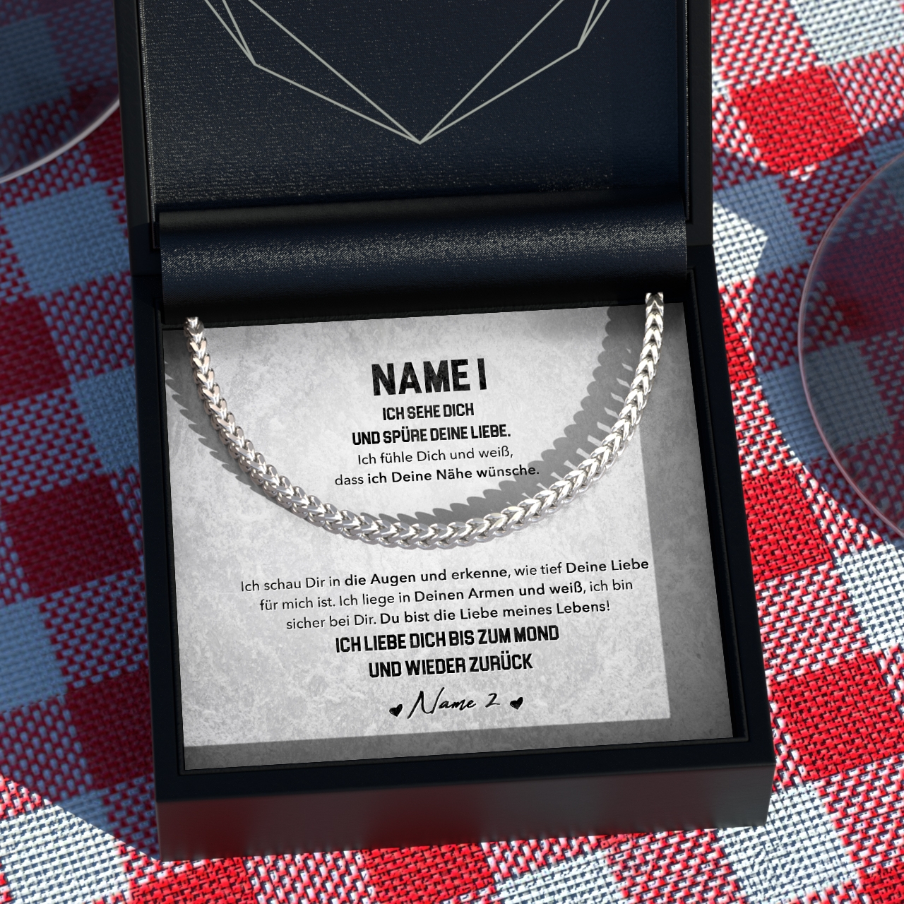 Diese Halskette eignet sich wunderbar als Geschenk für Deinen Partner. Sie ist aus 316L Edelstahl, antiallergisch und in Silber oder Gold erhältlich. Die Kette ist 55 cm lang und wird in einer hochwertigen Schmuckbox geliefert. Die Grußkarte ist personalisiert und Du hast die Möglichkeit, eine optionale Geschenkverpackung zu wählen.