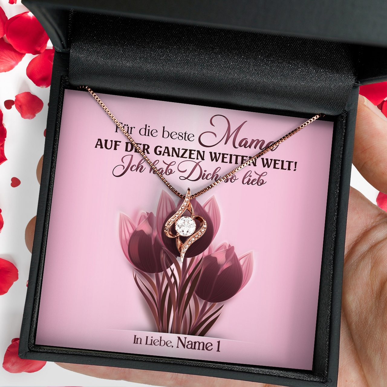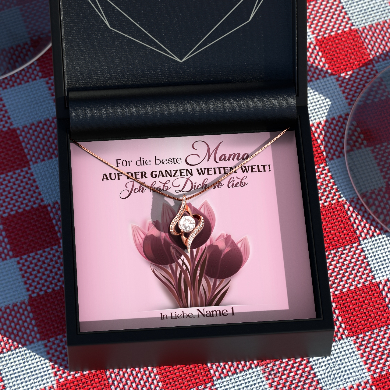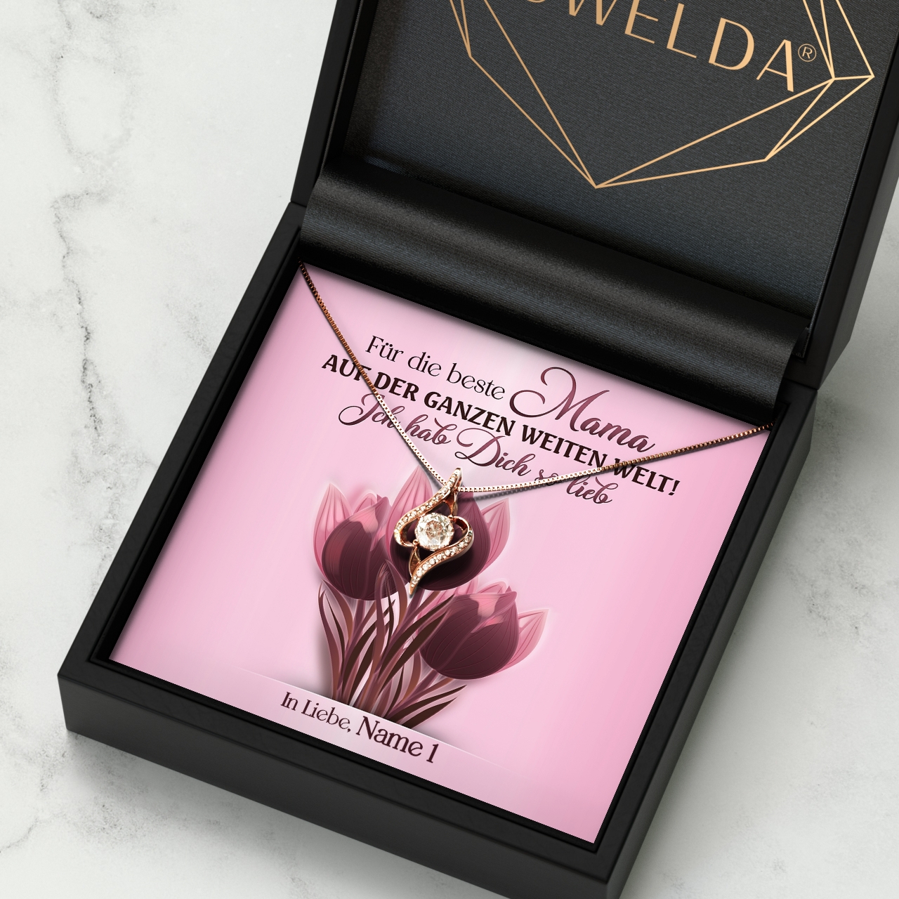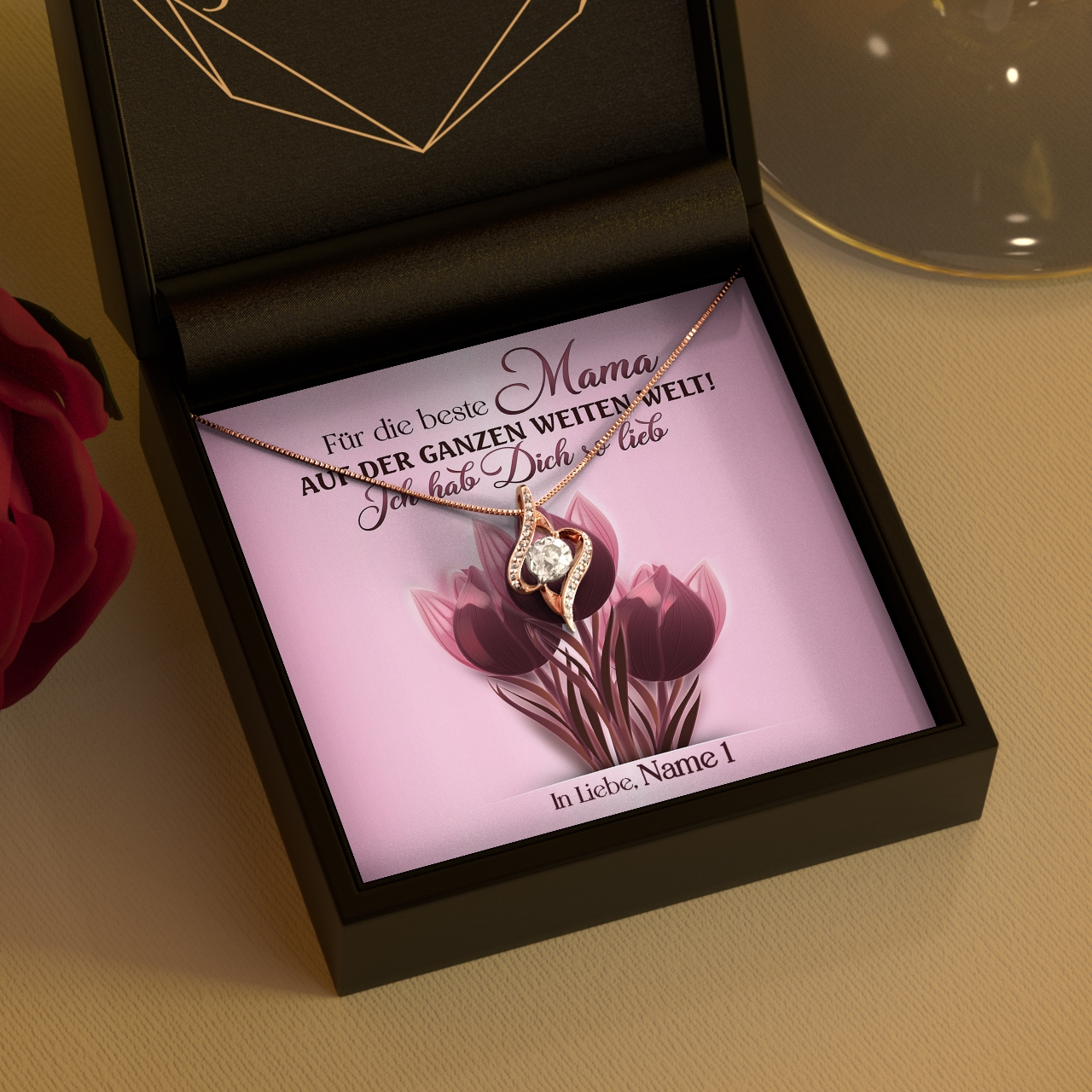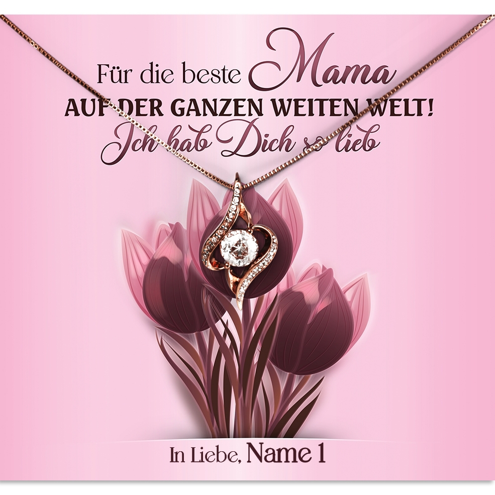 Deine Mutter ist durch ihre Liebe einer der wichtigsten Menschen in Deinem Leben. Jetzt ist es an der Zeit, einfach mal “Danke” zu sagen. Danke für jede Minute ihres Lebens, in der sie sich um Dich gekümmert hat und danke für jeden Moment, den Du mit ihr bisher verbringen konntest. Und wie könntest Du Dich liebevoller bedanken als mit einem einzigartigen Set aus personalisierter Grußkarte, wunderschönem Schmuckstück und einer edlen Schmuckbox?
