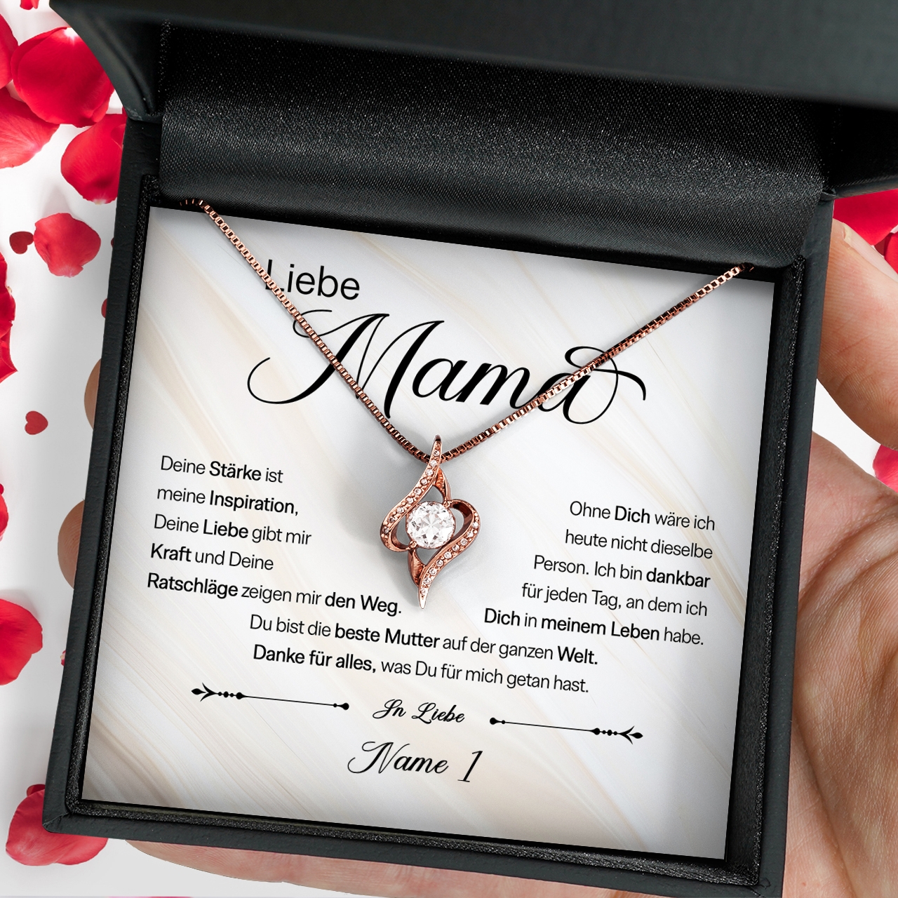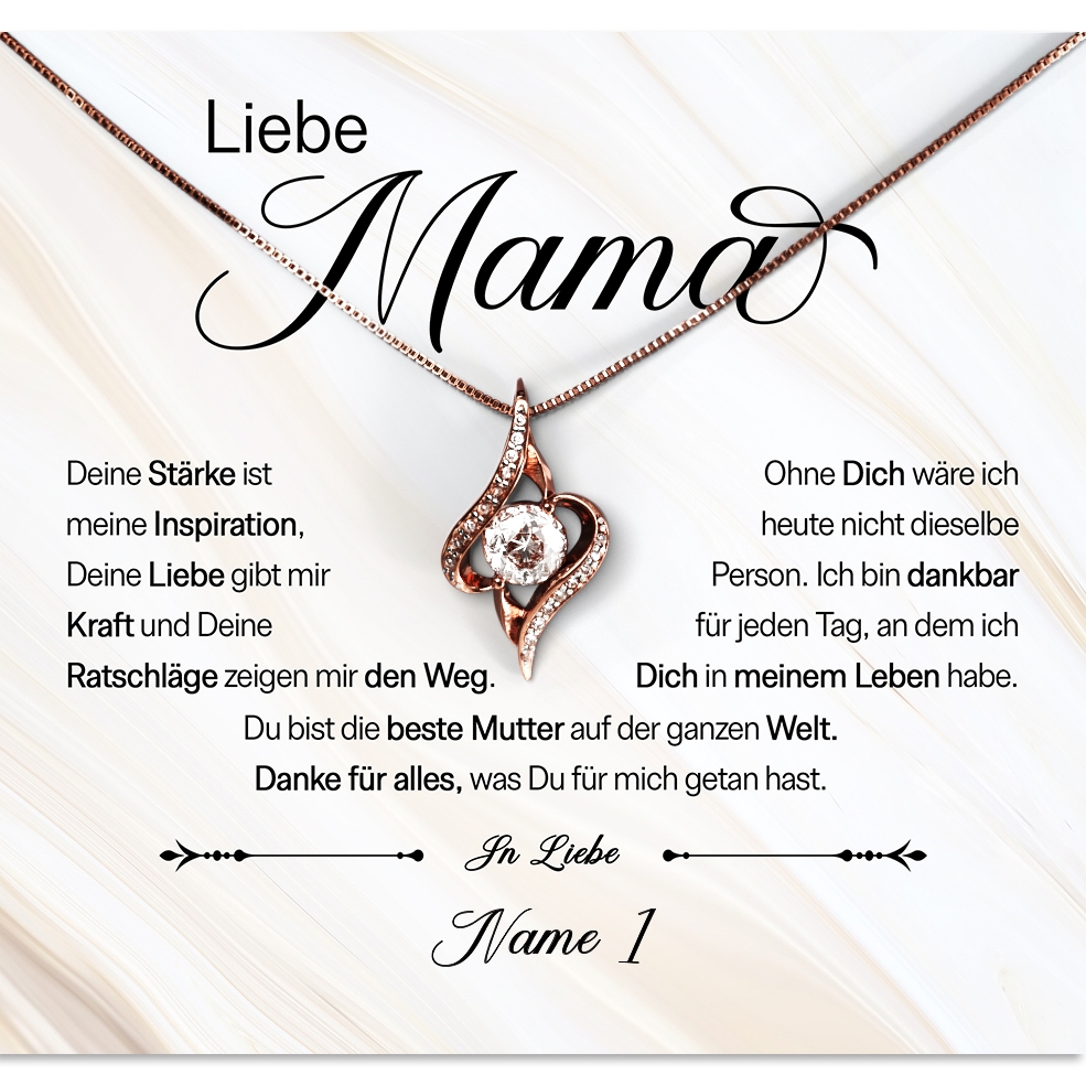 Jede Mutter ist auf ihre eigene Art und Weise einzigartig. In einem Punkt sind aber alle gleich: Sie lieben ihre Kinder, spenden Kraft und haben immer den richtigen Ratschlag. Mit unserer personalisierten Karte „Deine Stärke“ kannst Du Deiner Mama Deine Dankbarkeit zeigen. Du musst Dich nur für eine Halskette Deiner Wahl in den Farben Silber, Gold oder Roségold entscheiden und Deinen Namen in das Personalisierungsfeld eintragen. Anschließend siehst Du in der Live-Vorschau, wie Dein persönliches Geschenk aussehen wird.