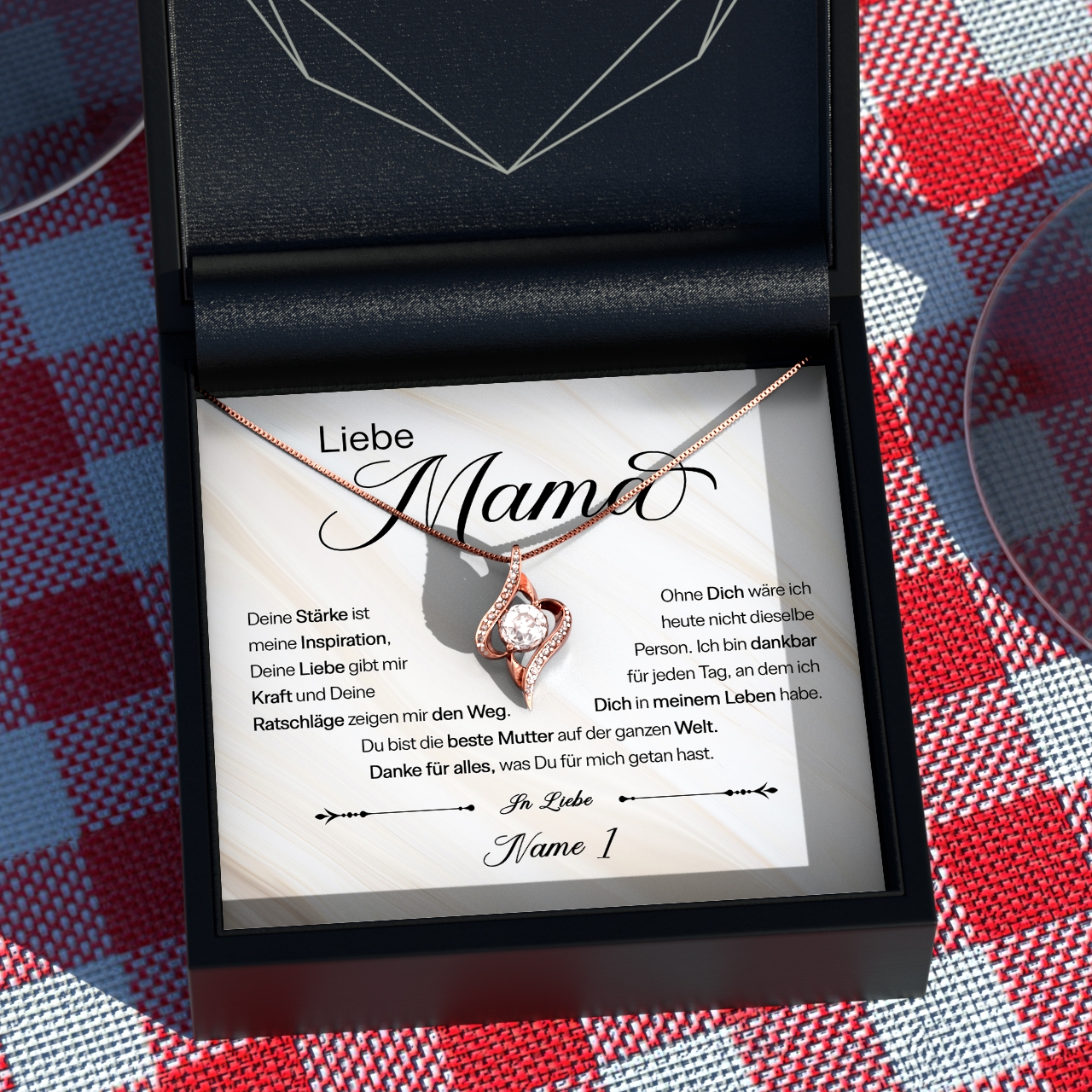 Die personalisierte Karte mit Deinen Wunschnamen ist ein wahres Unikat, denn wir stellen die Karte genau nach Deinen Vorgaben und nur für Dich her. Somit erhältst Du ein Präsent, dass so besonders ist wie Deine Mutter. Damit das Geschenk auch wirklich gut ankommt, legen wir die funkelnde Halskette und die Karte in eine hochwertige Schmuckbox aus Kunstleder. Zusätzlich erhältst Du von uns eine Geschenktüte, damit Du das Geschenk sofort an Deine Mama überreichen kannst.