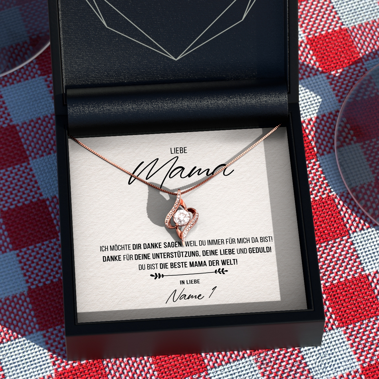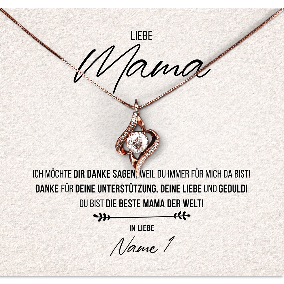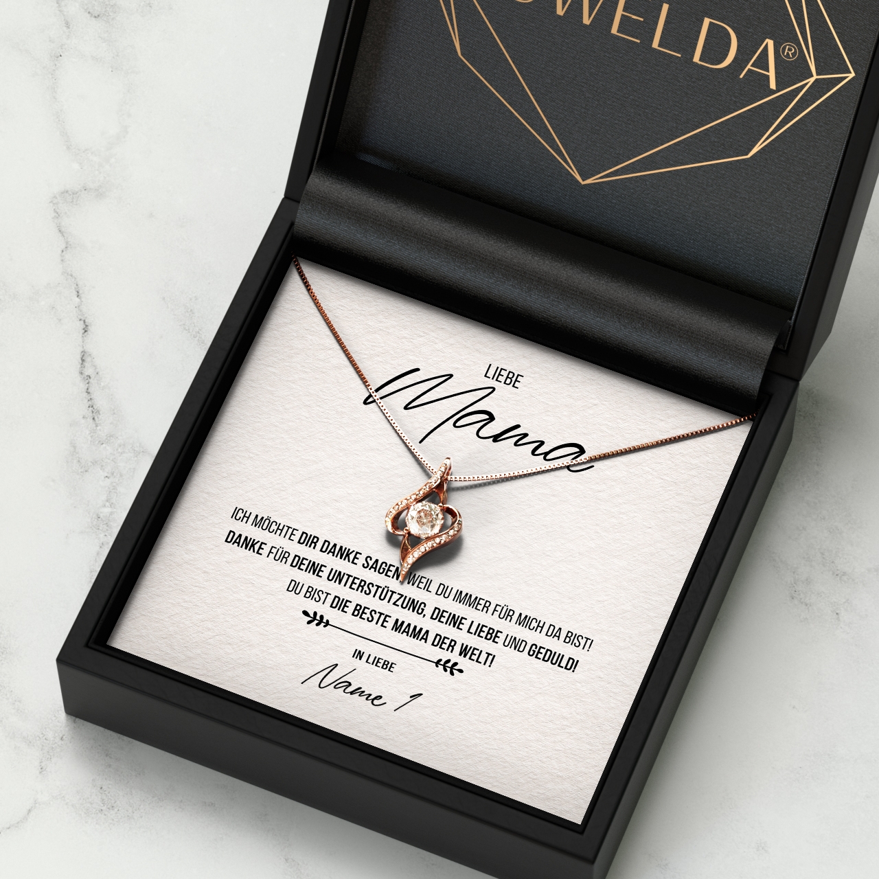 Wir liefern Dir eine hochwertige Halskette aus echtem 925 Sterling Silber in den Farben Silber, Gelbgold oder Rosegold. Außerdem legen wir Deine personalisierte Karte zusammen mit der Halskette in eine exklusive Schmuckbox aus Kunstleder. Um Deiner Mutter eine wirklich große Freude bereiten zu können, legen wir eine schöne Geschenktasche in Dein Paket. Damit hast Du die Möglichkeit, Dein sehr persönliches Geschenk sofort nach Erhalt Deiner Bestellung an Deine geliebte Mama zu übergeben.