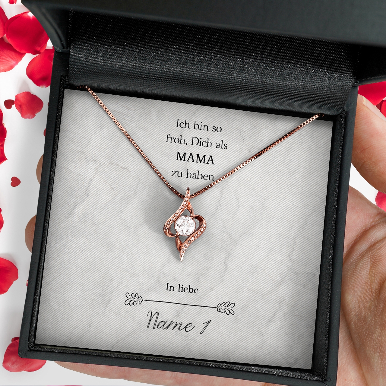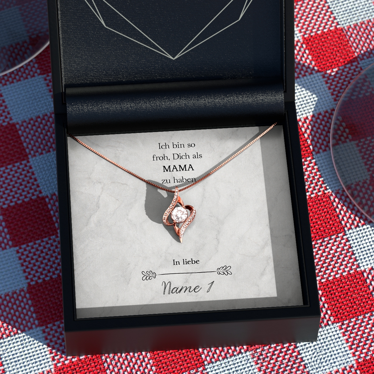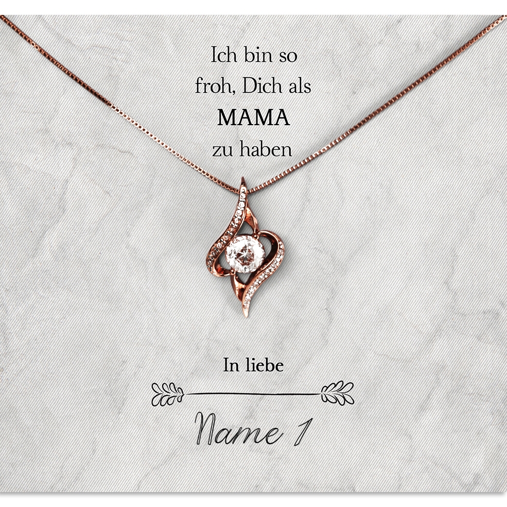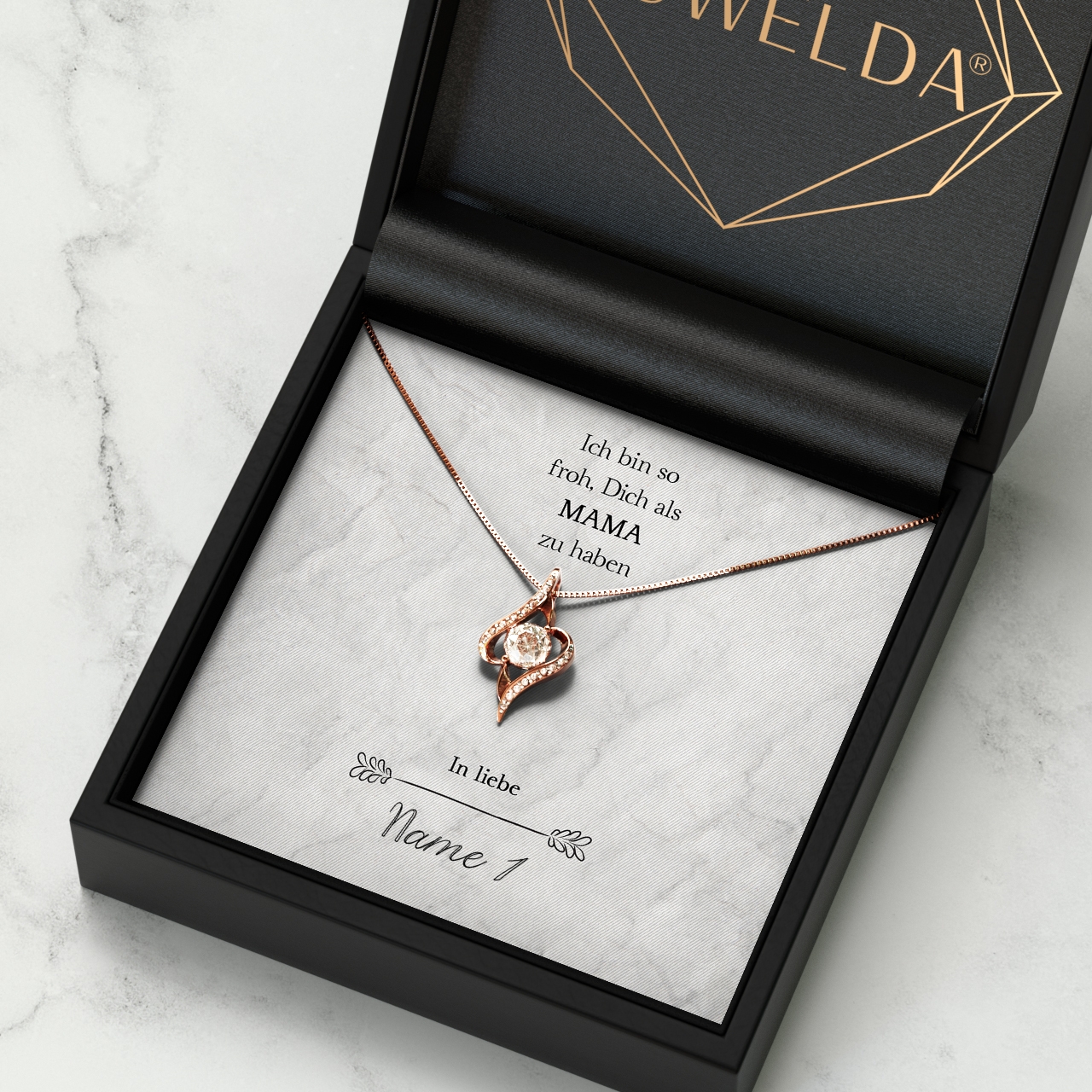 Wir stellen Deine Karte ganz individuell und nur für Dich mit Deinen Wunschnamen her. Zusammen mit der hochwertigen Halskette aus 925 Sterling Silber und der edlen Schmuckbox erhältst Du das perfekte Geschenk, welches Deine Mutter zu Tränen rühren kann. Um das Geschenk sofort an Deine Mama überreichen zu können, legen wir eine gratis Geschenktasche zu jeder Bestellung in das Paket.
