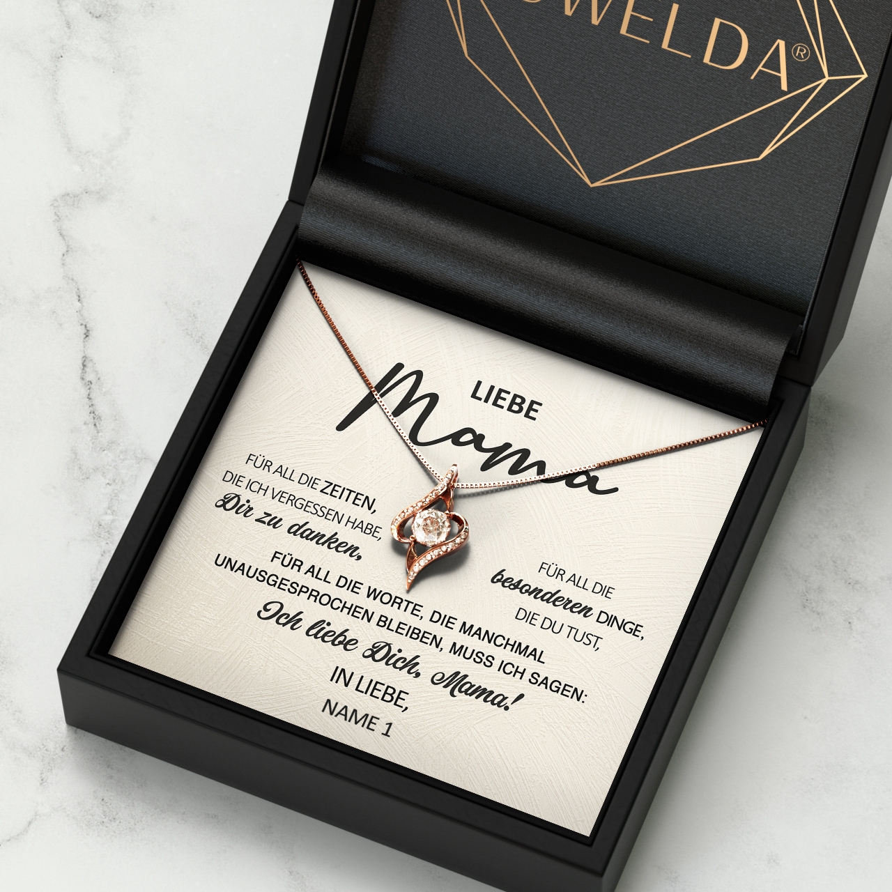 Wir legen die Halskette Deiner Wahl und die personalisierte Karte in eine exklusive Schmuckbox aus Kunstleder mit Samt-Inneneinlage. Damit Du das Geschenk sofort verschenken kannst, verpacken wir Dir alles behutsam in einer hochwertigen Geschenktasche und hüllen diese in Seidenpapier mit einer Geschenkschleife ein. Du erhältst Dein Paket innerhalb von 2-3 Werktagen.