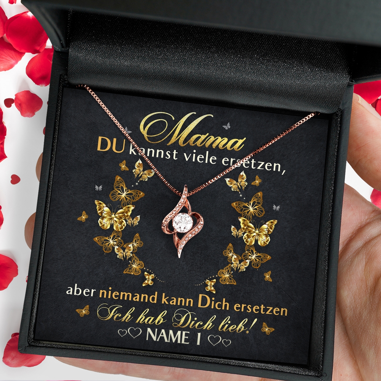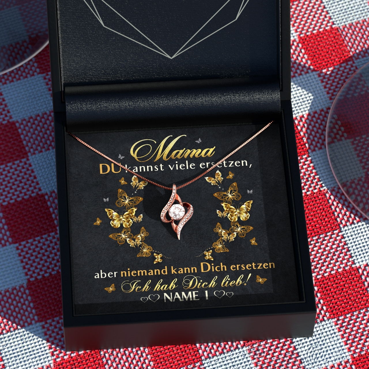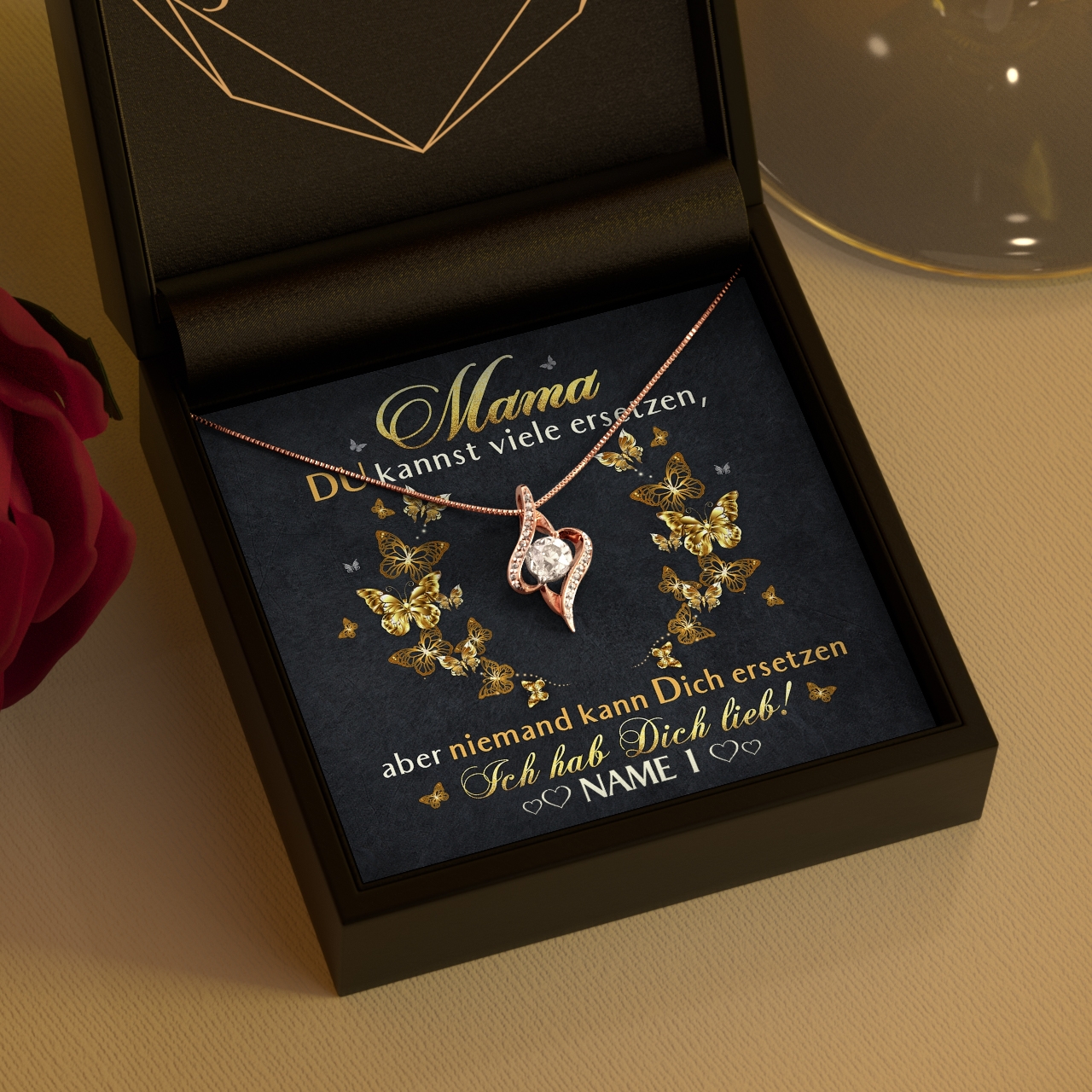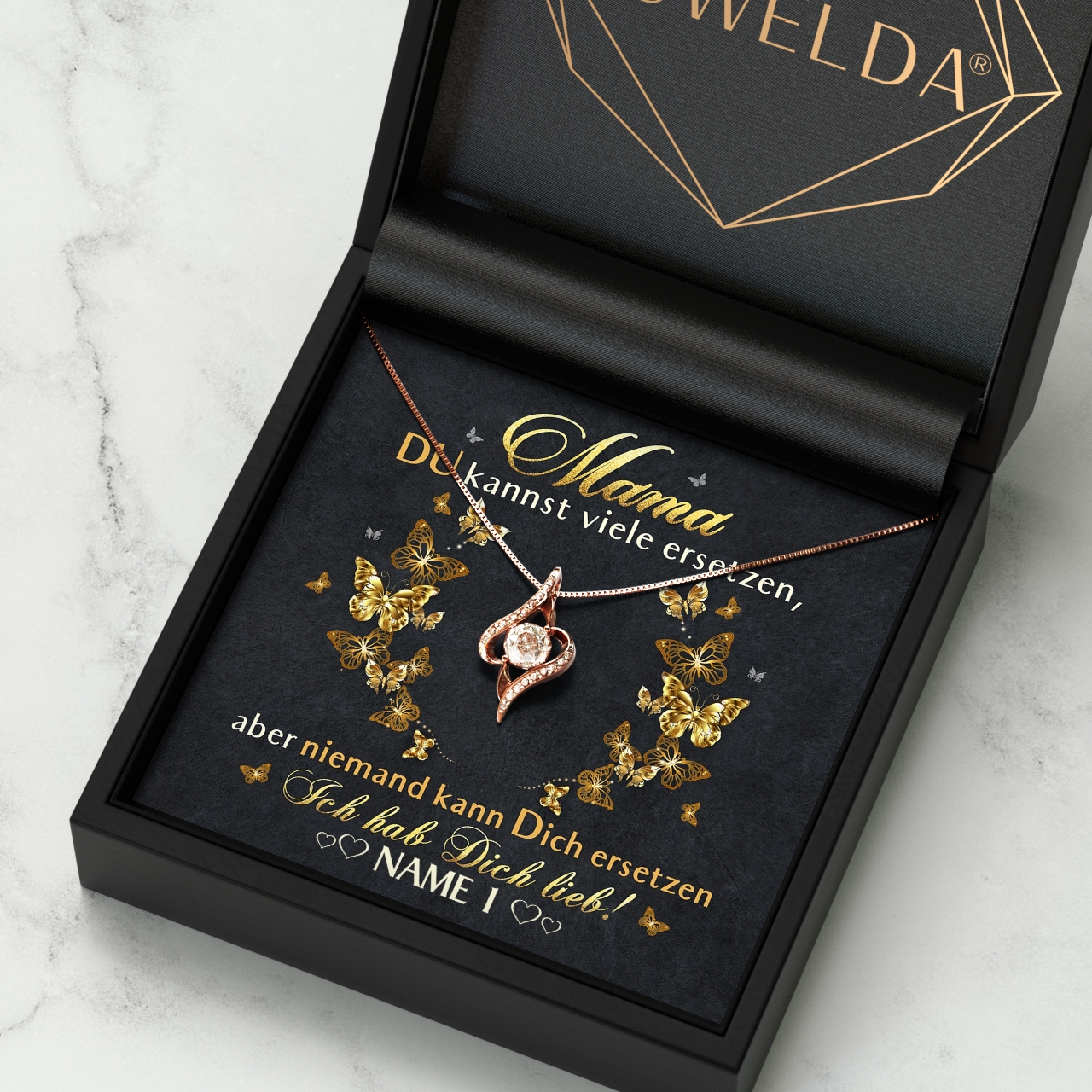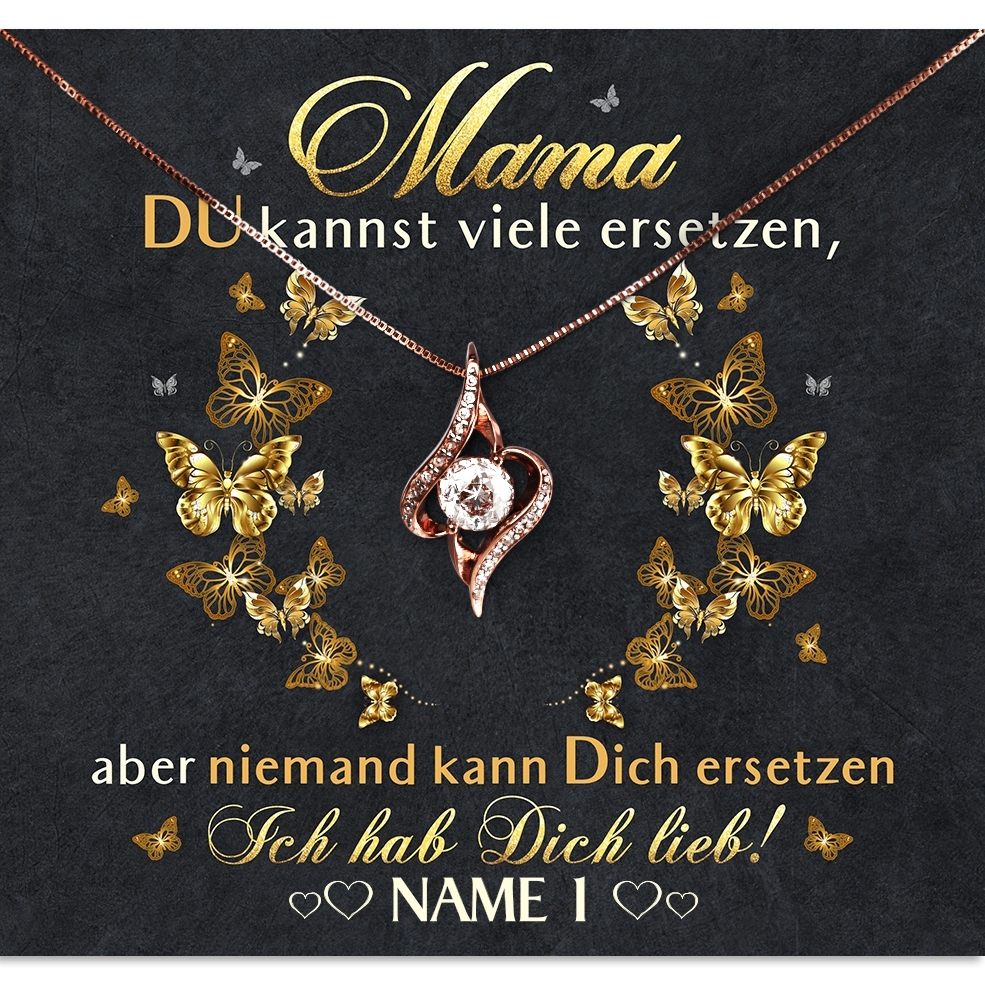 Der Muttertag steht vor der Tür und in diesem Jahr möchtest Du Deine Mama mit einem sehr besonderen Geschenk überraschen? Die schönen Geschenkboxen mit personalisierbarer Grußkarte und einem eleganten Schmuckstück aus unserer Kollektion sind da genau passend. Denn Du kannst Deiner Mama ganz einfach sagen, wie wichtig sie für Dich ist. Die Karte ist in Schwarz und Gold gehalten und mit hübschen Schmetterlingen verziert. Der herzliche Spruch wird Mama ein Lächeln ins Gesicht zaubern.