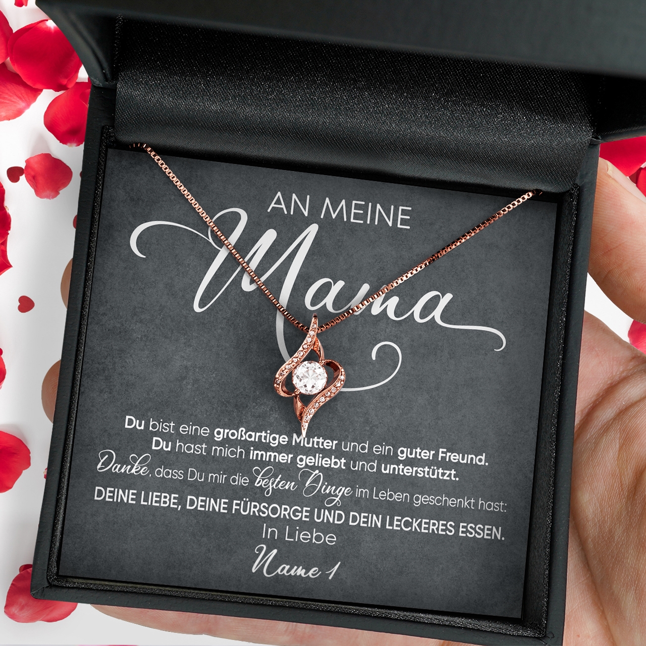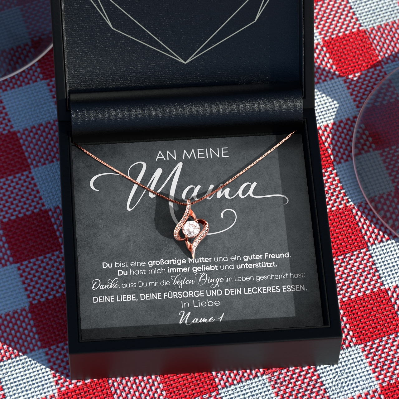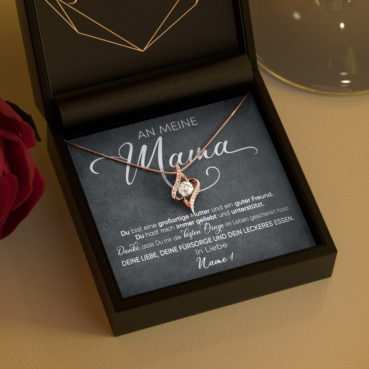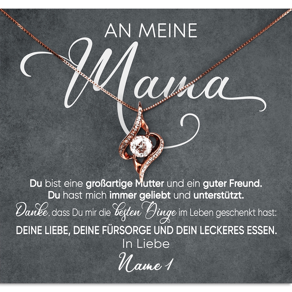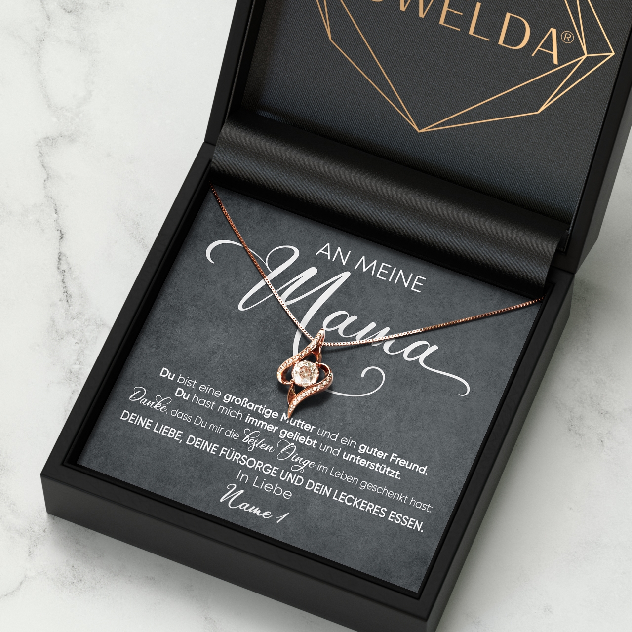 In unserer kleinen Schmuckmanufaktur im schönen Westerwald wird Dein individuelles Geschenk von Hand verpackt. Dabei legen wir die funkelnde Halskette und die personalisierte Karte in eine hochwertige Schmuckbox und platzieren diese in einer schönen Geschenktüte. Somit kannst Du Dein Geschenk sofort an Deine Mama übergeben und Dir Ihre Reaktion anschauen.