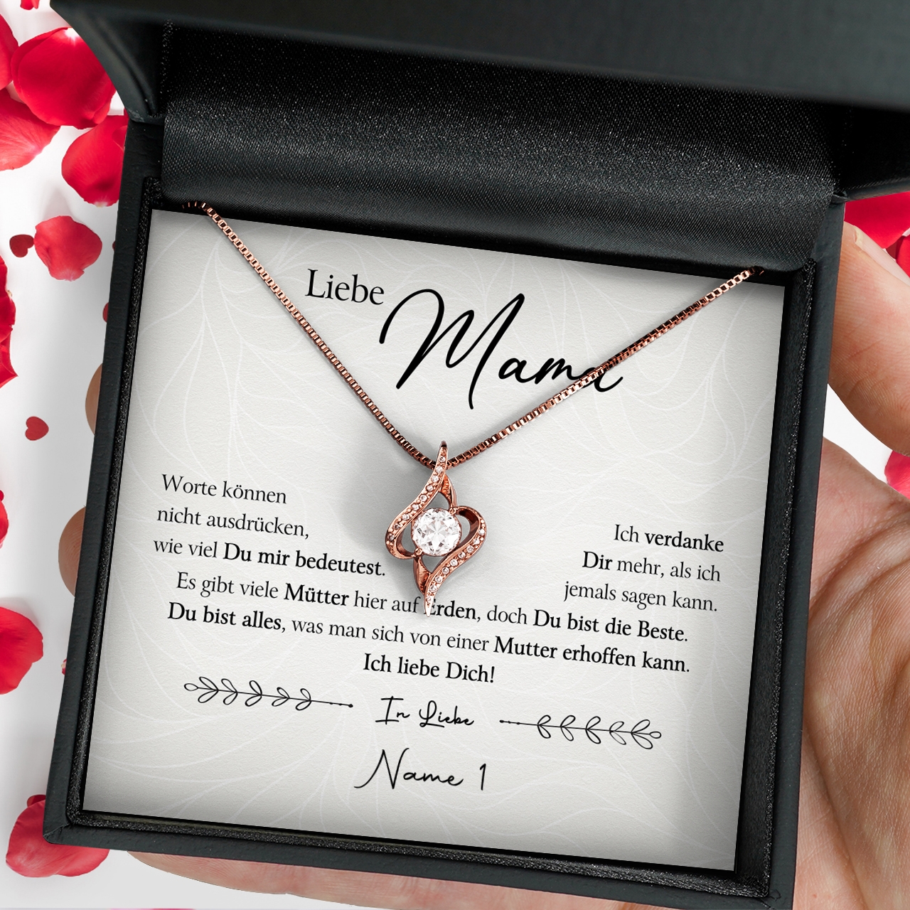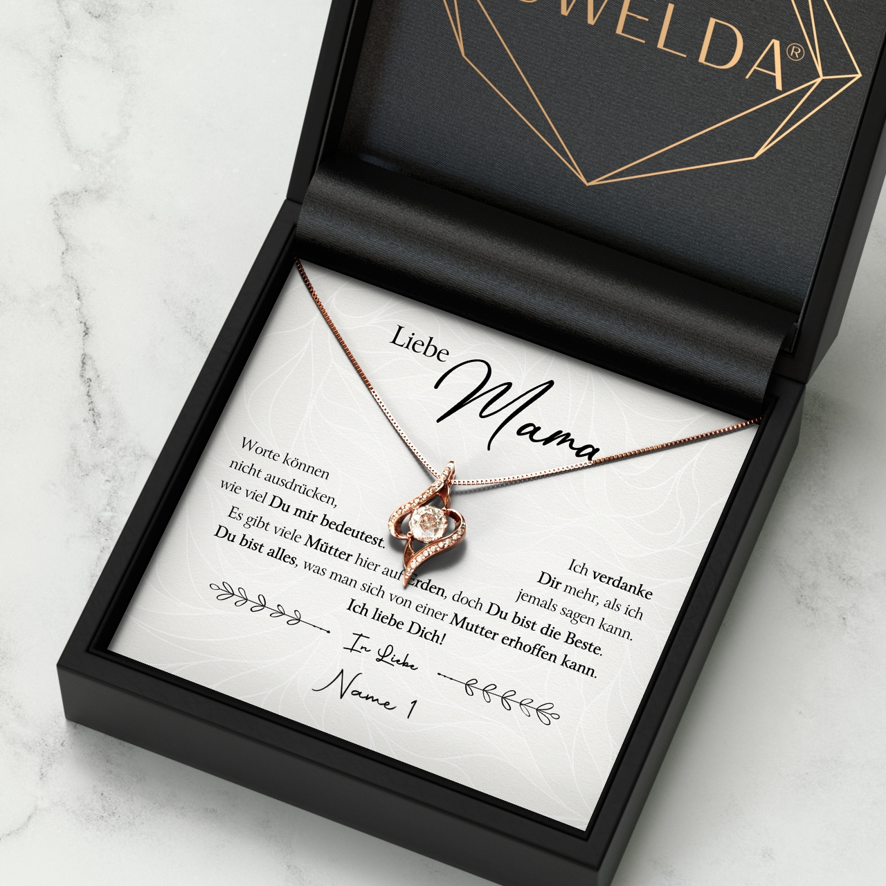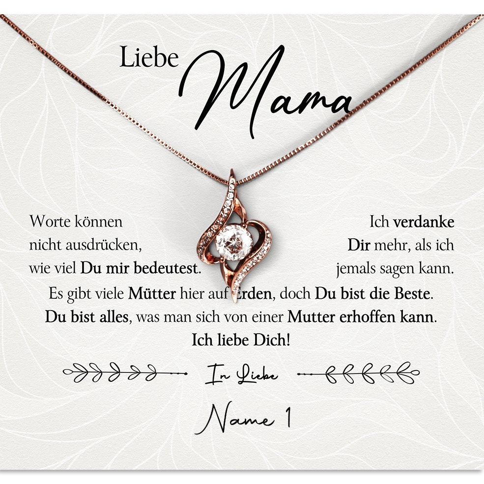 Für jede Situation, in der Du einen Rat brauchst, hat Deine Mutter die richtigen Worte für Dich. Du bist Dir nicht sicher, wie Du Dich für diese Hilfe bedanken sollst und suchst noch nach einem passenden Geschenk? Mit unserer personalisierbaren Karte „Liebevolle Mutter“ kannst Du Dich für all die Ratschläge bei der besten Mutter der Welt bedanken. Du musst Dich nur für eine unserer wunderschönen Halsketten mit Anhänger aus 925 Sterling Silber entscheiden und Deinen Namen in das dafür vorgesehene Feld eintragen. Schon kannst Du Dir eine Live-Vorschau generieren und Dein perfektes Geschenk anschauen.