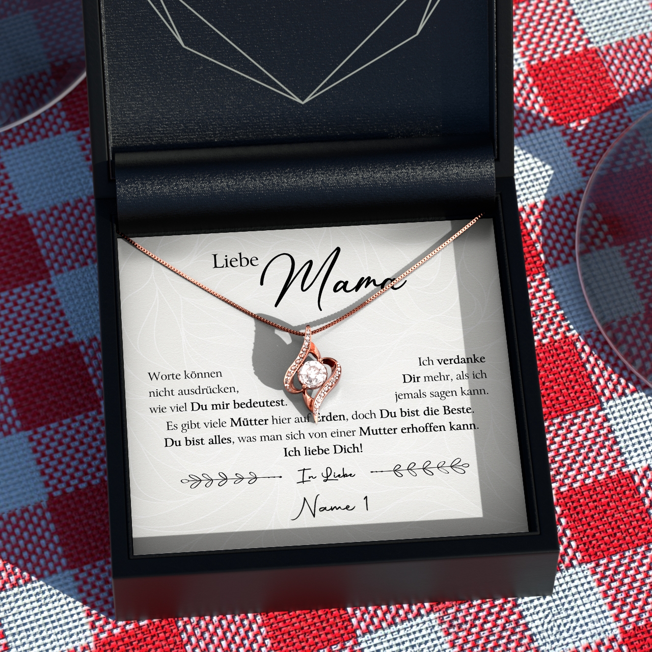 Wir liefern Dir eine hochwertige Halskette in Silber, Gold oder Roségold mit Deiner individualisierten Karte in einer exklusiven Schmuckbox aus Kunstleder mit Samt-Innenbezug. Das Highlight ist die gratis Geschenktasche, mit der Du Dein ganz persönliches Geschenk sofort an Deine Mama übergeben kannst. Freu Dich auf den Moment, an dem Deine Mutter das Geschenk öffnet und Du die Freude in Ihrem Gesicht siehst.