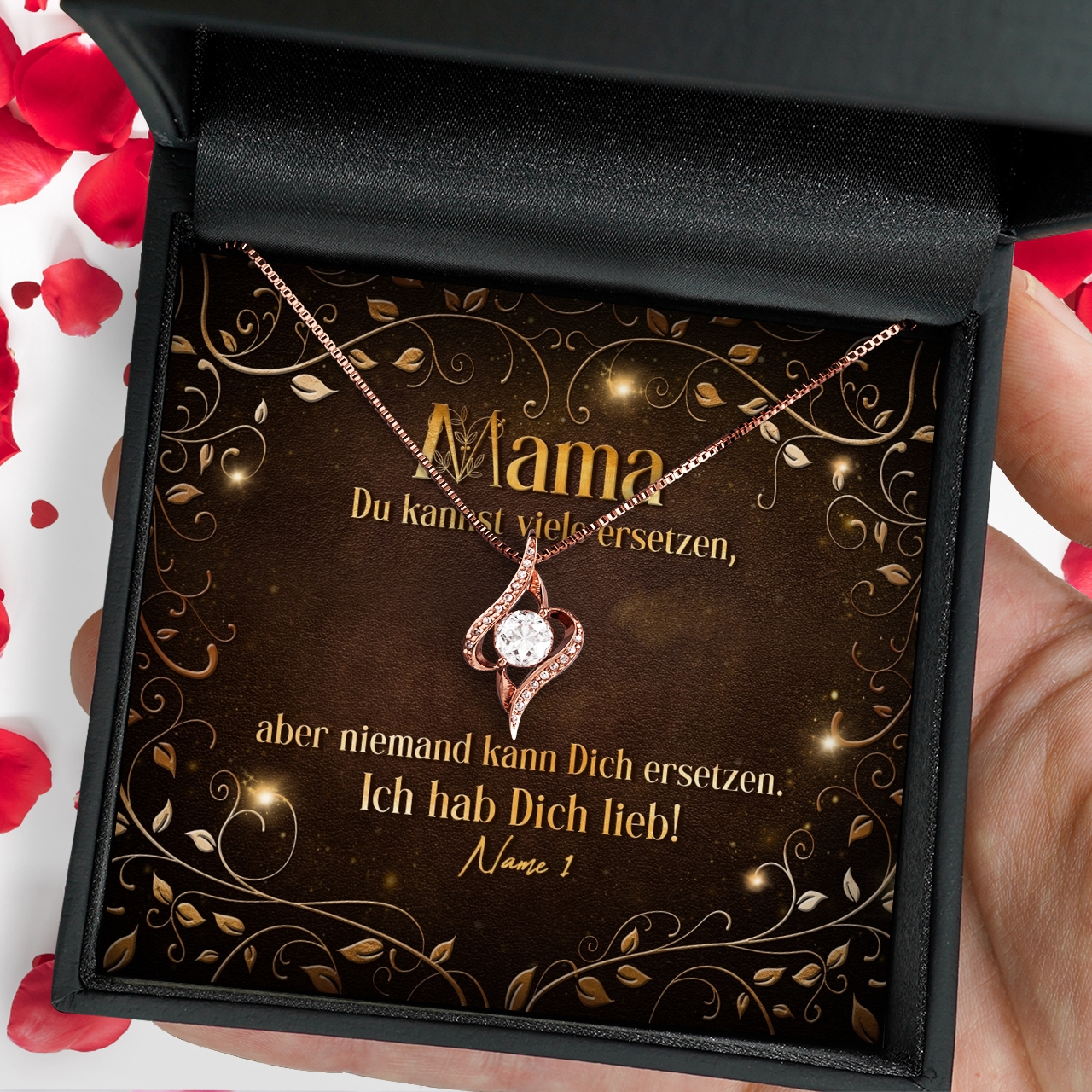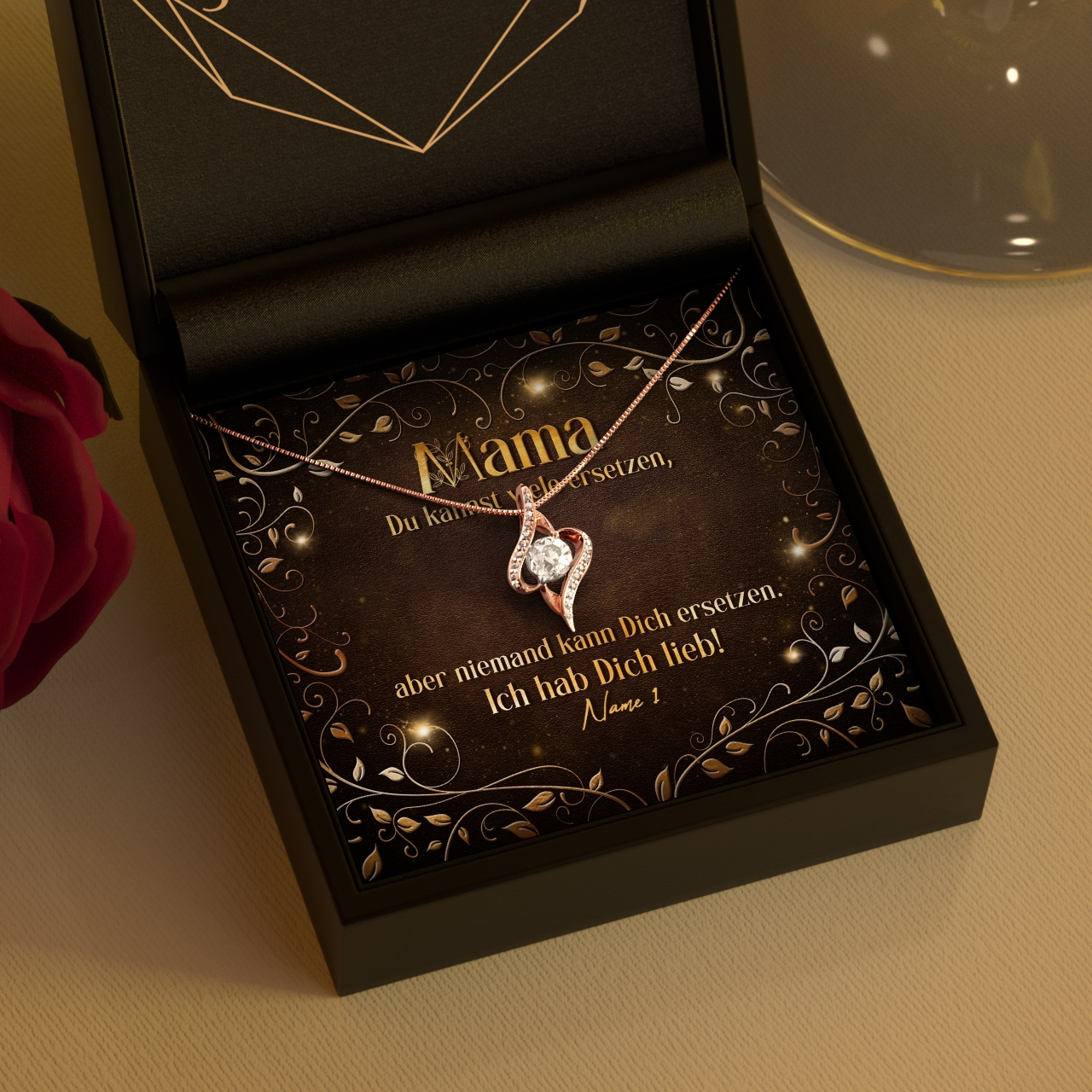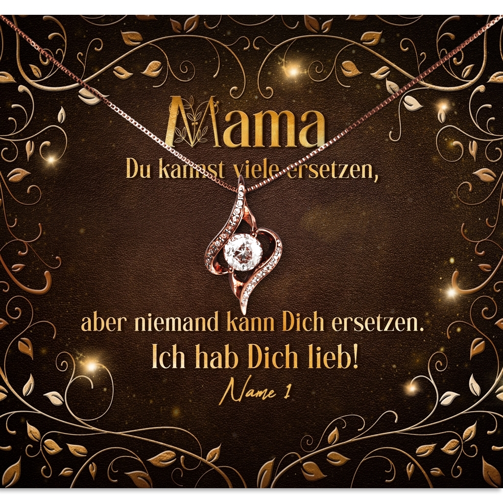 Deine Mama hat nur das Beste verdient? Eine individuelle Schmuckbox mit einzigartigem Schmuckstück und einer personalisierbaren Grußkarte ist dann genau passend. Denn das Kartendesign „Mama ist unersetzbar“, wird Deine Mami bestimmt zu Tränen rühren. Das hübsche Design mit den stilisierten Ranken und dem schönen Spruch ist einfach unvergleichlich. Die Karte lässt sich mit einem oder mehreren Namen personalisieren.
