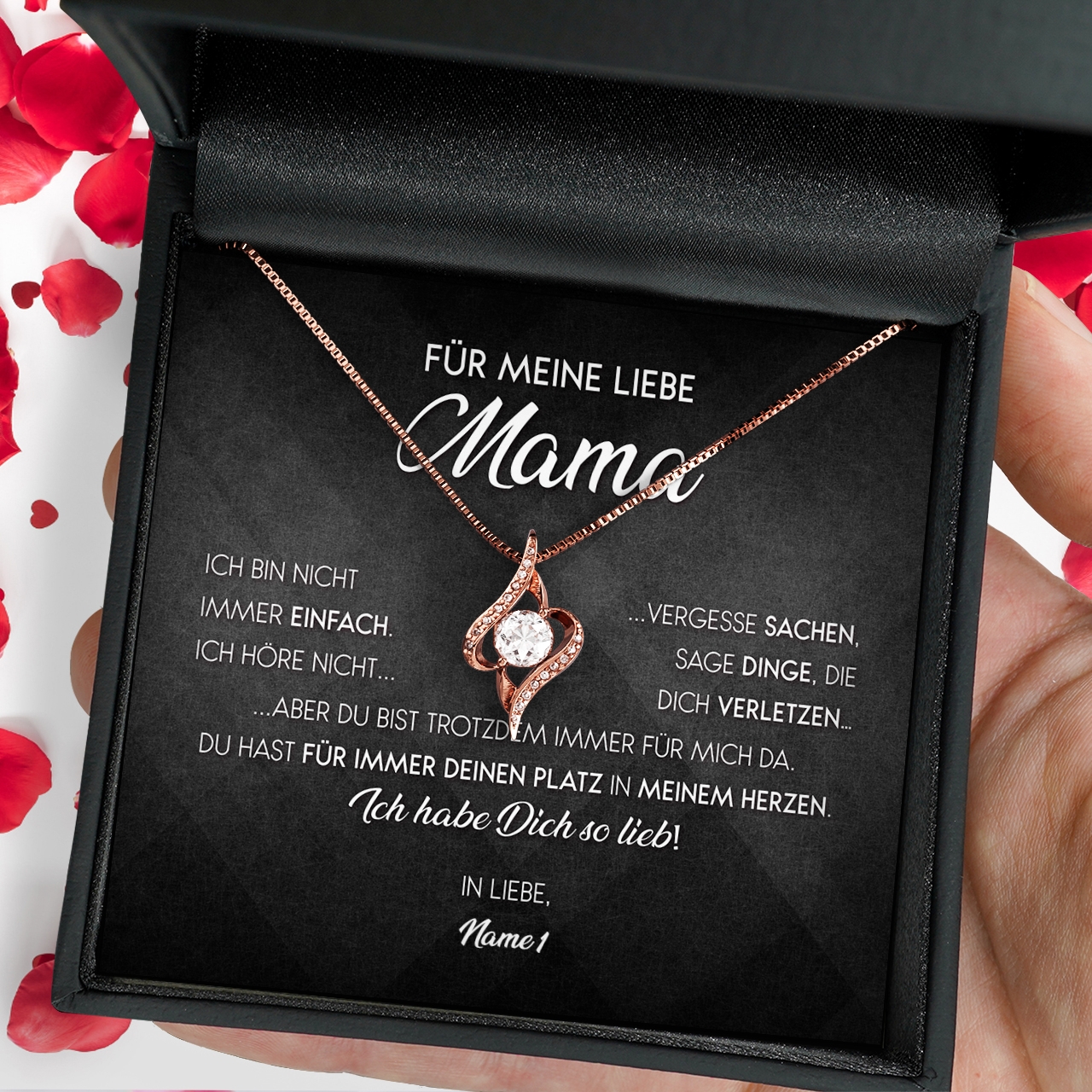 Damit das Geschenk auch wirklich gut ankommt, legen wir die Halskette und die Karte in eine exklusive Schmuckbox aus Kunstleder. Zusammen mit einer hochwertigen Geschenktüte wird Dein Geschenk mit Seidenpapier umwickelt und mit einer schönen Schleife verziert. Innerhalb von 2-3 Werktagen erhältst Du Dein Geschenk und kannst dieses sofort verschenken. Damit bereitest Du Deiner Mutter ganz bestimmt einen unvergesslichen Tag mit viel Freude und Begeisterung.