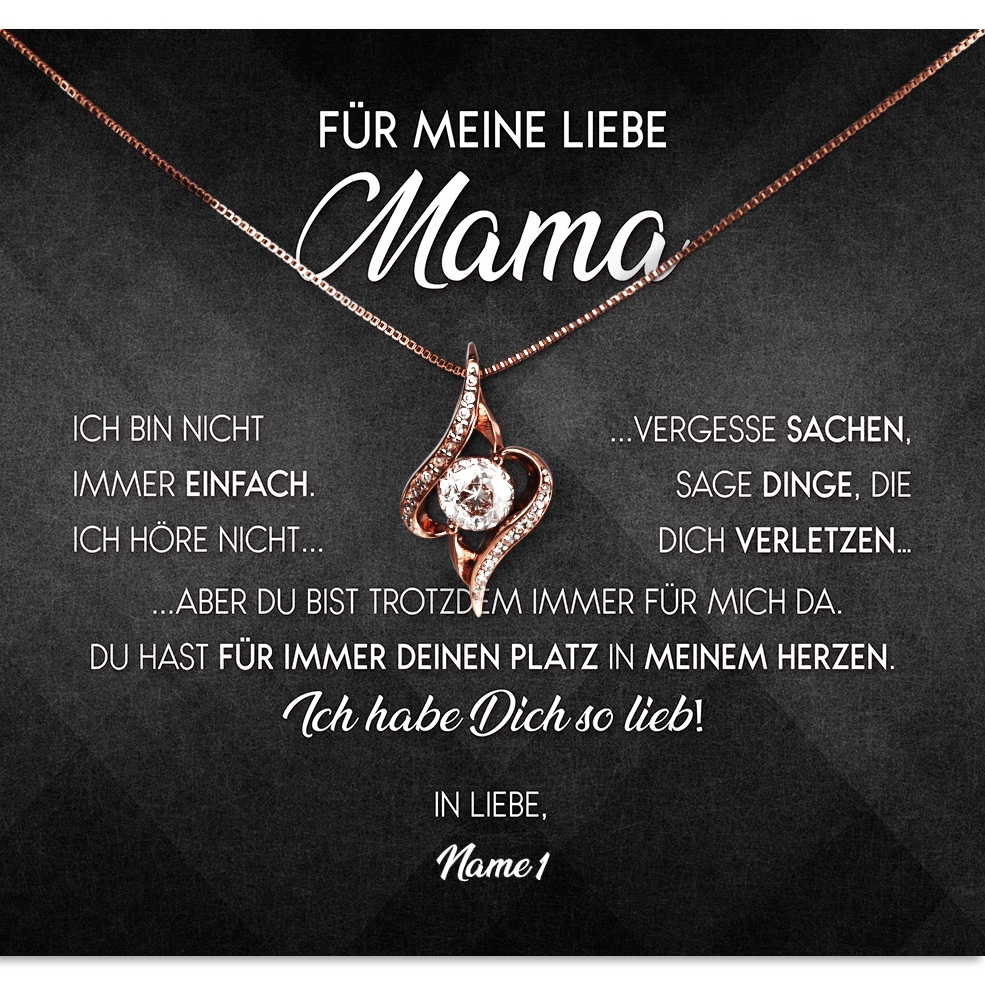Du möchtest, dass Deine Mama vor Freude strahlt und sich riesig freut? Dann überrasche Sie mit einer eleganten Halskette und der personalisierten Karte „Nicht immer einfach“. Du musst nur Deine Wunschnamen in das Personalisierungsfeld eintragen und kannst Deine ganz persönliche Karte mit Deinem ausgewählten Spruch in der Live-Vorschau betrachten. Gefällt Dir die Live-Vorschau? Dann musst Du nur Deine gewünschte Zahlungsmethode wählen und auf „Jetzt Kaufen“ klicken. Während Du Dich entspannt zurücklehnen kannst, übernehmen wir die Arbeit und fertigen Dein individuelles Geschenk für Dich an.