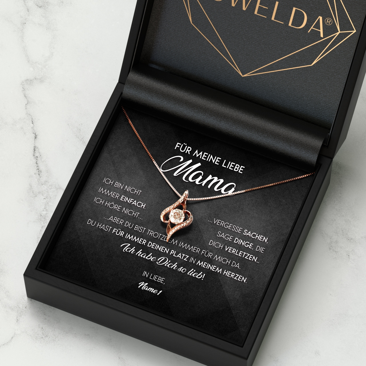 Möchtest Du Dein Geschenk sofort an Deinen Lieblingsmenschen überreichen? Dann solltest Du ein Blick auf die Variante mit der premium Geschenkverpackung werfen. Die Halskette Deiner Wahl und Deine personalisierte Karte werden liebevoll in eine hochwertige Schmuckbox mit Kunstlederüberzug und Samt-Innenbezug gelegt. Damit die Überraschung auch wirklich gut ankommt, wird alles behutsam in eine Geschenktasche gelegt, in Seidenpapier verpackt und mit einer Schleife zugebunden. Hier bekommst Du bereits einen kleinen Vorgeschmack: