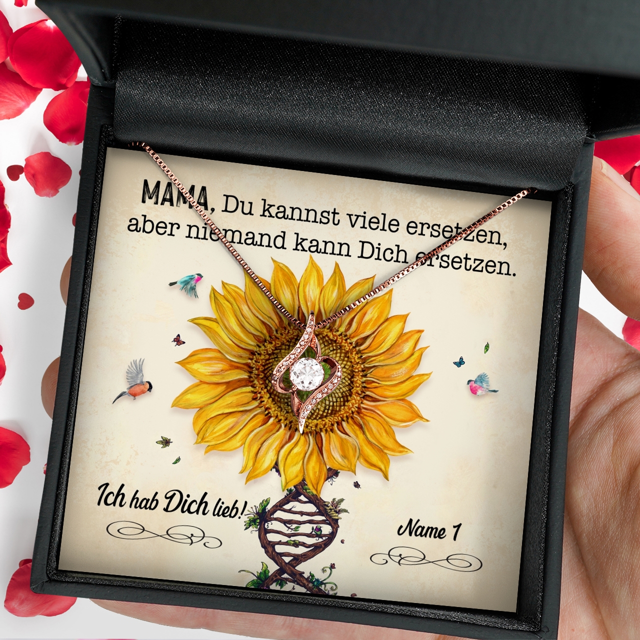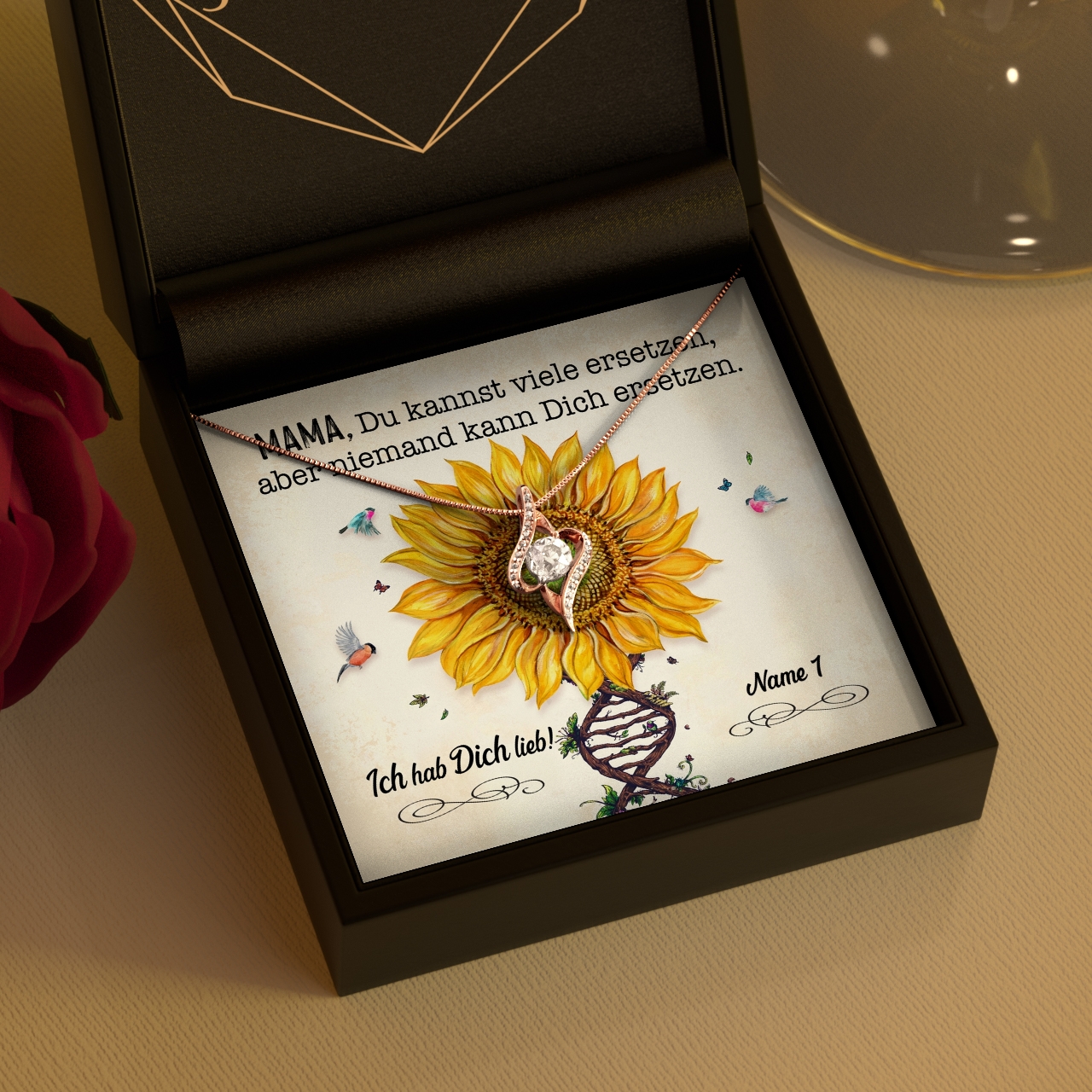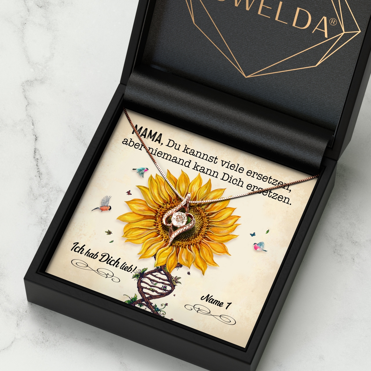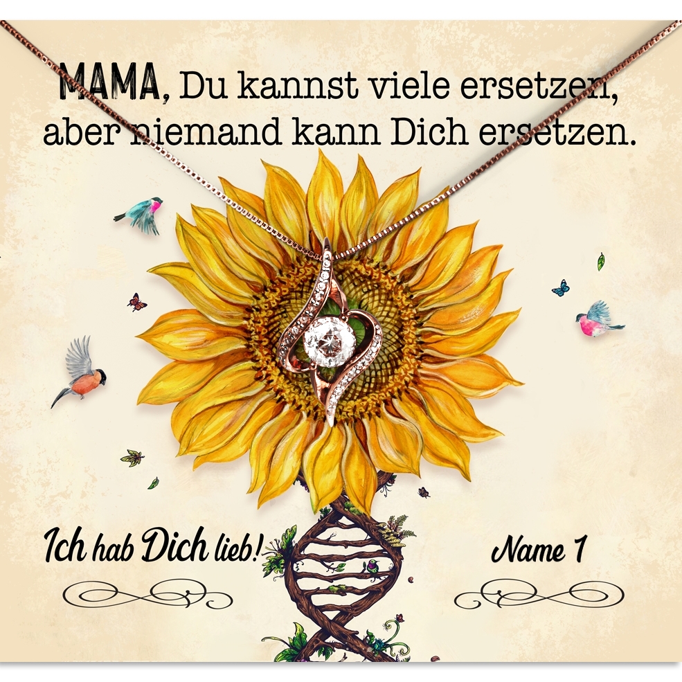 Du möchtest in diesem Jahr für den Muttertag mehr als nur einen Strauß Blumen überreichen. Dann entscheide Dich für eines unserer wunderbaren Schmuckstücke und diese herzliche, personalisierbare Grußkarte. Die große Sonnenblume in der Kartenmitte bringt sofort gute Laune. Die schönen Worte machen deutlich, dass Deine Mama nur das Beste verdient hat. Das Kartendesign kann mit Deinem Namen und den Namen von den Geschwistern individuell angepasst werden.