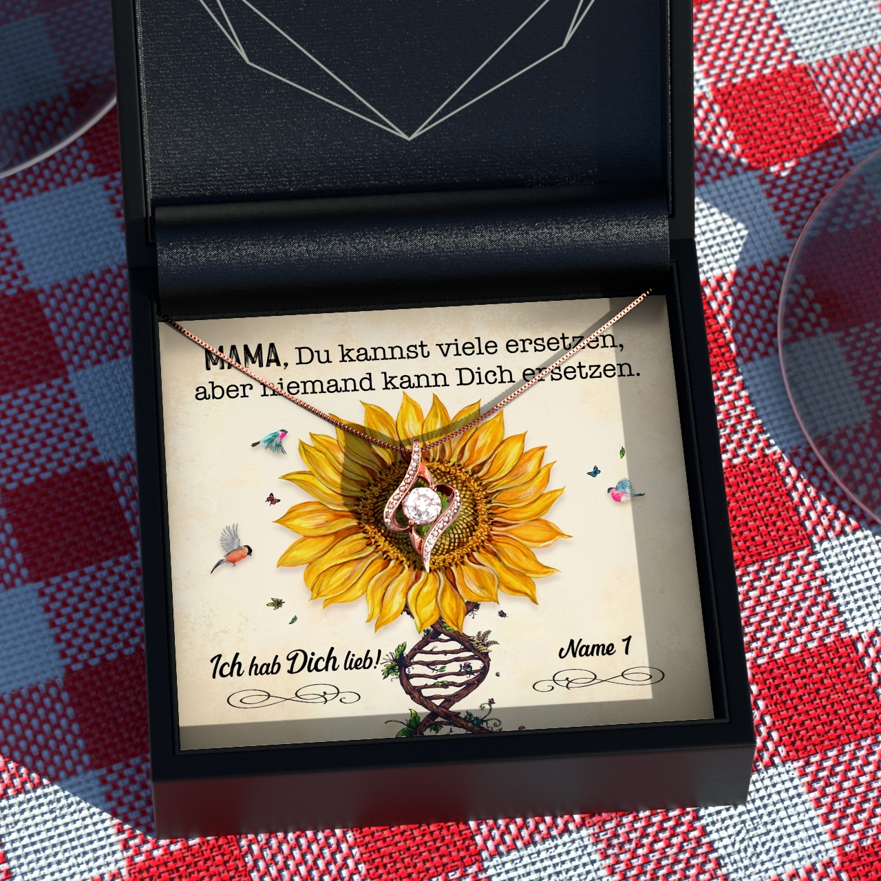 Schau Dir das finale Design in der Live-Vorschau an und gibt mit nur wenigen Klicks Deine Bestellung auf. Sobald Deine Bestellung bei uns eingegangen ist, beginnen wir mit der Produktion. Die elegante Geschenkbox wird per Hand befüllt. Dafür legen wir feines Seidenpapier um die personalisierte Karte und das Schmuckgeschenk bei. Die Box ist aus Kunstleder gefertigt und innen mit feinstem Samt ausgelegt. Wir geben mit Deiner Bestellung auch eine hübsche Geschenktasche. So kannst Du das persönliche und von Herzen kommende Geschenk direkt an Mama überreichen.