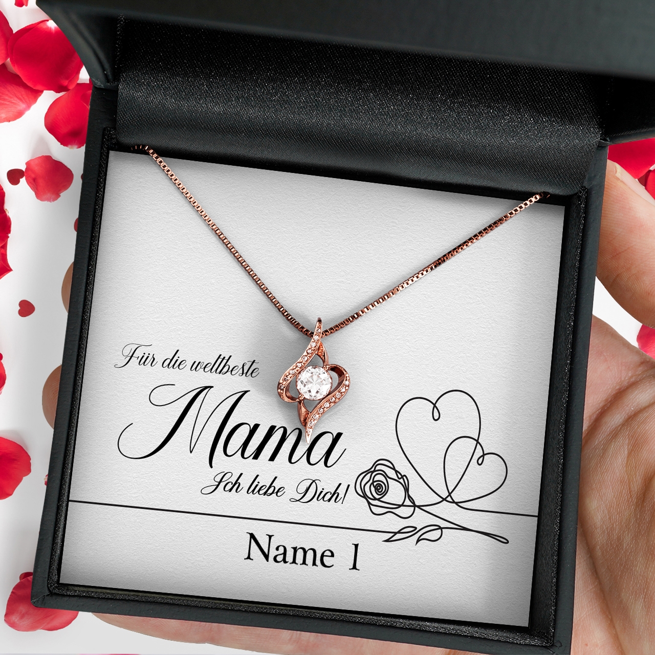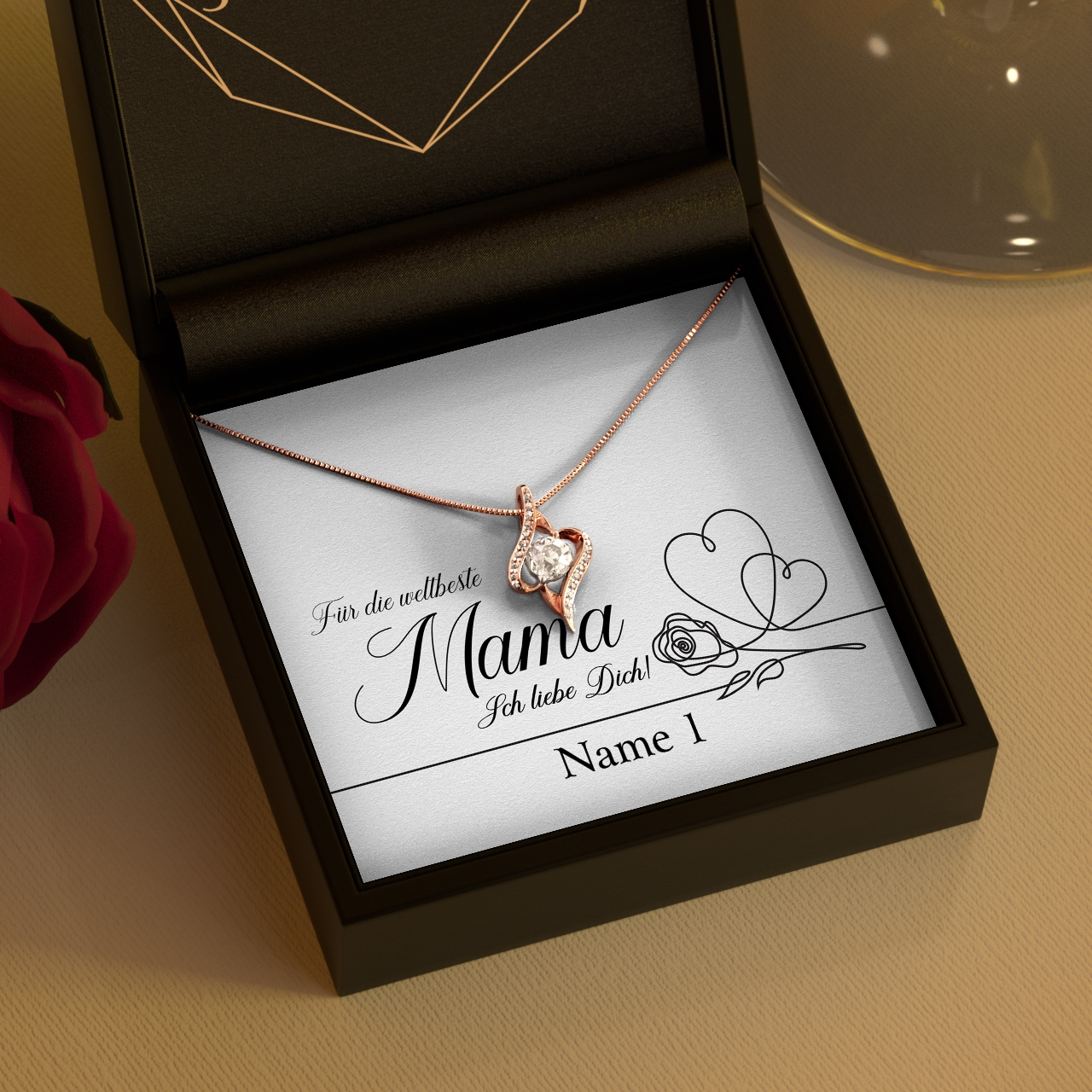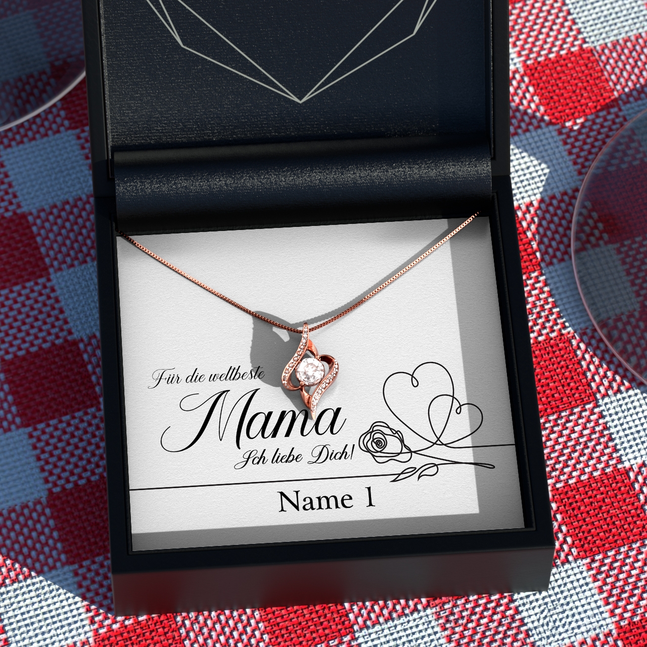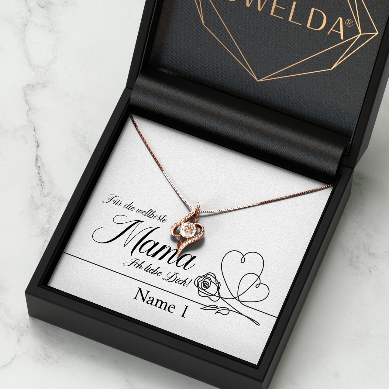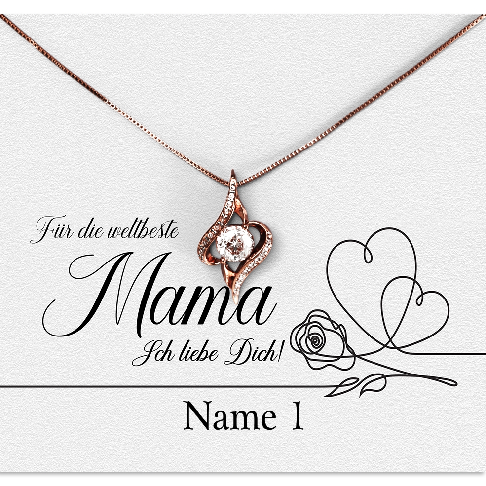 Deine Mutter ist die beste Mama auf der ganzen Welt? Du bist wieder auf der Suche nach einem passenden Geschenk und bist Dir nicht sicher, was Du Deiner Mama schenken sollst? Mit einer eleganten Halskette und der personalisierten Karte „Weltbeste Mama“ überreichst Du Deiner Mama ein Geschenk, welches sie sich mehr als verdient hat. Die Karte überzeugt mit ihren liebevollen Details und Deinem ganz persönlichen Namen. Möchtest Du das Geschenk mit Deinen Geschwistern verschenken? Kein Problem! Du kannst die Anzahl der Namen auswählen, Deine Wunschnamen eintragen und anschließend Deine personalisierte Karte in der Live-Vorschau betrachten.
