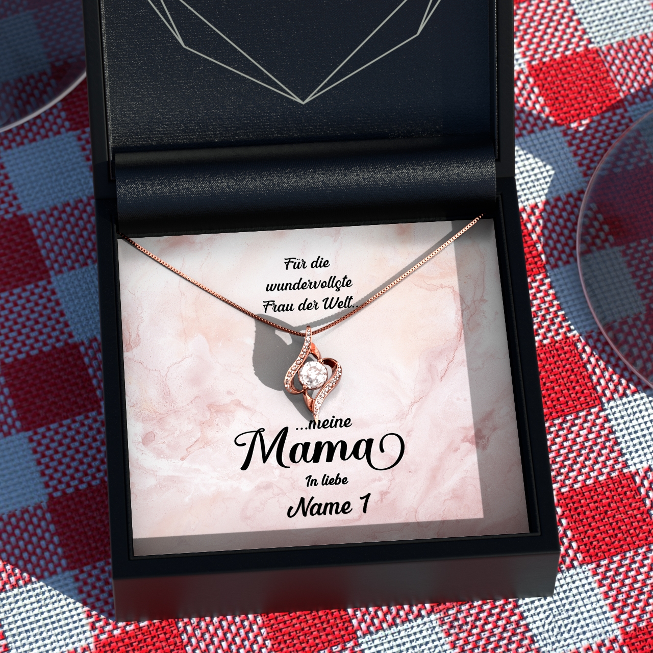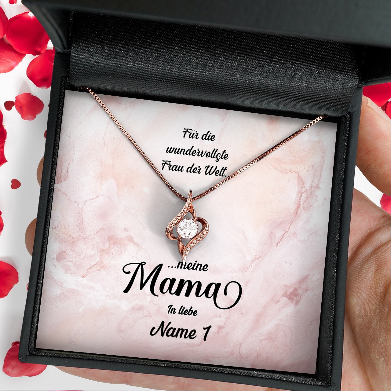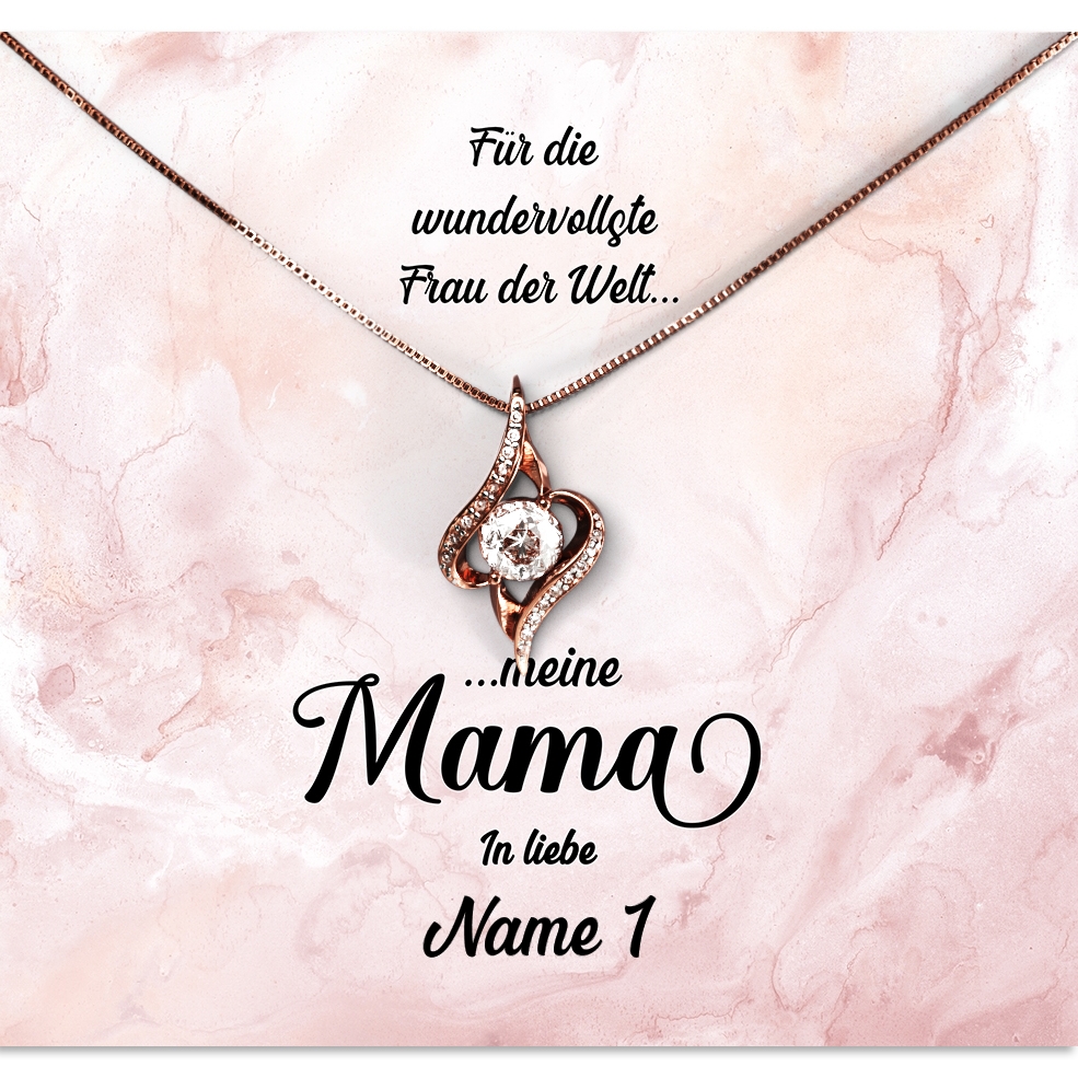 Liebe schenken, ohne etwas dafür zu verlangen – das ist die bedingungslose Liebe der Mutter zu ihrem Kind. Hat auch Deine Mutter Dich immer bedingungslos geliebt? Dann kannst Du Dich mit unserer personalisierten Karte „Wundervolle Mutter“ bei Deiner Mama bedanken und ihr ein schönes und sehr persönliches Geschenk überreichen. Im Geschenkset ist eine funkelnde Halskette aus 925 Sterling Silber mit kristallklaren 5A Zirkonia und eine personalisierte Karte mit einem emotionalen Spruch enthalten. Um die Karte zu personalisieren, musst Du nur Deinen Namen in das Personalisierungsfeld eintragen. Anschließend kannst Du Dir eine Live-Vorschau Deiner individuellen Karte generieren und Dich vom Ergebnis überzeugen.