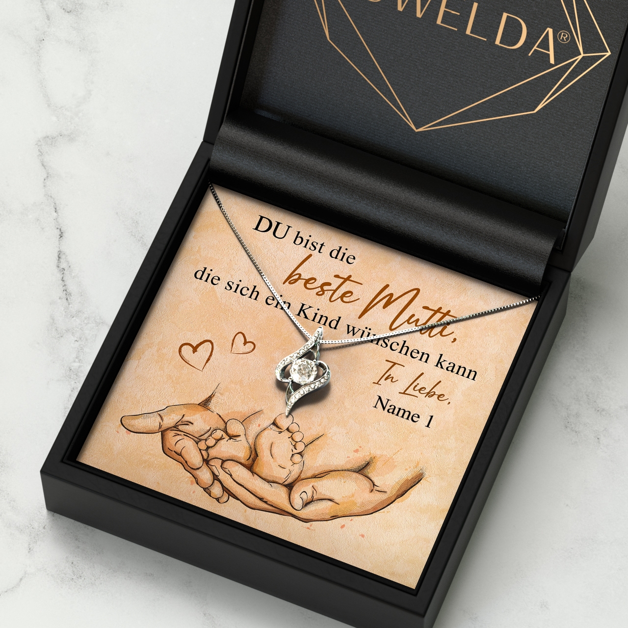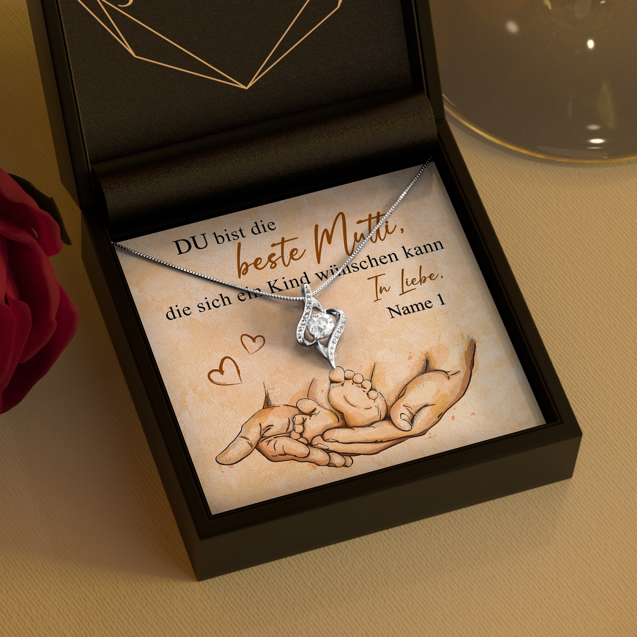 Ob Du Deine Mama überraschen möchtest oder Du der Mama Deines Kindes zum ersten Muttertag ein Geschenk überreichen willst, die Schmuckbox mit der „Beste Mutti der Welt“-Grußkarte ist ein absolutes Highlight. Das schöne Design zeigt eine hübsche Zeichnung und findet genau die richtigen Worte für die Mama. Auf der Karte können ein oder mehrere Namen personalisiert werden. So ist das Schmuckgeschenk garantiert einzigartig.