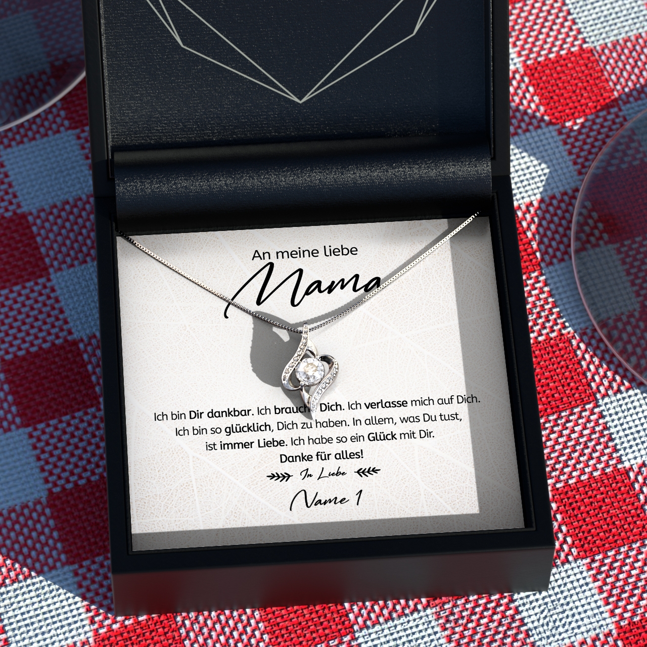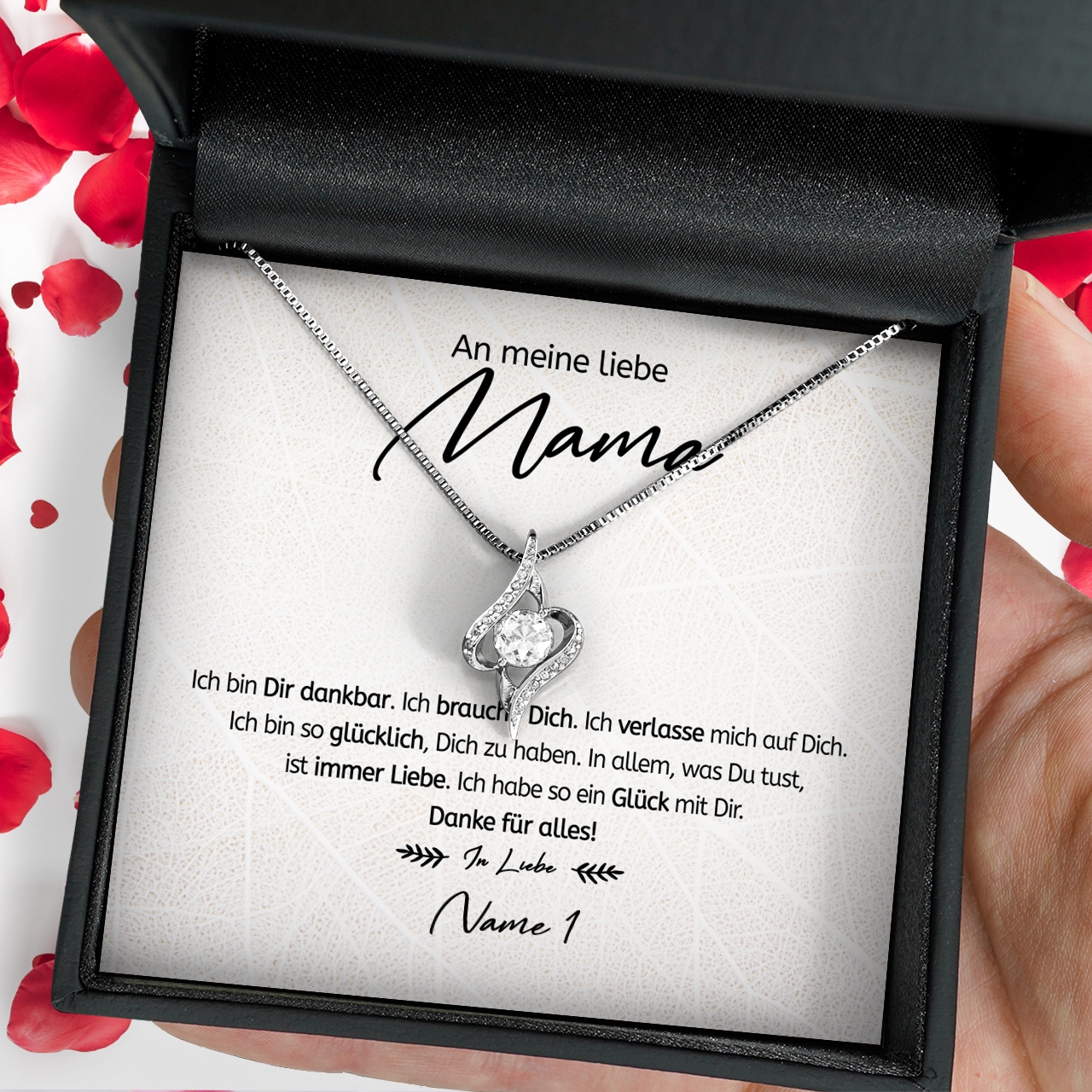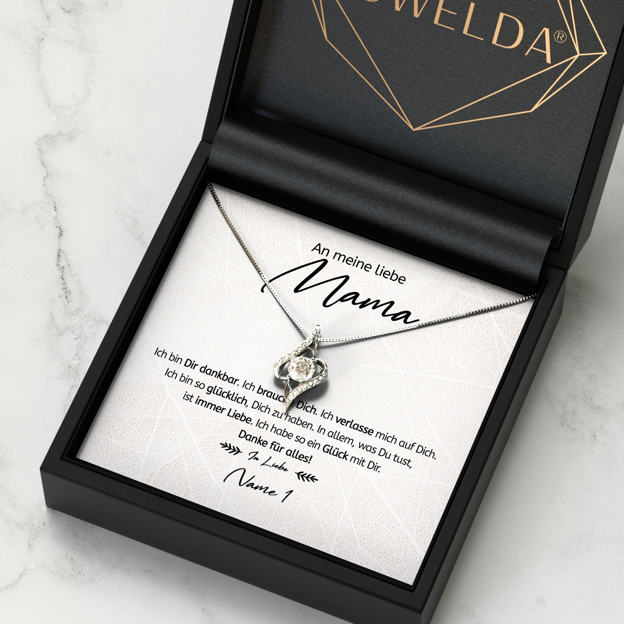 Es ist immer ein ganz tolles Gefühl, einem geliebten Menschen eine Überraschung zu überreichen. Wenn es sich bei diesem Menschen um die eigene Mutter handelt, ist die Freude umso größer. Denn niemand hat es mehr verdient beschenkt zu werden als Mama. Sie hat Dich aufgezogen und viel Zeit mit Dir verbracht. Bist Du ihr dafür dankbar und brauchst noch ein Geschenk zum Muttertag, Geburtstag oder zu Weihnachten? Das Geschenkset von Juwelda „Danke für immer“ besteht aus einer wunderschönen Halskette mit kristallklaren 5A Zirkonia und einer personalisierten Karte. Du kannst bis zu 7 Namen auf der Karte verewigen lassen. Damit kannst Du das ideale Geschenk von Dir und Deinen Geschwistern kreieren.