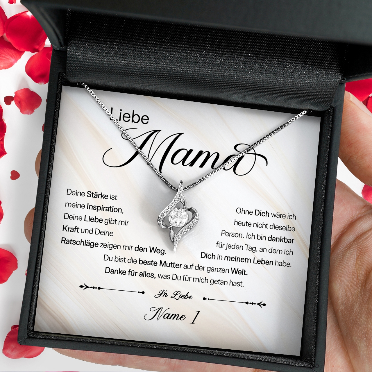 Jede Mutter ist auf ihre eigene Art und Weise einzigartig. In einem Punkt sind aber alle gleich: Sie lieben ihre Kinder, spenden Kraft und haben immer den richtigen Ratschlag. Mit unserer personalisierten Karte „Deine Stärke“ kannst Du Deiner Mama Deine Dankbarkeit zeigen. Du musst Dich nur für eine Halskette Deiner Wahl in den Farben Silber, Gold oder Roségold entscheiden und Deinen Namen in das Personalisierungsfeld eintragen. Anschließend siehst Du in der Live-Vorschau, wie Dein persönliches Geschenk aussehen wird.