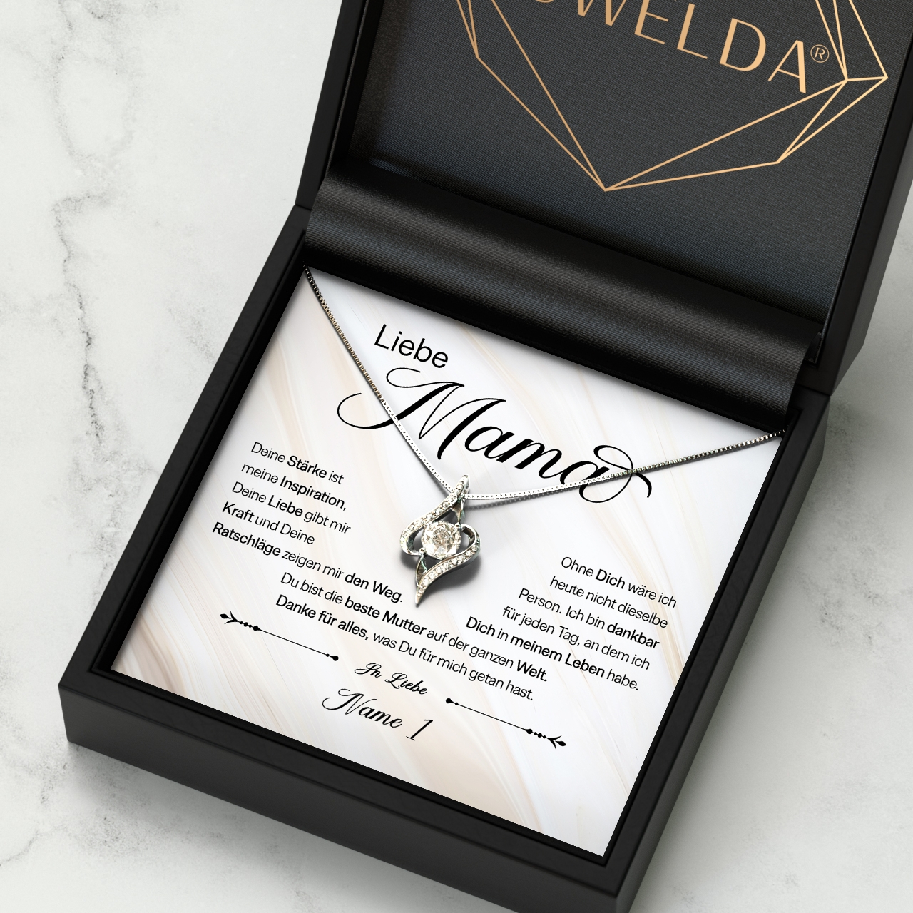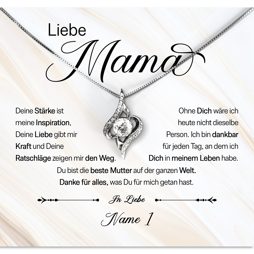 Die personalisierte Karte mit Deinen Wunschnamen ist ein wahres Unikat, denn wir stellen die Karte genau nach Deinen Vorgaben und nur für Dich her. Somit erhältst Du ein Präsent, dass so besonders ist wie Deine Mutter. Damit das Geschenk auch wirklich gut ankommt, legen wir die funkelnde Halskette und die Karte in eine hochwertige Schmuckbox aus Kunstleder. Zusätzlich erhältst Du von uns eine Geschenktüte, damit Du das Geschenk sofort an Deine Mama überreichen kannst.
