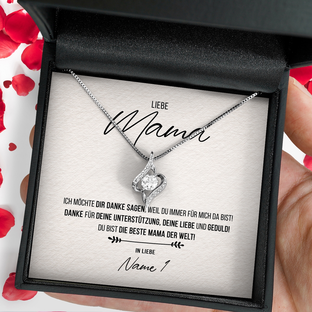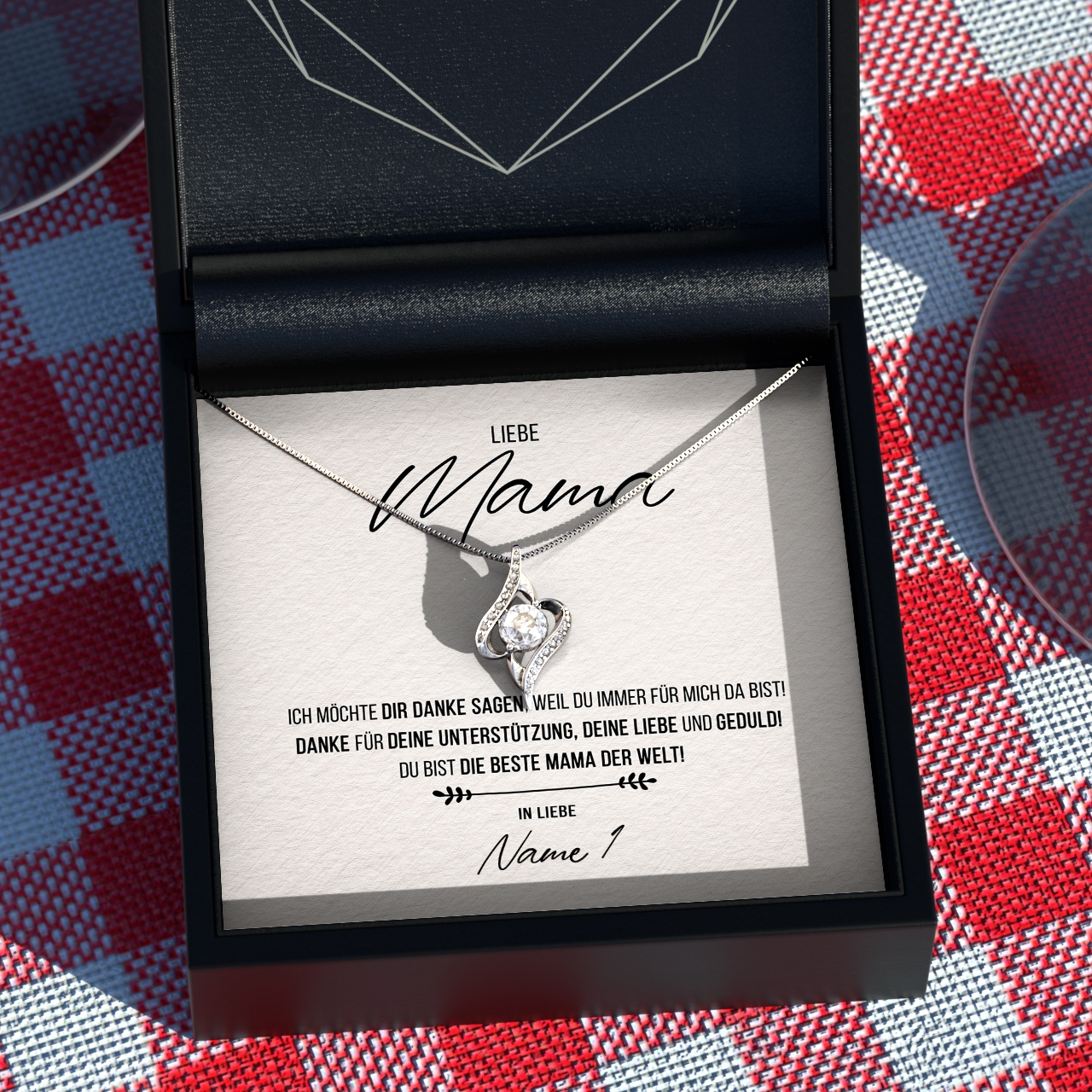 Wir liefern Dir eine hochwertige Halskette aus echtem 925 Sterling Silber in den Farben Silber, Gelbgold oder Rosegold. Außerdem legen wir Deine personalisierte Karte zusammen mit der Halskette in eine exklusive Schmuckbox aus Kunstleder. Um Deiner Mutter eine wirklich große Freude bereiten zu können, legen wir eine schöne Geschenktasche in Dein Paket. Damit hast Du die Möglichkeit, Dein sehr persönliches Geschenk sofort nach Erhalt Deiner Bestellung an Deine geliebte Mama zu übergeben.