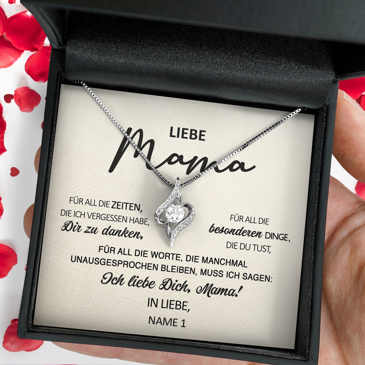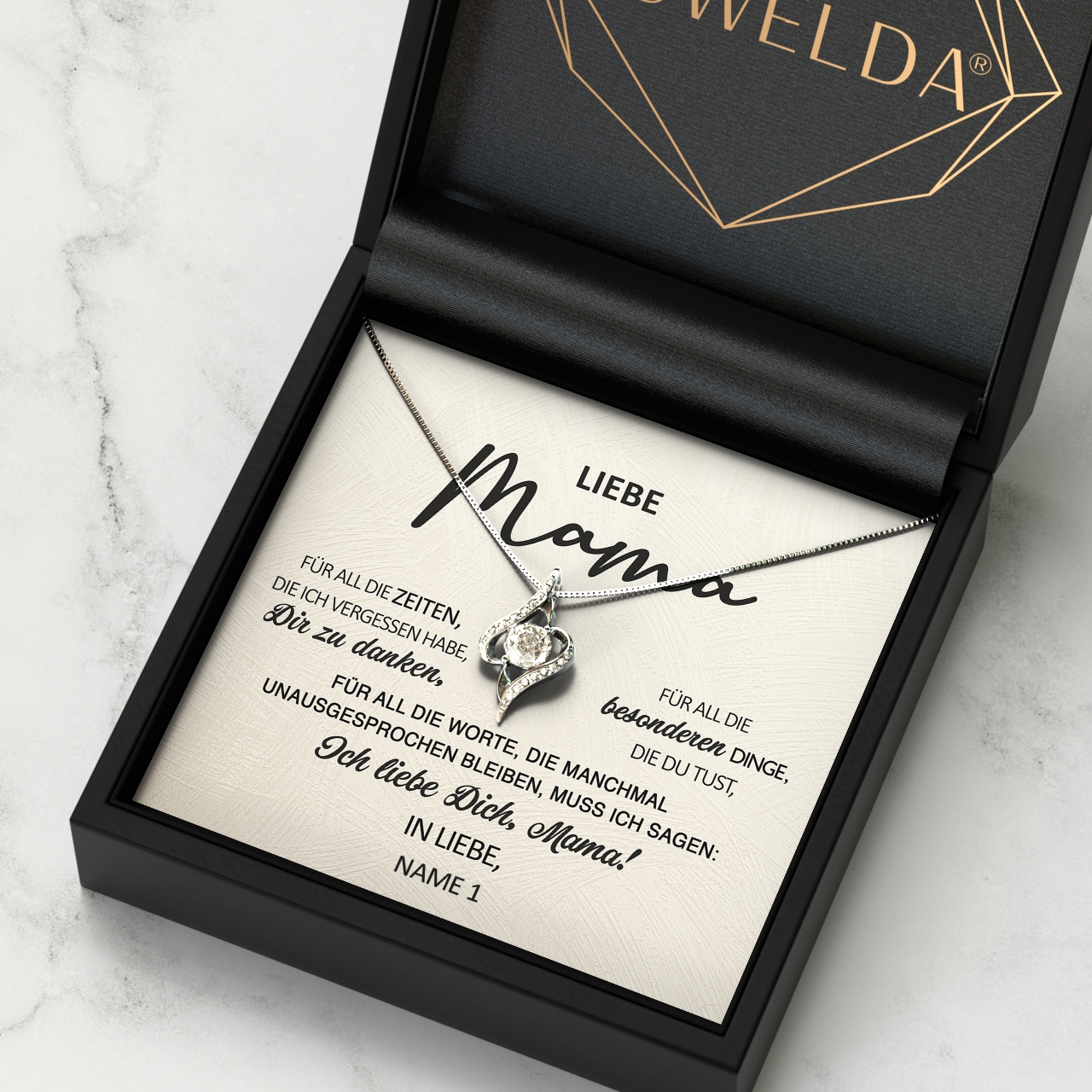 Wir legen die Halskette Deiner Wahl und die personalisierte Karte in eine exklusive Schmuckbox aus Kunstleder mit Samt-Inneneinlage. Damit Du das Geschenk sofort verschenken kannst, verpacken wir Dir alles behutsam in einer hochwertigen Geschenktasche und hüllen diese in Seidenpapier mit einer Geschenkschleife ein. Du erhältst Dein Paket innerhalb von 2-3 Werktagen.