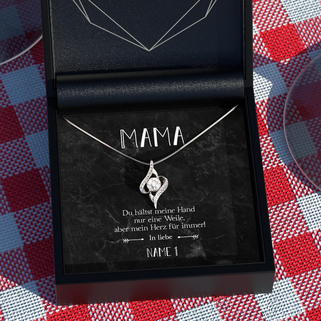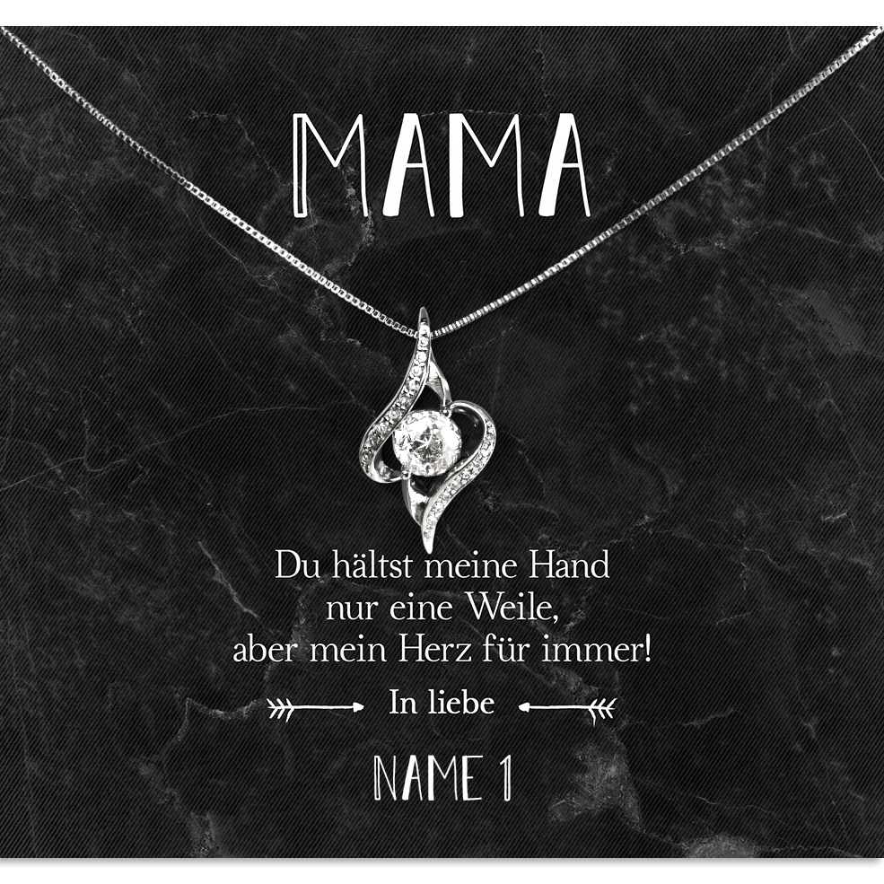 Unsere Karte „Für immer im Herzen“ wird mit bis zu 7 Namen personalisiert. Du hast die Möglichkeit, das Geschenk mit Deinen Geschwistern gemeinsam zu verschenken. Wähle einfach die Anzahl der Namen aus und trage diese in das dafür vorgesehene Feld ein. Wir liefern Dir eine Halskette aus 925 Sterling Silber und Deine personalisierte Karte in einer schönen Schmuckbox.