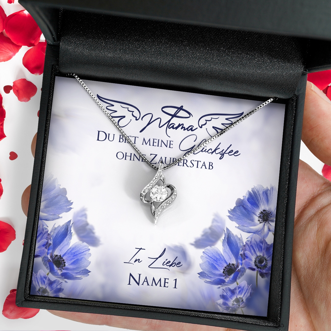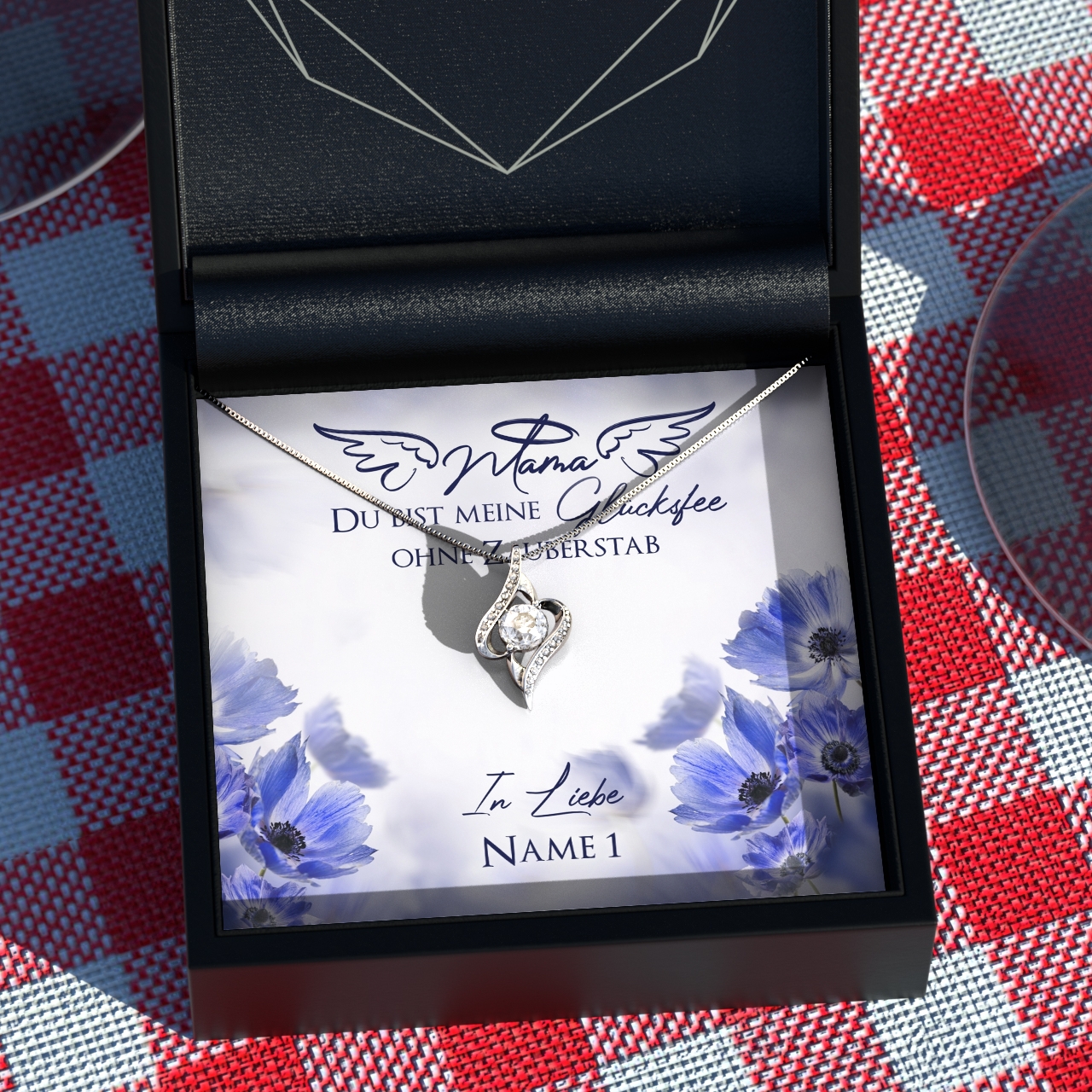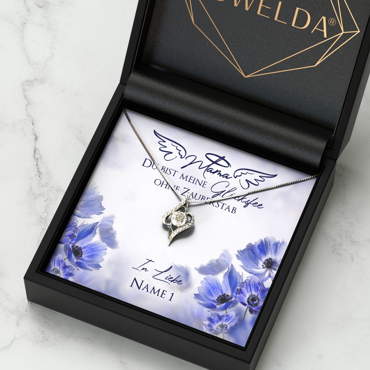 Deine Mama hat für Dich einen ganz besonderen Stellenwert? Sie ist immer für Dich da und teilt Deine Freude wie auch die schweren Zeiten mit Dir? Dann kannst Du mit einem eleganten wie hochwertigen Schmuckgeschenk mit personalisierter Grußkarte ein Lächeln in das Gesicht von Mama zaubern. Das schöne Motiv „Glücksfee“ ist schlicht und dennoch bewegend. Die kleinen Flügel auf der Karte zeigen, dass sie ein echter Engel ist. Lilafarbene Blumen und ein feiner Schriftzug mit den Namen der Kinder darunter zieren die Karte ebenfalls.