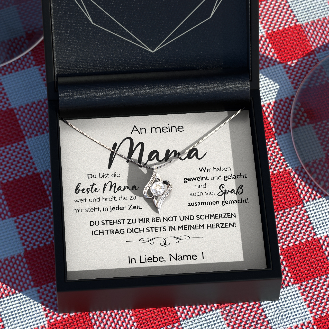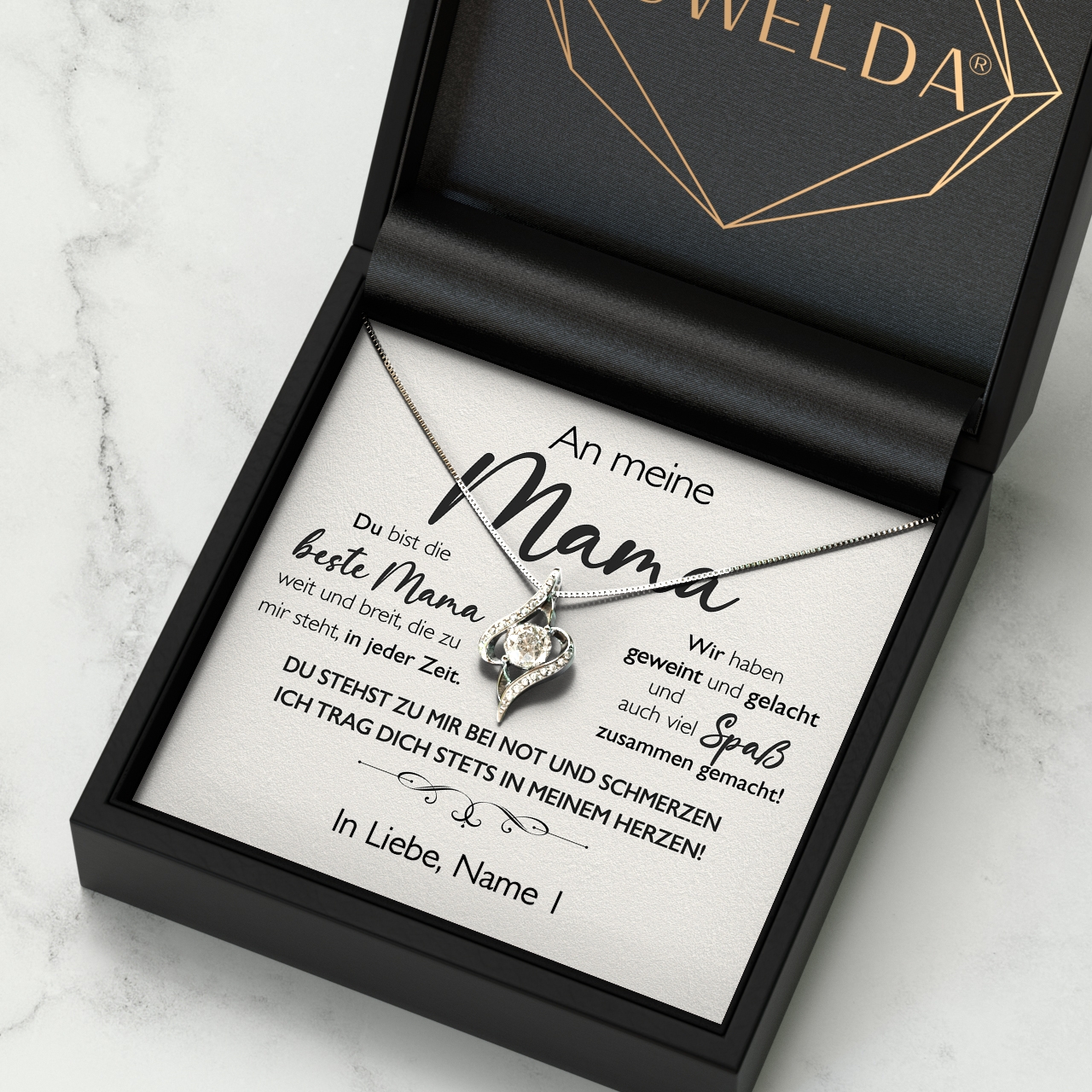 Mama ist die Person, die Dir in schlechten Zeiten den Rücken stärkt und in guten Zeiten Deine Erfolge mit Dir teilt. Sie bringt Dich zum Lachen und trocknet Deine Tränen. Egal wie tief Du fällst, mit der Hilfe von Mama stehst Du immer wieder auf. Für all die Zeiten, in denen Deine Mutter für Dich da war und für all die Zeiten, in denen Deine Mutter für Dich da sein wird, kannst Du Dich jetzt mit einer schönen Halskette aus 925 Sterling Silber und einer personalisierten Karte bedanken.