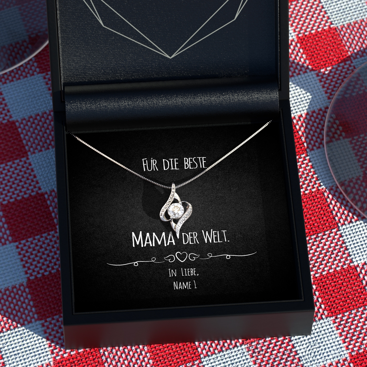 An besonders schweren Tagen weißt Du, dass Du Dich auf Deine Mama verlassen kannst. Sie steht Dir immer mit Rat und Tat zur Seite und hilft in jeder Lebenslage. Viel zu selten bedankst Du Dich für die ständigen Mühen Deiner Mutter und würdest einmal gerne Deine herzliche Anerkennung zeigen? Dann ist unsere personalisierte Karte „Mama im Herzen“ genau Deine Wahl! Ein schlichtes Design mit einem treffenden Spruch und Deinem Namen verziert, wird dieses Geschenk etwas ganz Besonderes. Du musst Dich nur für eine unserer wunderschönen Halsketten entscheiden und Deine Wunschnamen eintragen. In der Live-Vorschau kannst Du begutachten, wie Dein persönliches Geschenk aussehen wird.