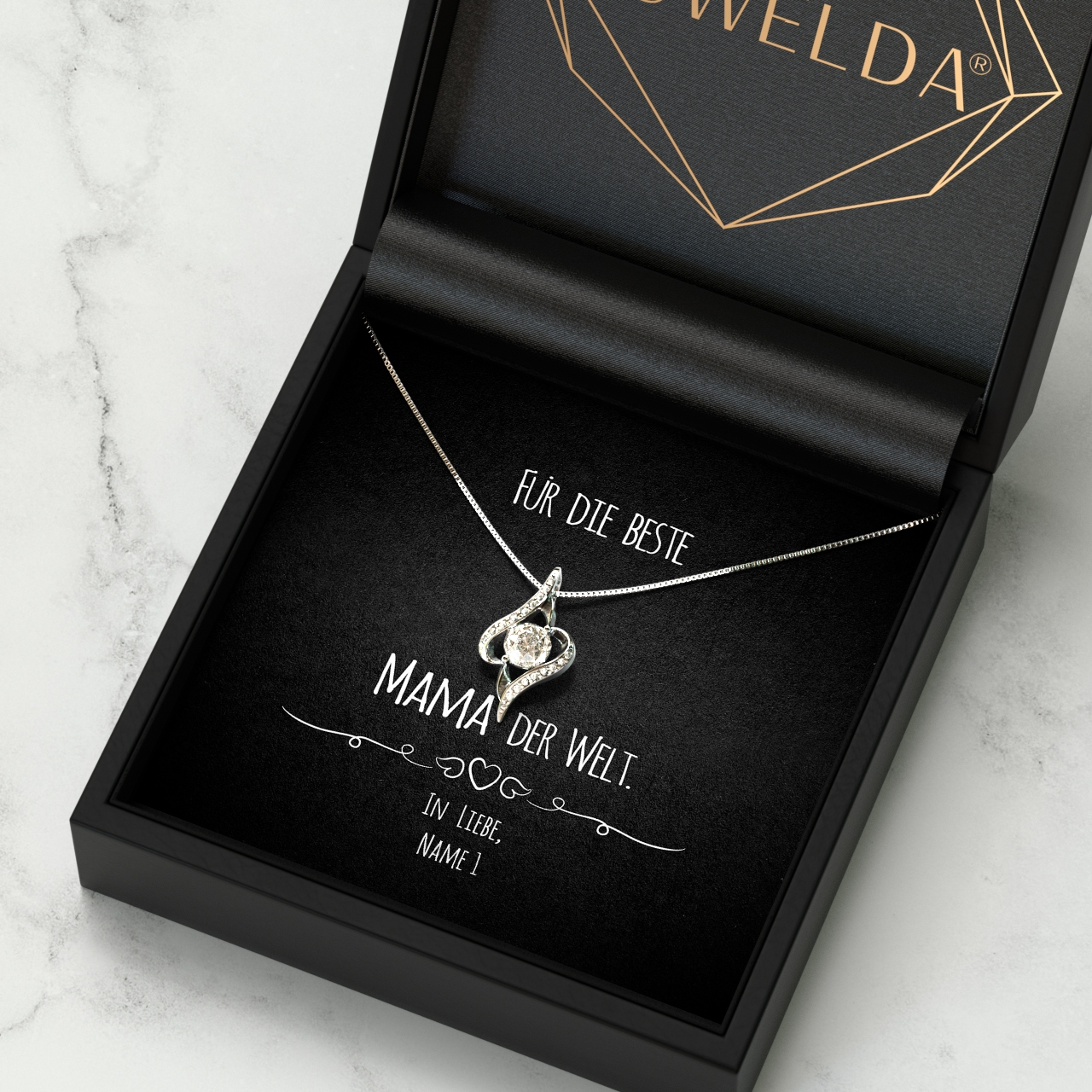Die von Dir gewählte Halskette wird mit Deiner personalisierten Karte in eine hochwertige Schmuckbox gelegt. Damit Du Dein Geschenk sofort verschenken kannst, verpacken wir alles in einer schönen Geschenktasche von Hand und mit ganz viel Liebe. Innerhalb von 2-3 Werktagen hältst Du Dein ganz individuelles Geschenk in den Händen, mit dem Du Deiner Mama eine große Freude bereiten wirst.