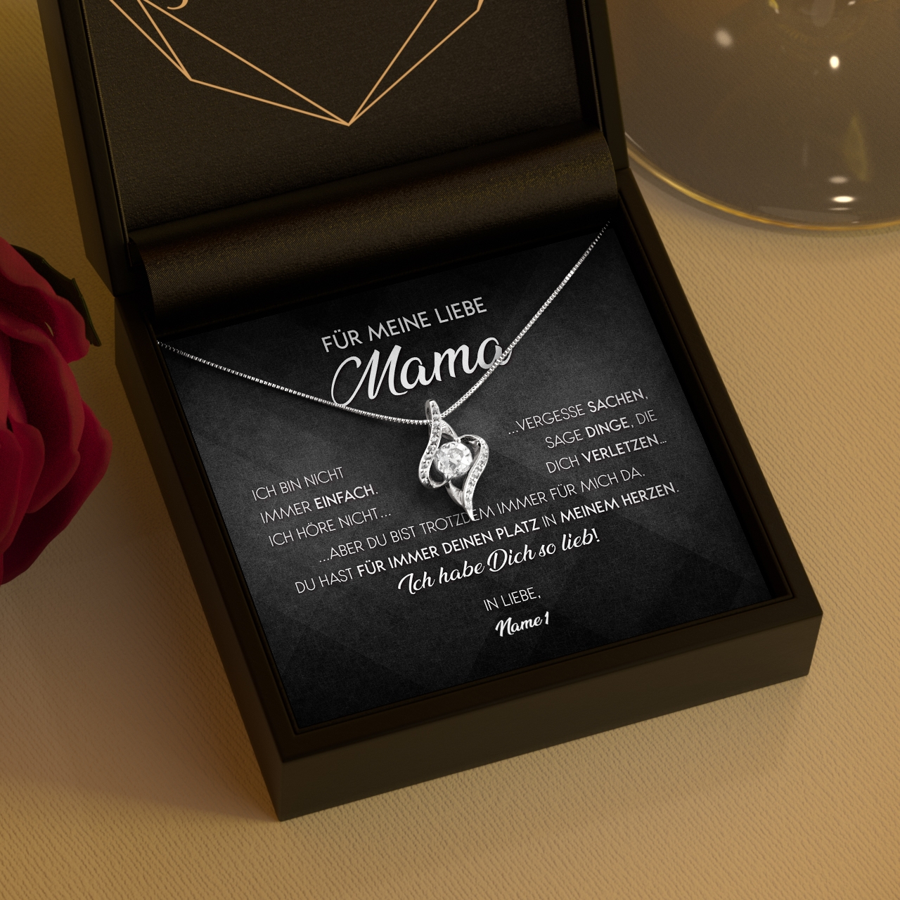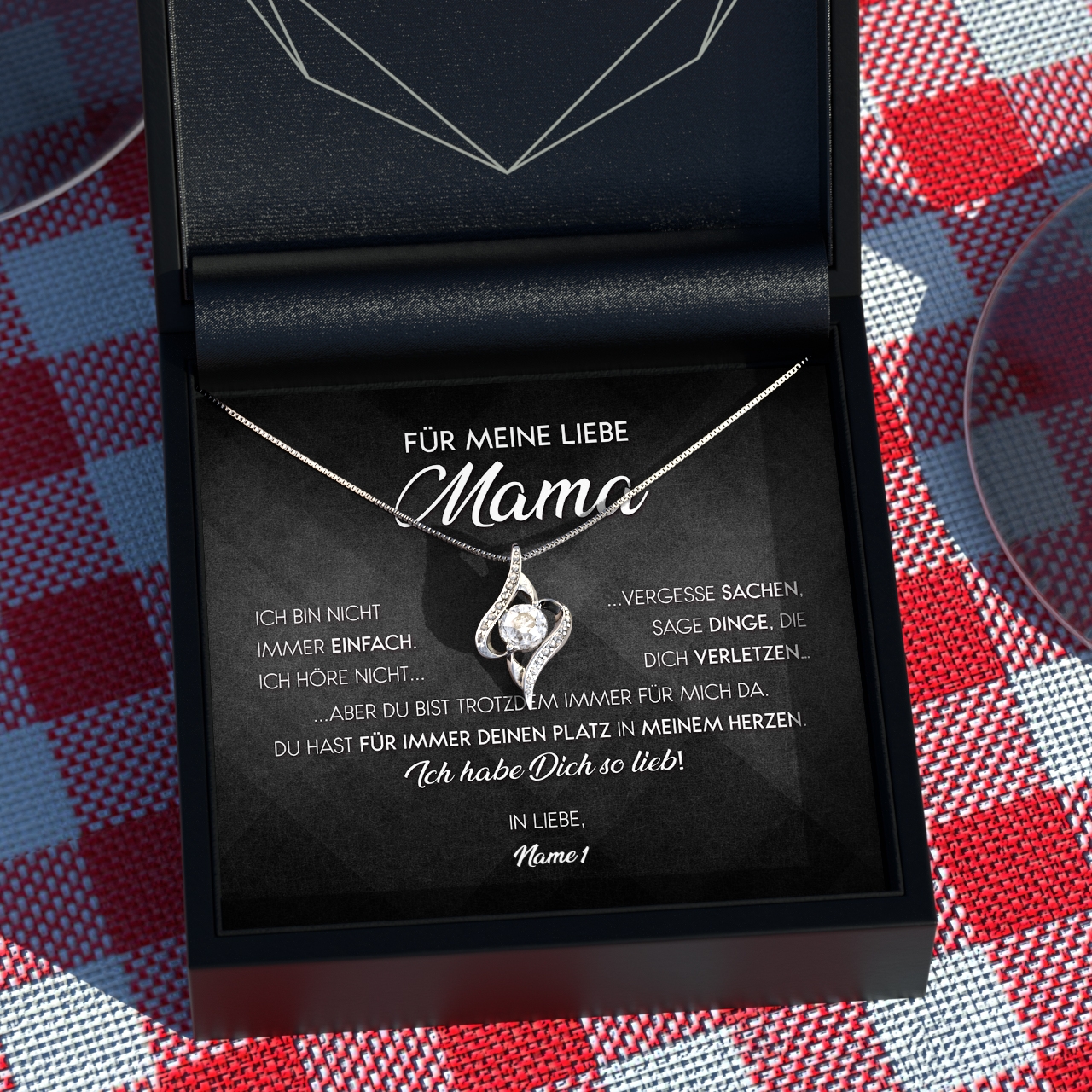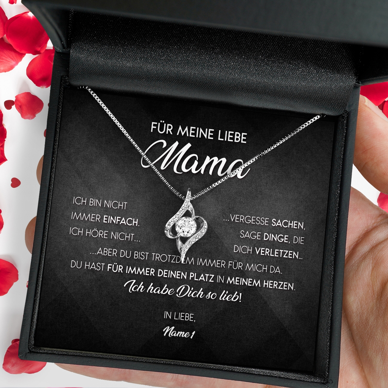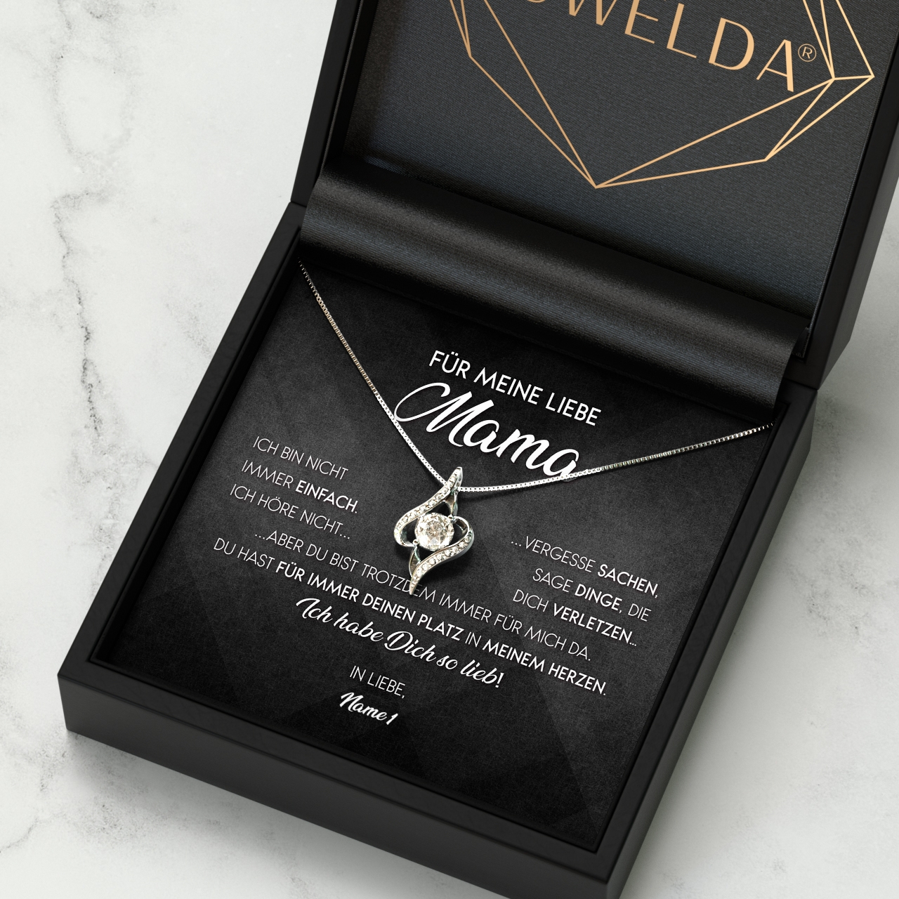 Du möchtest, dass Deine Mama vor Freude strahlt und sich riesig freut? Dann überrasche Sie mit einer eleganten Halskette und der personalisierten Karte „Nicht immer einfach“. Du musst nur Deine Wunschnamen in das Personalisierungsfeld eintragen und kannst Deine ganz persönliche Karte mit Deinem ausgewählten Spruch in der Live-Vorschau betrachten. Gefällt Dir die Live-Vorschau? Dann musst Du nur Deine gewünschte Zahlungsmethode wählen und auf „Jetzt Kaufen“ klicken. Während Du Dich entspannt zurücklehnen kannst, übernehmen wir die Arbeit und fertigen Dein individuelles Geschenk für Dich an.