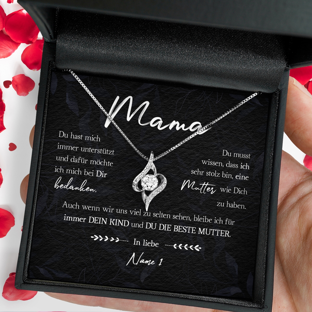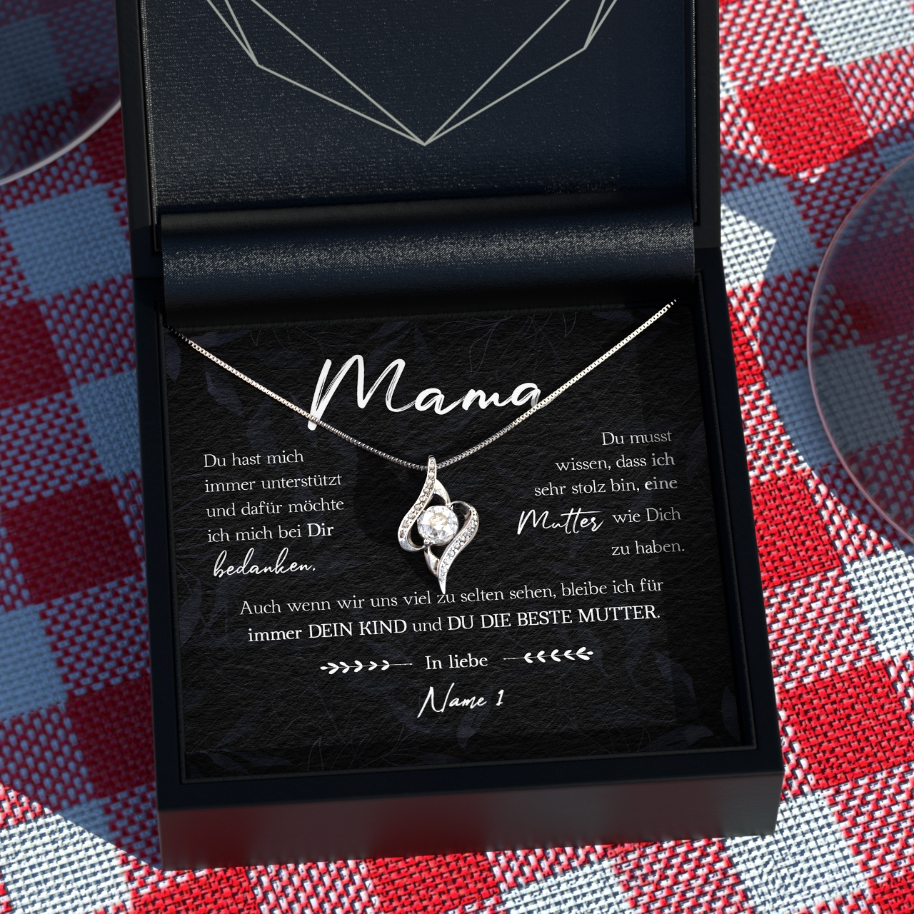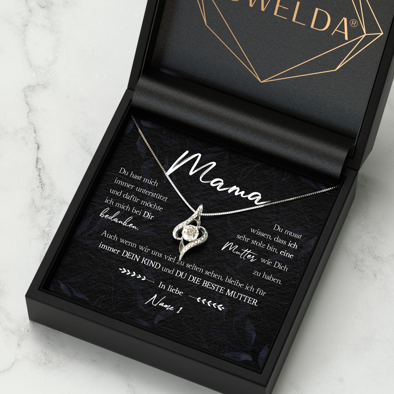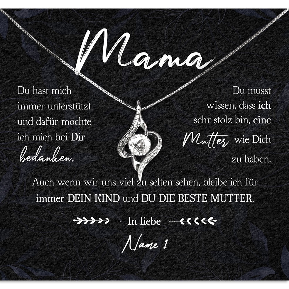Wir drucken Deine personalisierte Karte mit Deinen Wunschnamen und legen diese zusammen mit der funkelnden Halskette in eine hochwertige Schmuckbox. Damit Du das Geschenk bei Deinem nächsten Besuch bei Deiner Mutter sofort überreichen kannst, legen wir zusätzlich eine schöne Geschenktüte in Dein Paket. Somit erhältst Du ein rundum vollkommenes Geschenk, das bestimmt in Erinnerung bleiben wird!