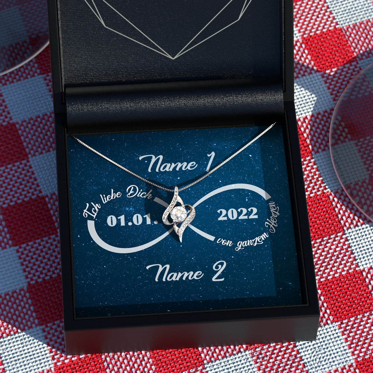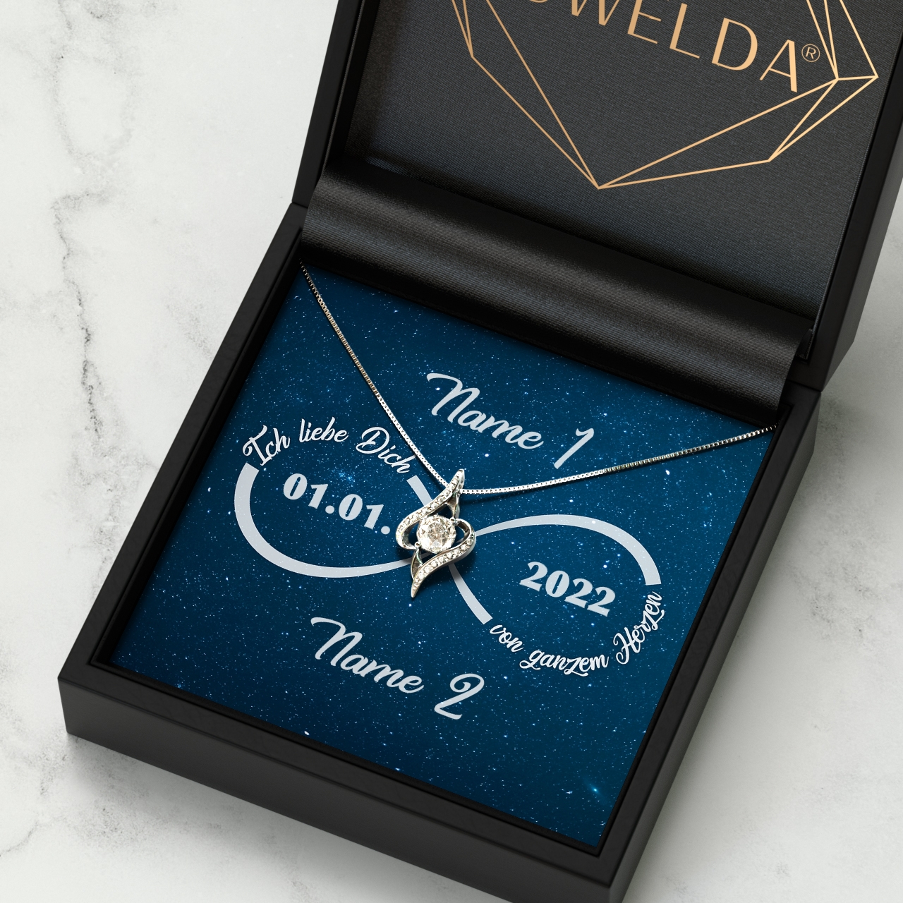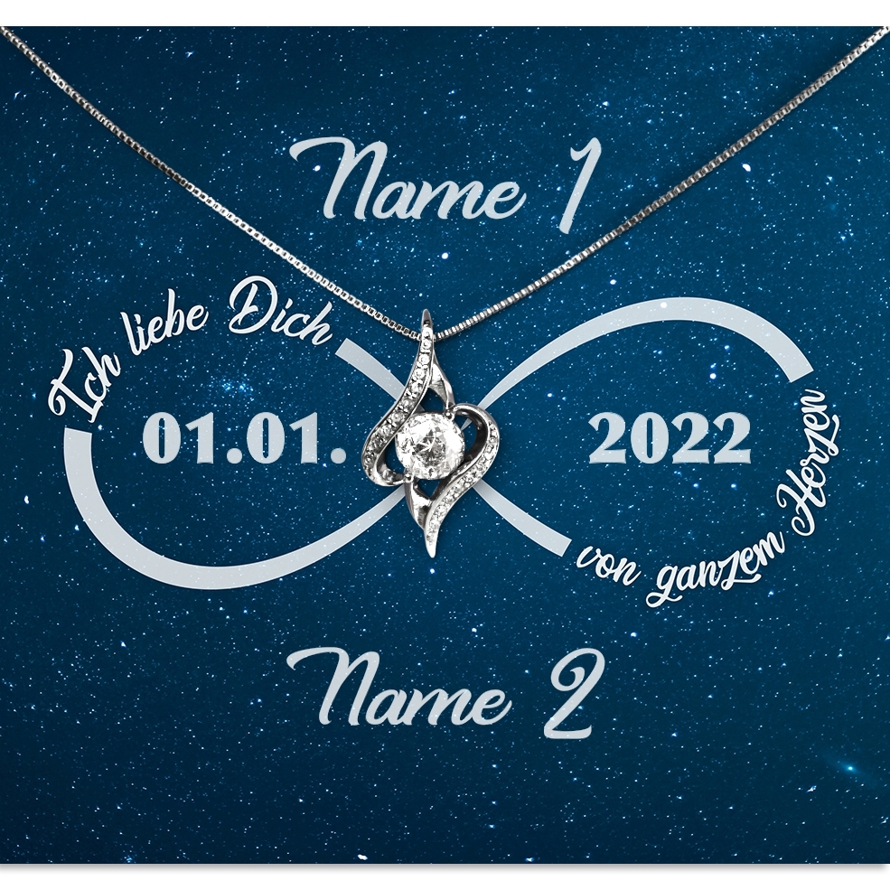 Bei jedem Blick, bei jedem Wort und bei jedem Lachen weißt Du, dass Du Deinen Schatz über alles liebst. Du möchtest Deiner Frau wissen lassen, dass sie für Dich der hellste Stern am Himmel ist und Du sie einfach unendlich liebst? Unsere personalisierbare Karte „Unendliche Liebe“ gibt Dir die Möglichkeit, zum Hochzeitstag eine besonders schöne Überraschung zu überreichen. Du zeigst ihr, dass Du sie von ganzem Herzen liebst, indem Du ihr ein exklusives Schmuckstück mit einer individuellen Liebesbotschaft schenkst.