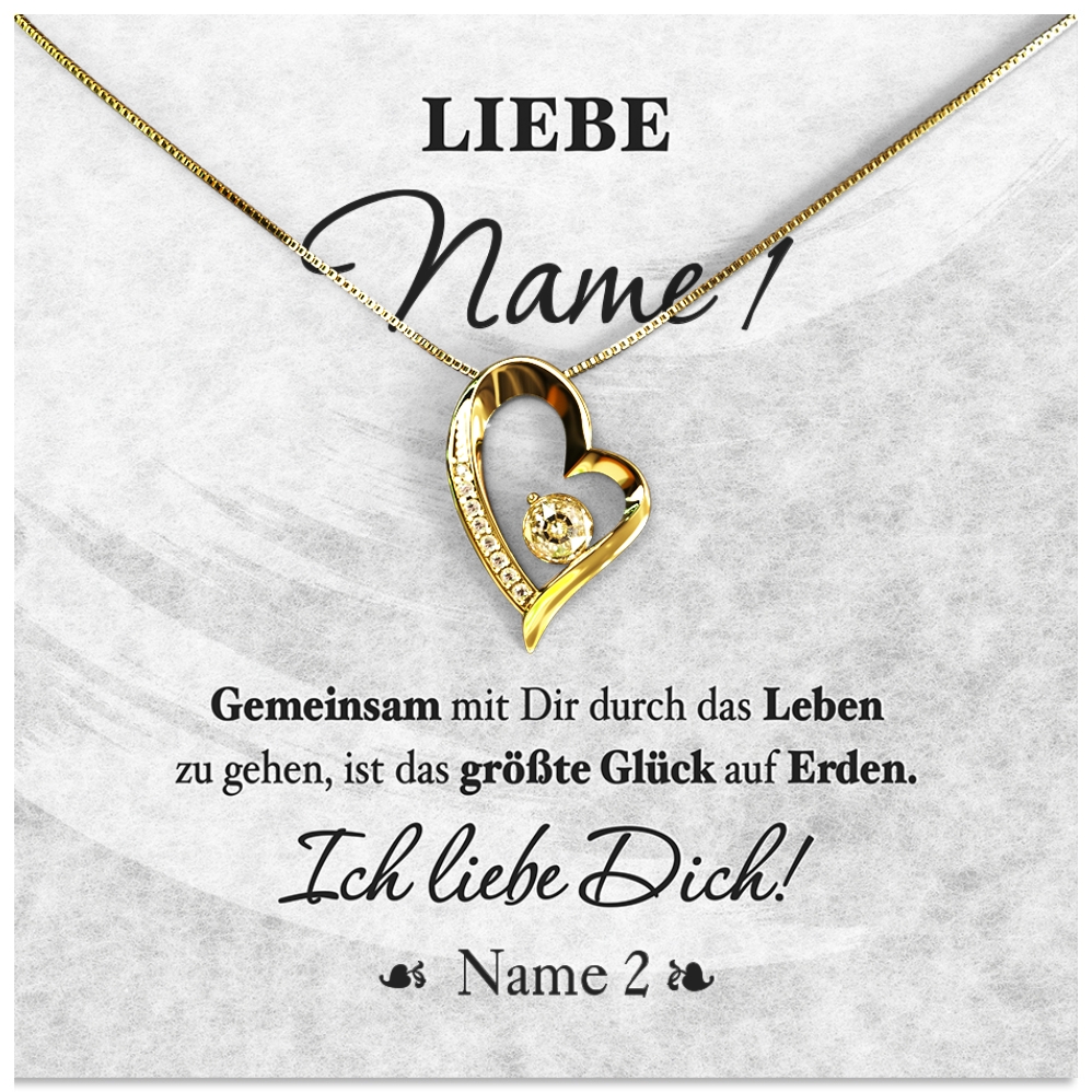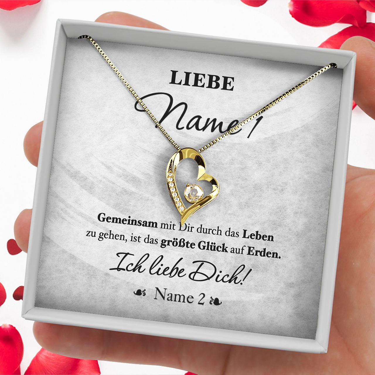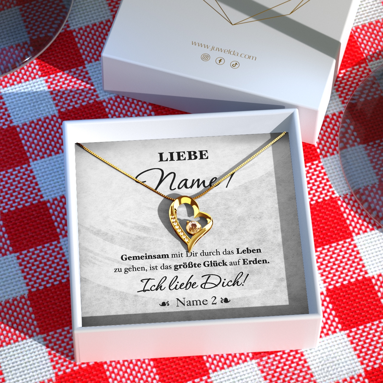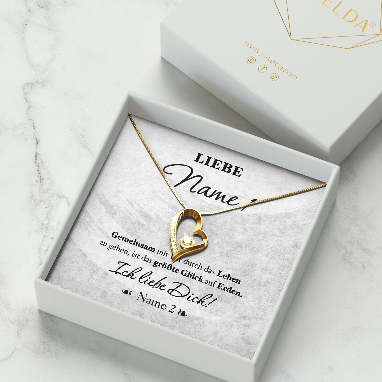 Was gibt es Schöneres, als die wahre Liebe gefunden zu haben? Wenn es an der Zeit ist, dies auf eine sehr spezielle Art zum Ausdruck zu bringen, dann ist ein Schmuckgeschenk mit einer personalisierten Grußkarte genau richtig. Du kannst das Kartendesign „Das größte Glück“ mit Namen selbst gestalten. Das Geschenkset wird garantiert viel Freude bringen. Es eignet sich zu allen Anlässen und ist besonders romantisch zum Valentinstag oder zum Jahrestag.