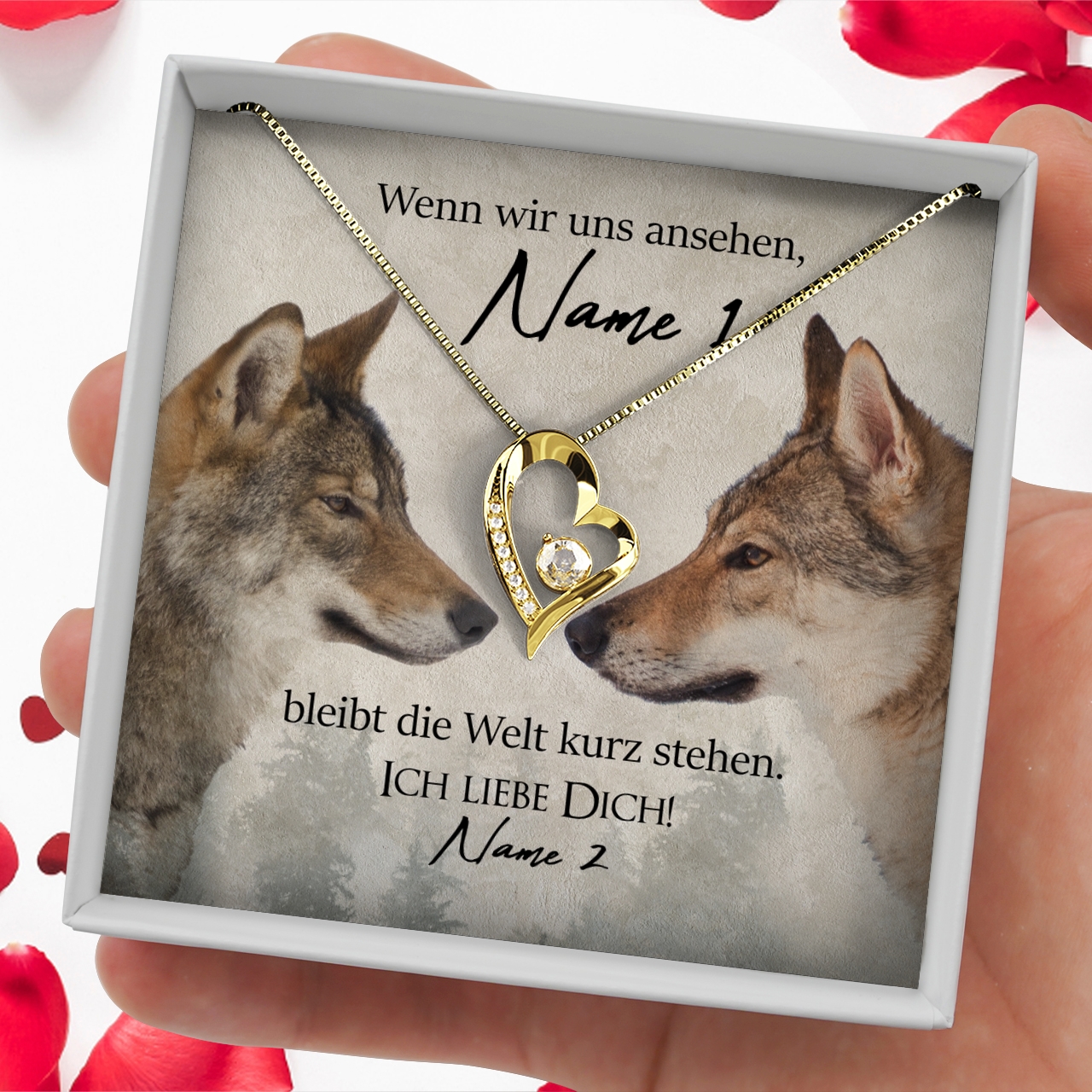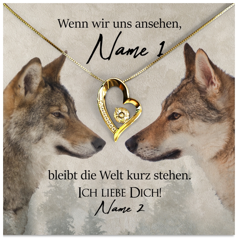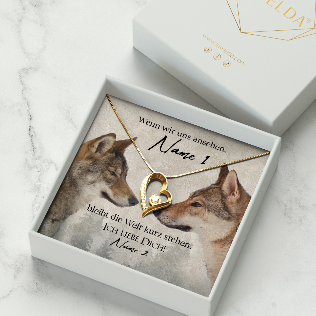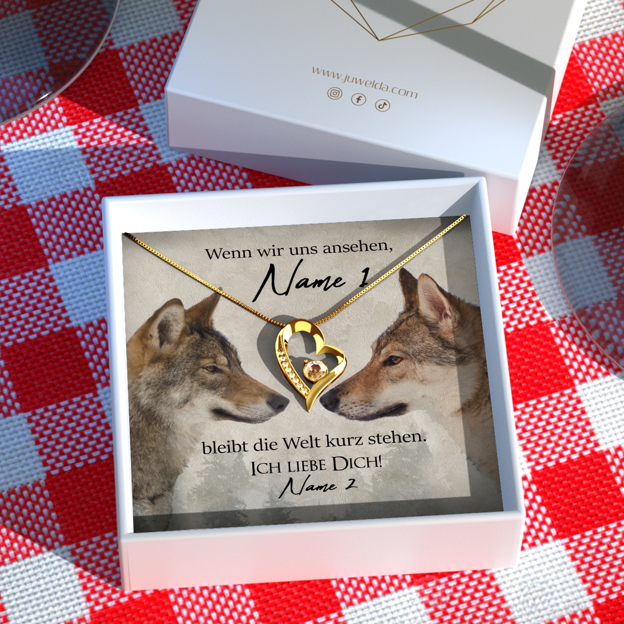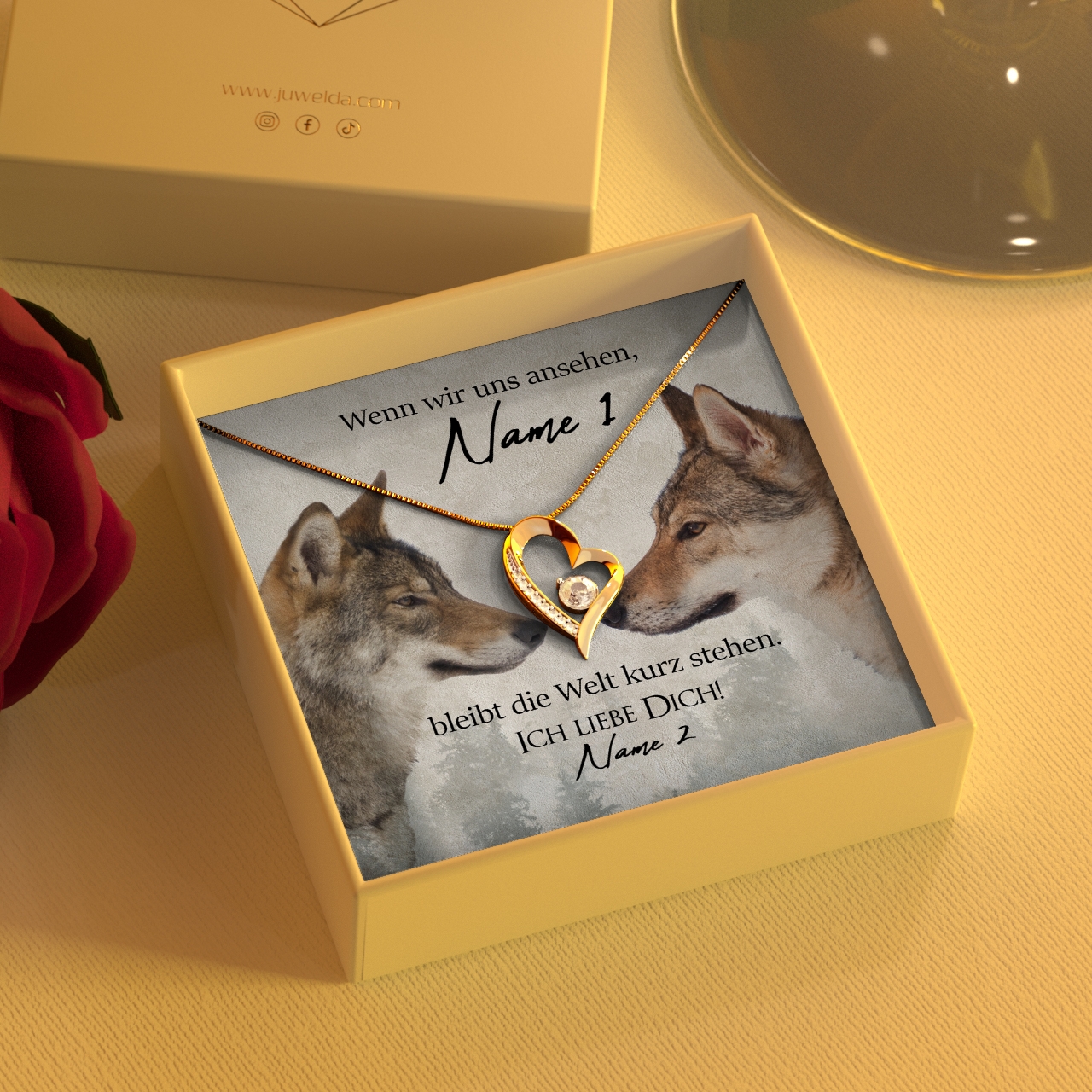 Gib bei der Bestellung einfach den Namen Deiner Herzdame an und wir kümmern uns um den Rest. Innerhalb weniger Tage ist das exklusive Geschenkset bei Dir. Der Schmuck und die personalisierte Grußkarte werden sorgfältig in eine hochwertige Schmuckbox verpackt. Die Box ist aus Kunstleder gefertigt und mit luxuriösem Samt ausgelegt. Überreiche die Überraschung in unserer hübschen Geschenktüte, die bei der Lieferung gratis beiliegt. Lass Eure Liebe mit unserer Geschenk-Box weiter wachsen und noch stärker werden.