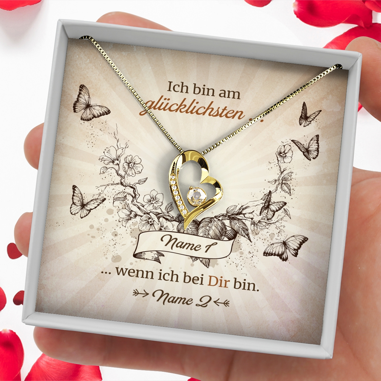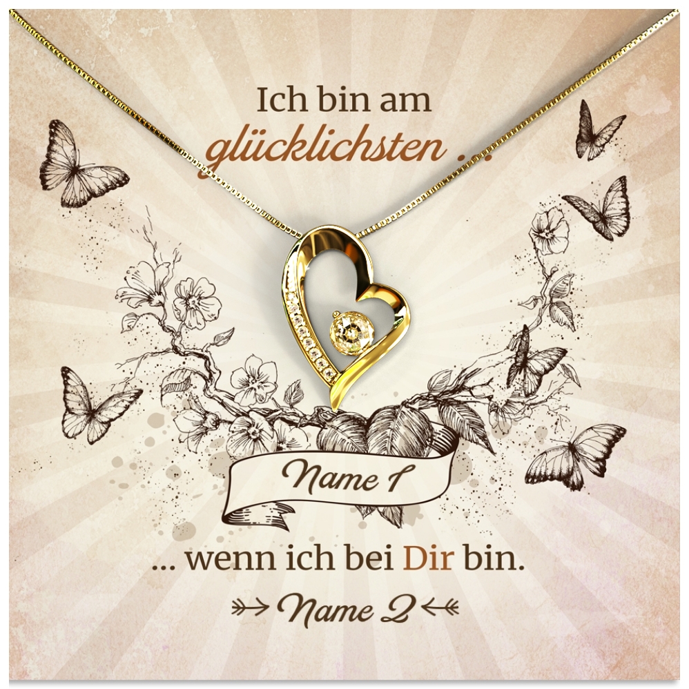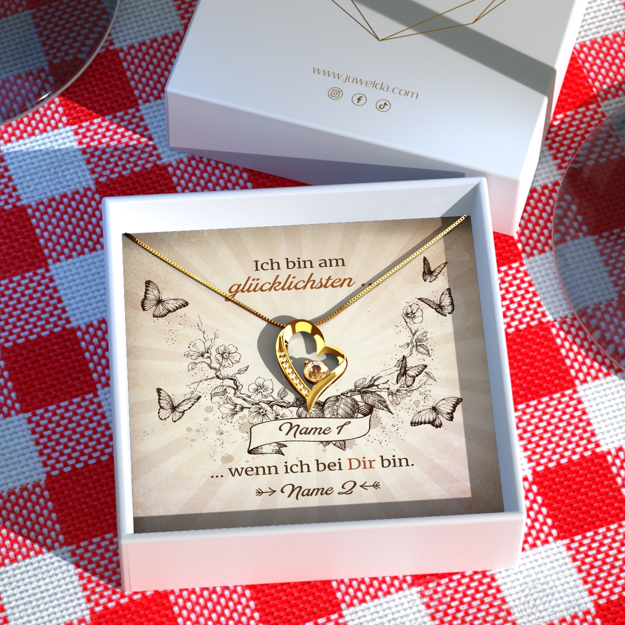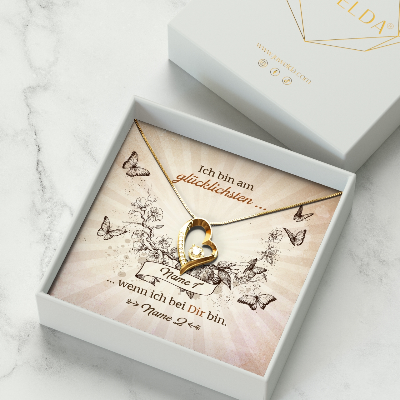 Ich bin am glücklichsten, wenn ich bei Dir bin! Gibt es ein schöneres Geschenk als diese wunderbaren Worte? Mit unserer hochwertigen Schmuck-Geschenkbox kannst Du eine personalisierte Grußkarte zusammen mit einem eleganten Schmuckstück überreichen. Die schöne Karte im nostalgischen Design und mit weichen Beigetönen ist ein wunderbares Präsent für Deine Freundin. Du kannst ihr so zeigen, dass Du für sie nur das Beste wählst und Dir für dieses Geschenk besonders viel Mühe gegeben hast.
