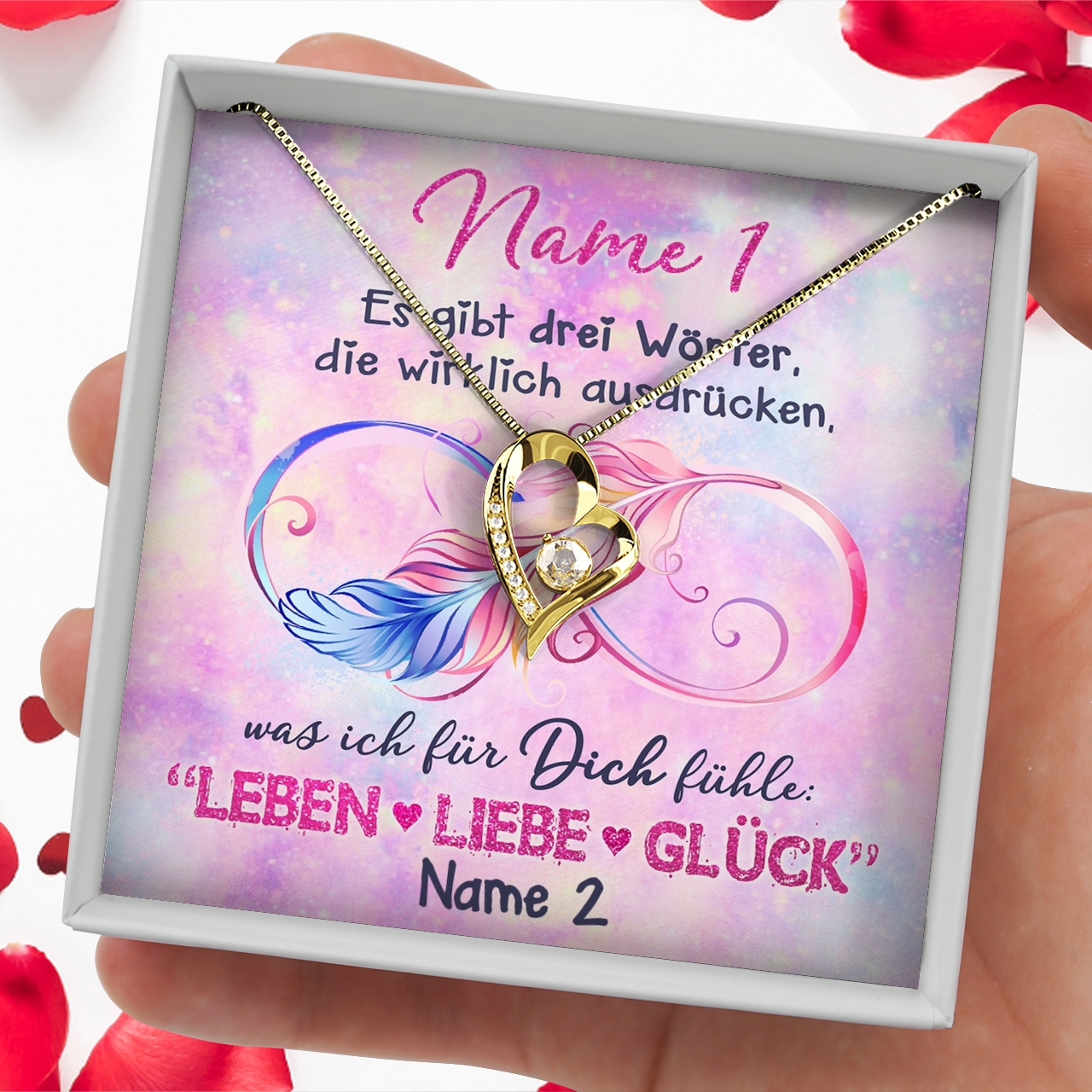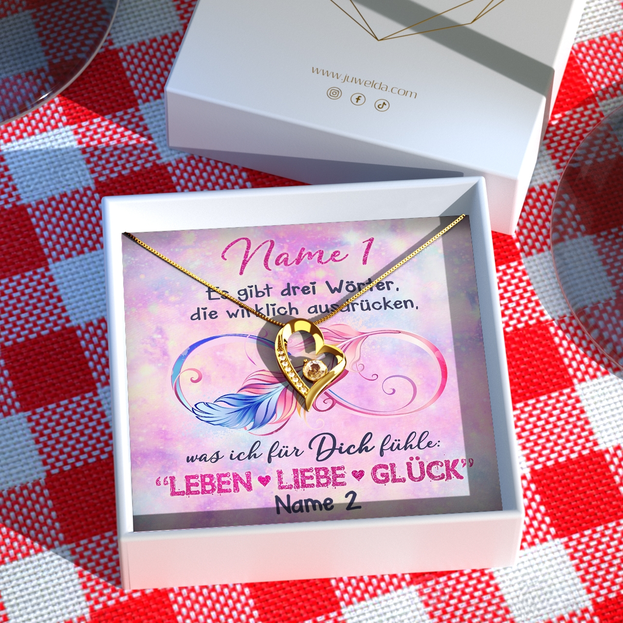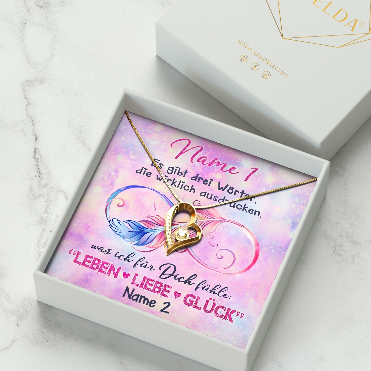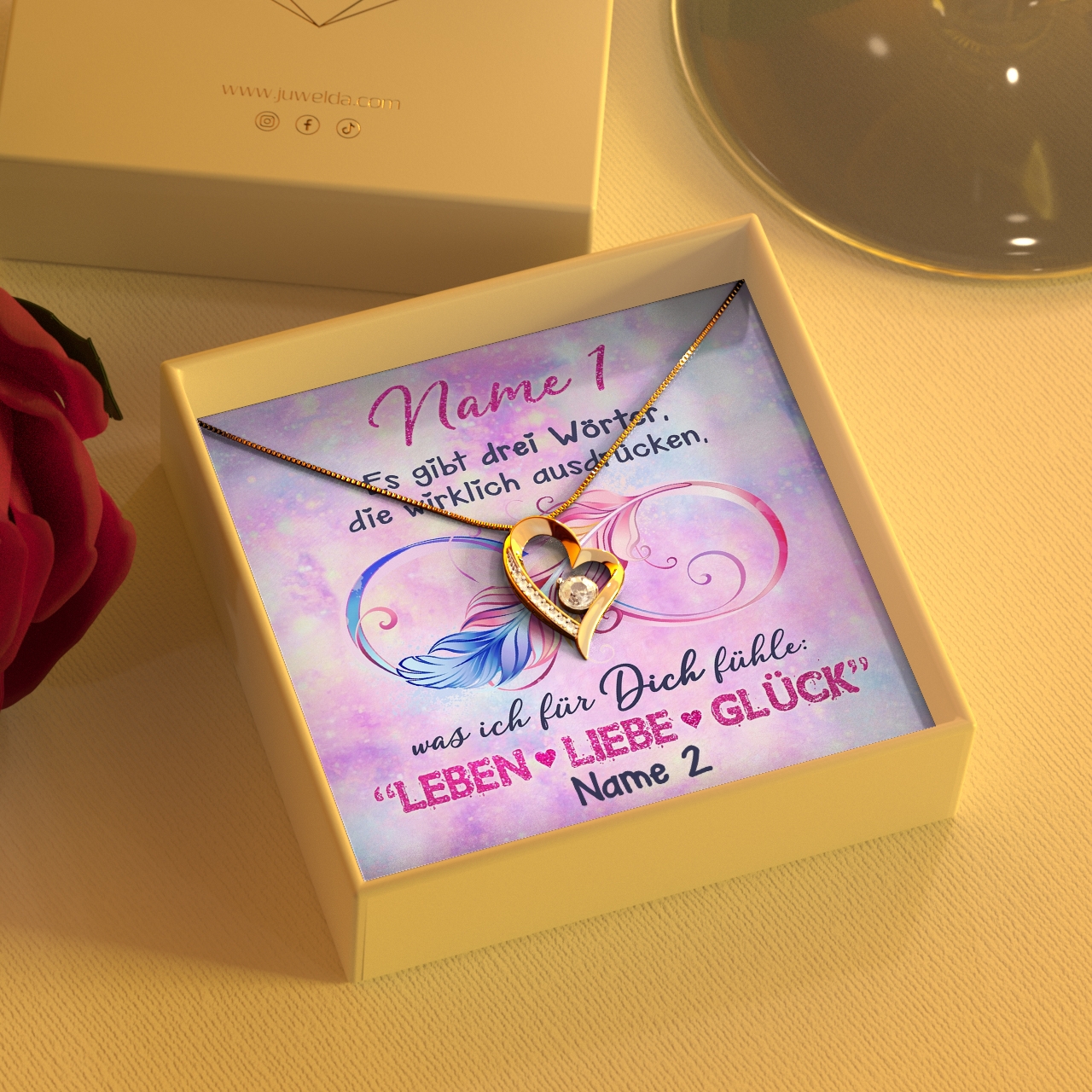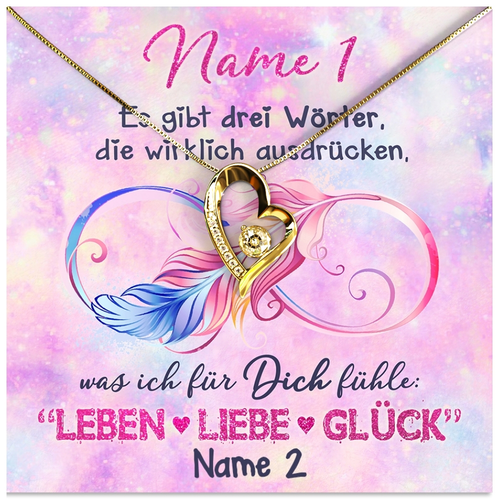 Du und Deine Freundin es bunt und verspielt mögt? Dann ist diese personalisierbare Grußkarte die richtige Wahl für Dein Schmuckgeschenk. Überrasche die Frau Deiner Träume mit einem hübschen Schmuckstück Deiner Wahl und mit einer romantischen Liebeserklärung. Die leuchtenden Pastellfarben der Grußkarte zeigen ein geschwungenes Unendlichkeitssymbol mit einer Feder – ein Zeichen dafür, dass Eure Liebesgeschichte unendlich ist. Der schöne Spruch steht für die tiefen Gefühle, die Du für Deine Partnerin empfindest. Eine wunderbare Kombination, die lange in Erinnerung bleiben wird.