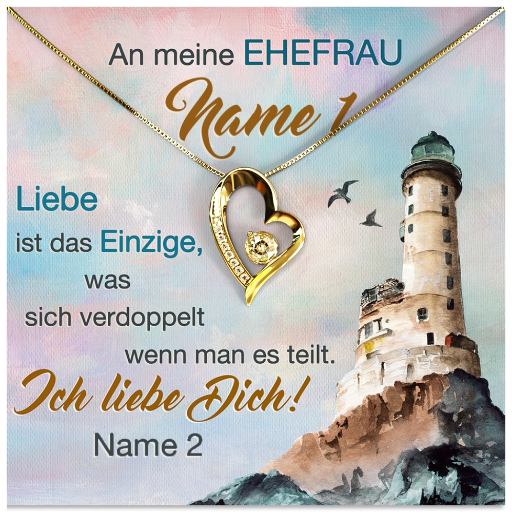 Wahre Liebe ist wie das helle Licht eines Leuchtturms – sie bringt Dich immer wieder sicher in den Hafen des Lebens. Zeige Deiner Frau, wie viel sie Dir bedeutet und beschenke sie mit unserer personalisierbaren Grußkarte im Leuchtturm-Design. Die Karte ist passend zu dem von Dir ausgewählten Schmuckgeschenk aus unserem Sortiment. Gib bei der Bestellung einfach den Namen Deiner Frau und Deinen Namen an. Wir zeigen Dir in der Live-Vorschau, wie das finale Design aussehen wird.