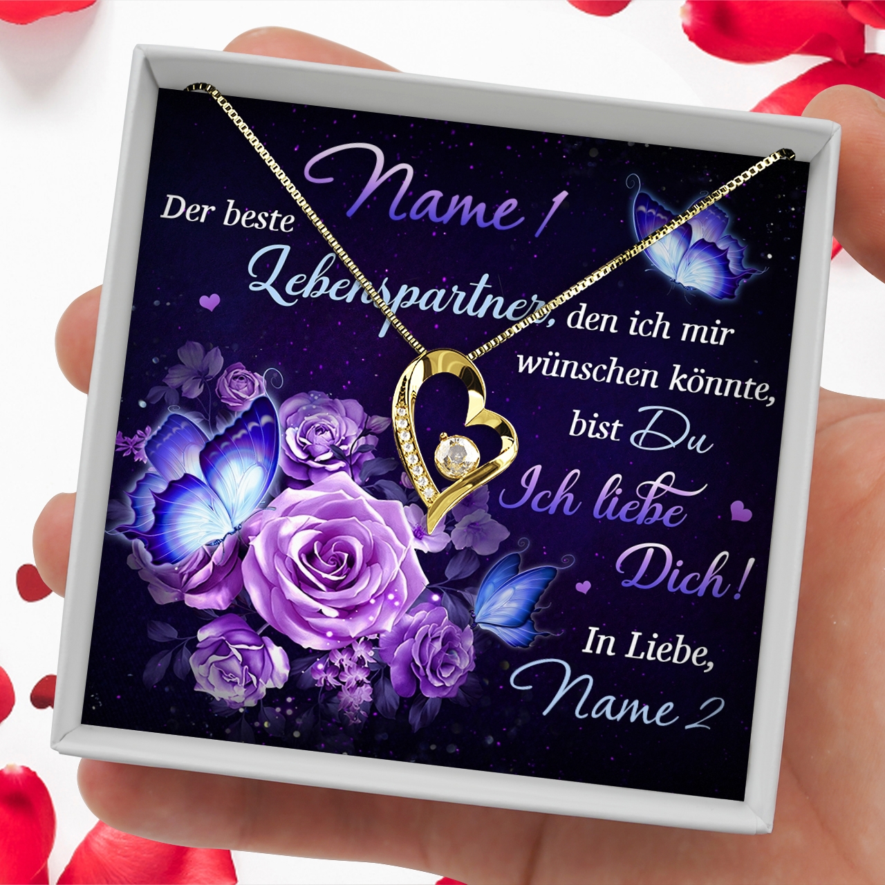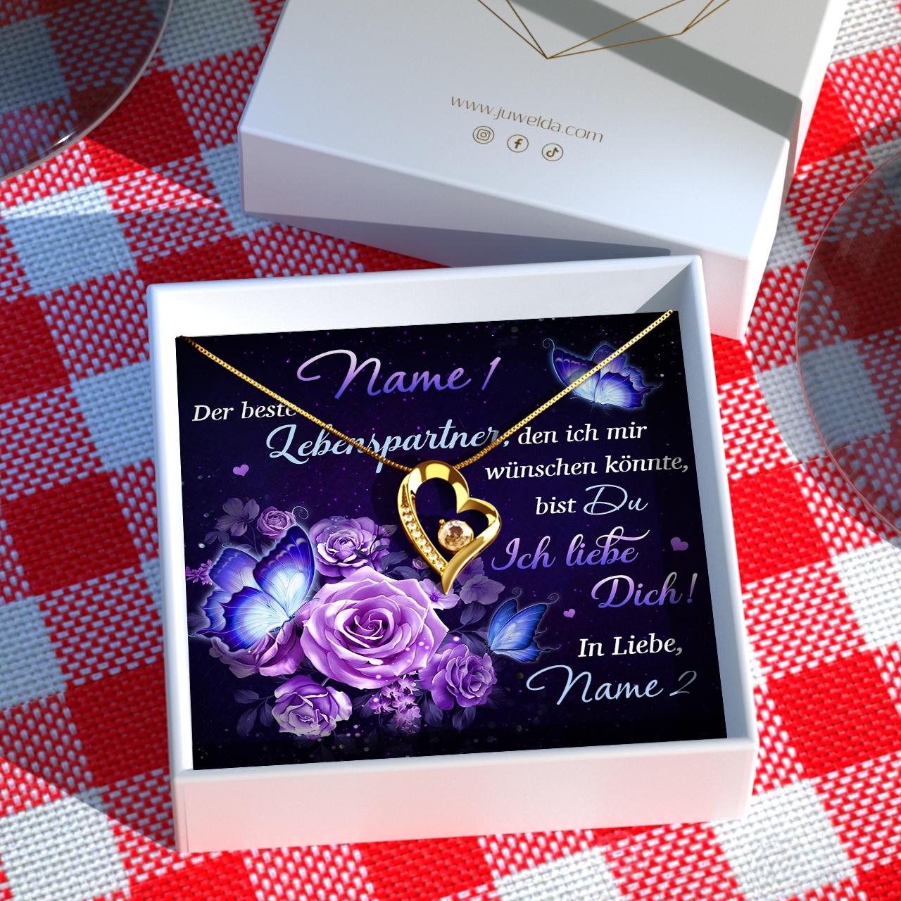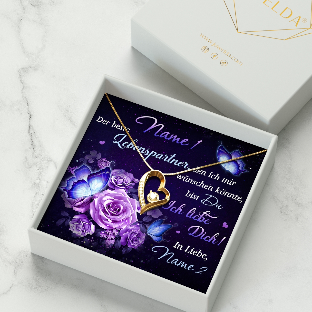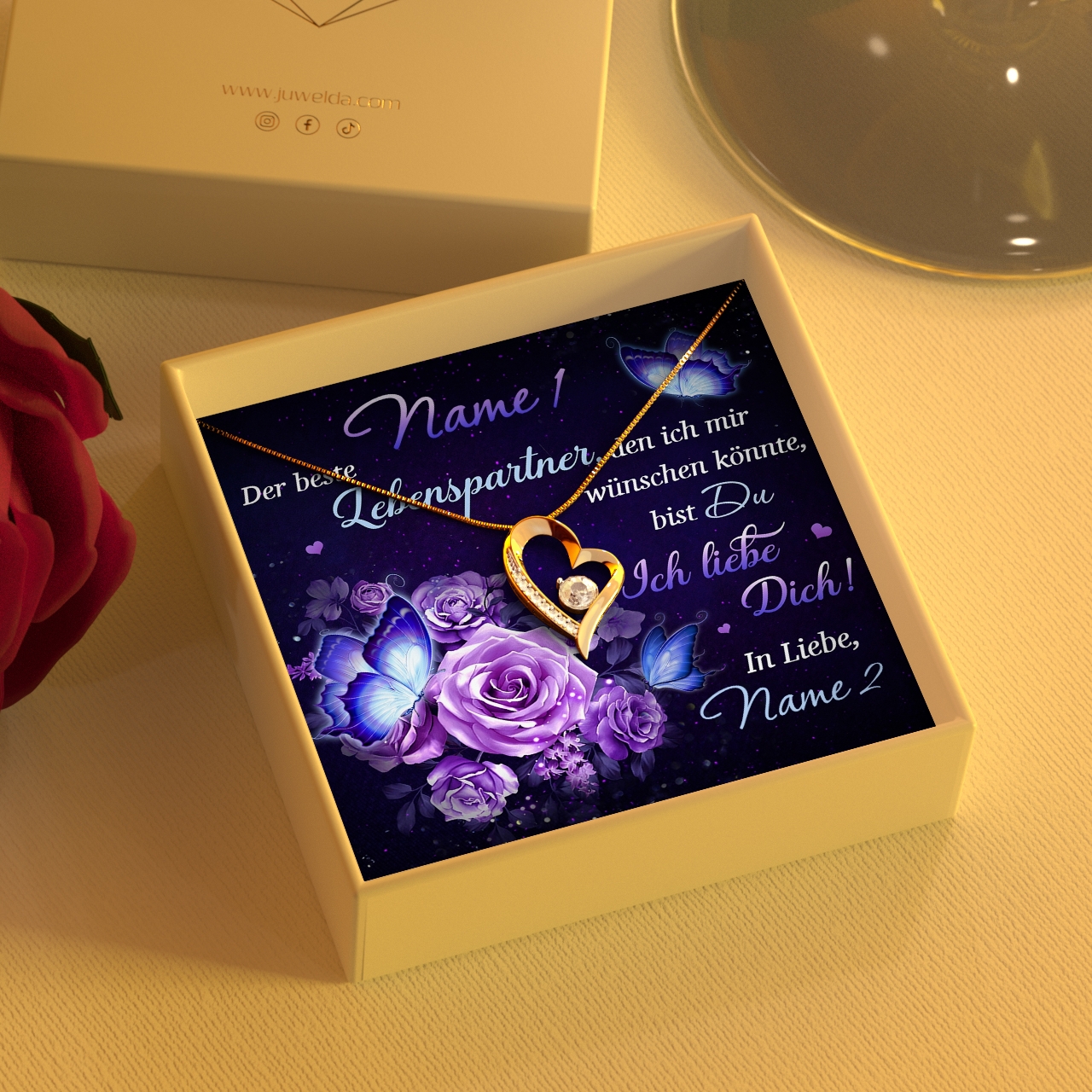 Auf der personalisierten Karte befinden sich neben dem romantischen Spruch und den wundervollen Rosen in leuchtendem Lila auch Eure Namen. Das macht Dein Geschenk individuell und wird Deiner Freundin so garantiert in Erinnerung bleiben. Um das beste Geschenkerlebnis zu sichern, liefern wir Dir alles in einer hochwertigen Schmuckbox aus Kunstleder und platzieren Dein Präsent in einer Premium Geschenktasche.