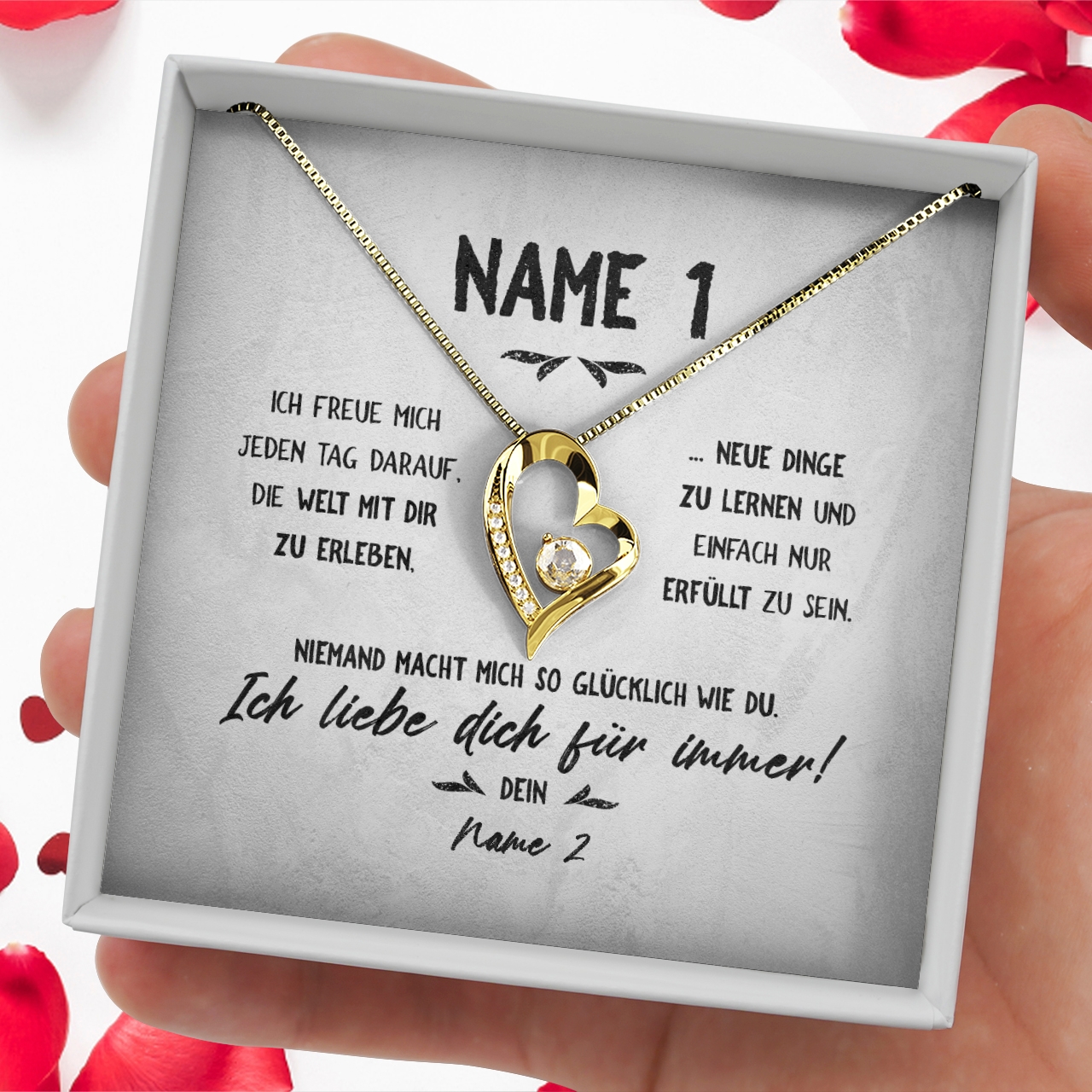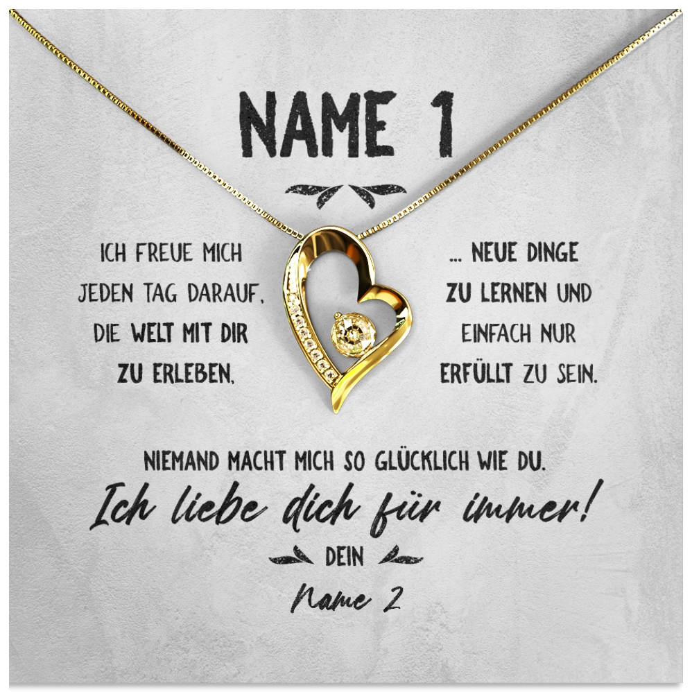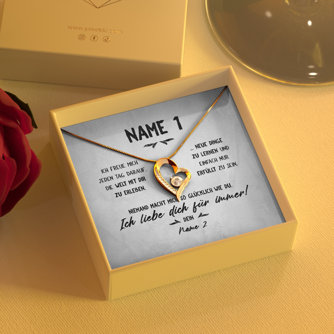 Du hast sofort gute Laune, wenn Dein Partner in Deiner Nähe ist? Dann überrasche ihn doch mit einem einzigartigen Geschenkset und sag Danke. Das Set umfasst ein von Dir ausgewähltes Schmuckstück und eine personalisierbare Grußkarte. Du kannst diese Karte mit dem schönen Spruch in nur wenigen Schritten individuell mit Euren Namen selbst gestalten. Das fertige Design wird Dir anschließend sofort angezeigt.