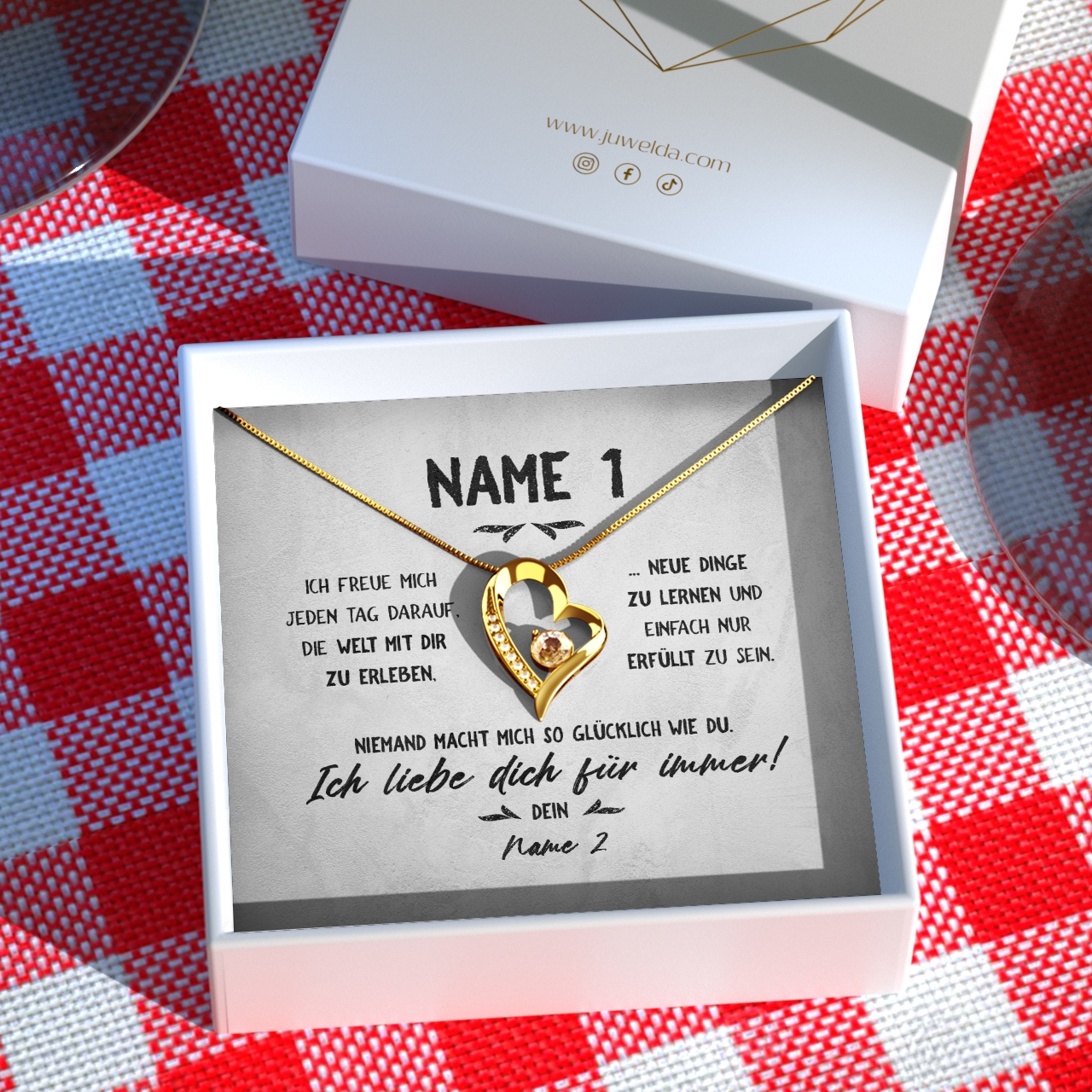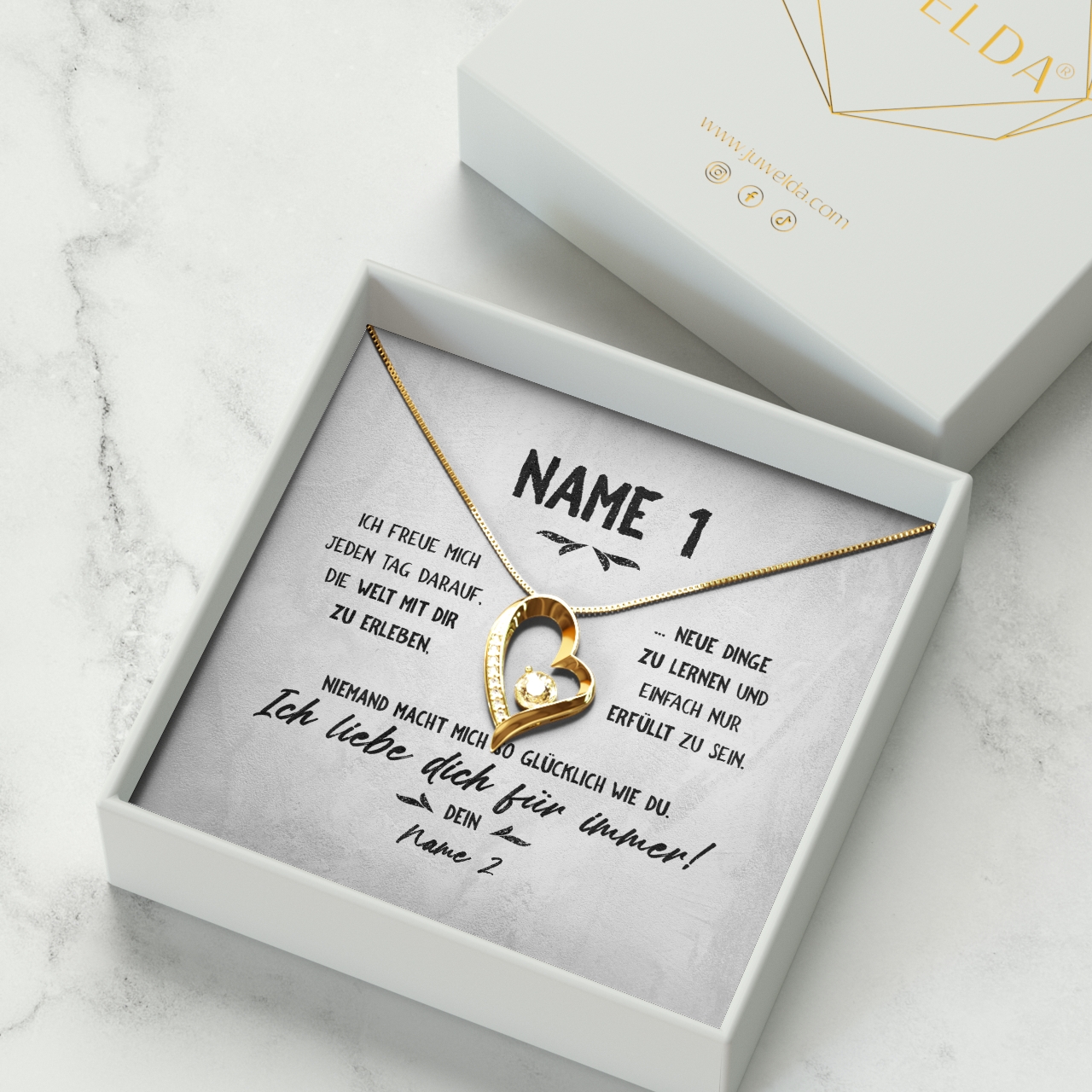 Möchtest Du Dein Geschenk sofort an Deinen Lieblingsmenschen überreichen? Dann solltest Du ein Blick auf die Variante mit der premium Geschenkverpackung werfen. Die Halskette Deiner Wahl und Deine personalisierte Karte werden liebevoll in eine hochwertige Schmuckbox mit Kunstlederüberzug und Samt-Innenbezug gelegt. Damit die Überraschung auch wirklich gut ankommt, wird alles behutsam in eine Geschenktasche gelegt, in Seidenpapier verpackt und mit einer Schleife zugebunden. Hier bekommst Du bereits einen kleinen Vorgeschmack: