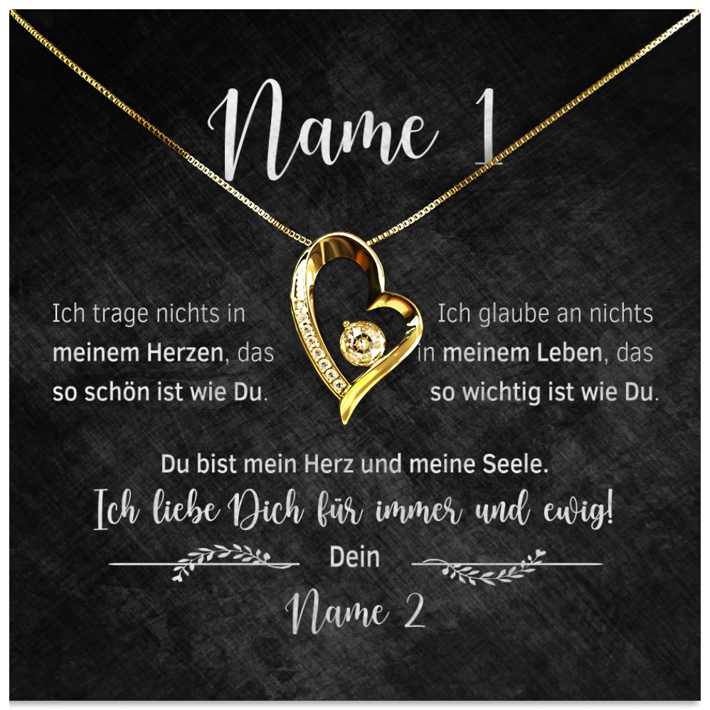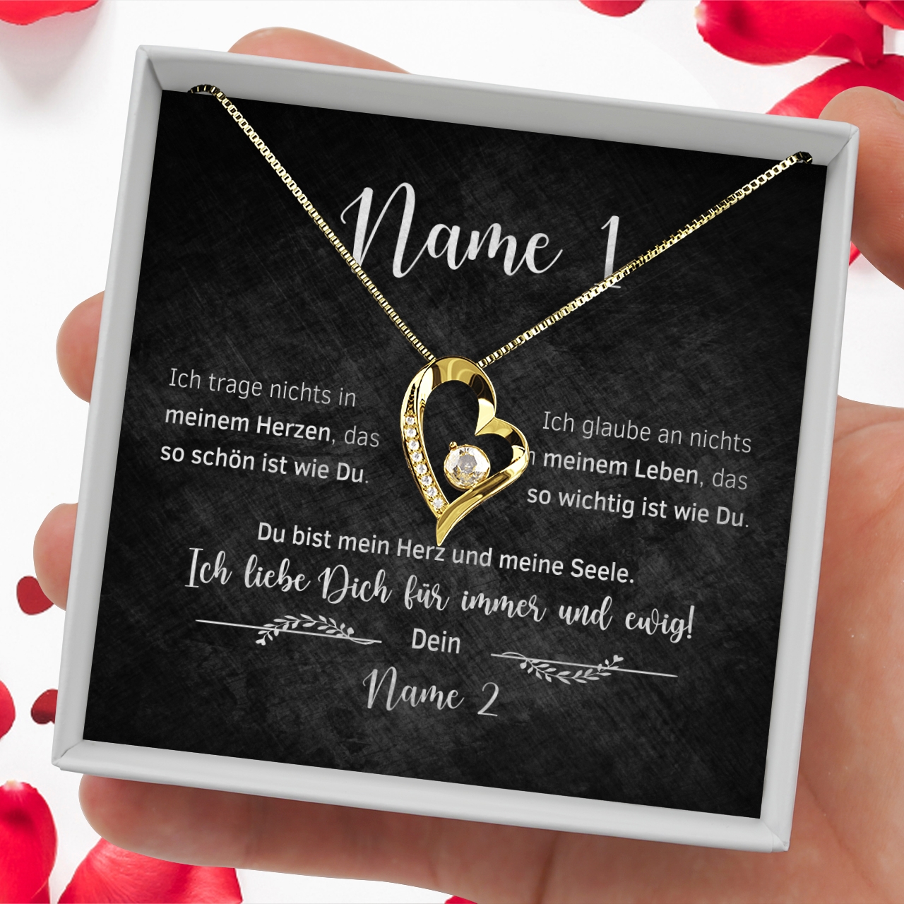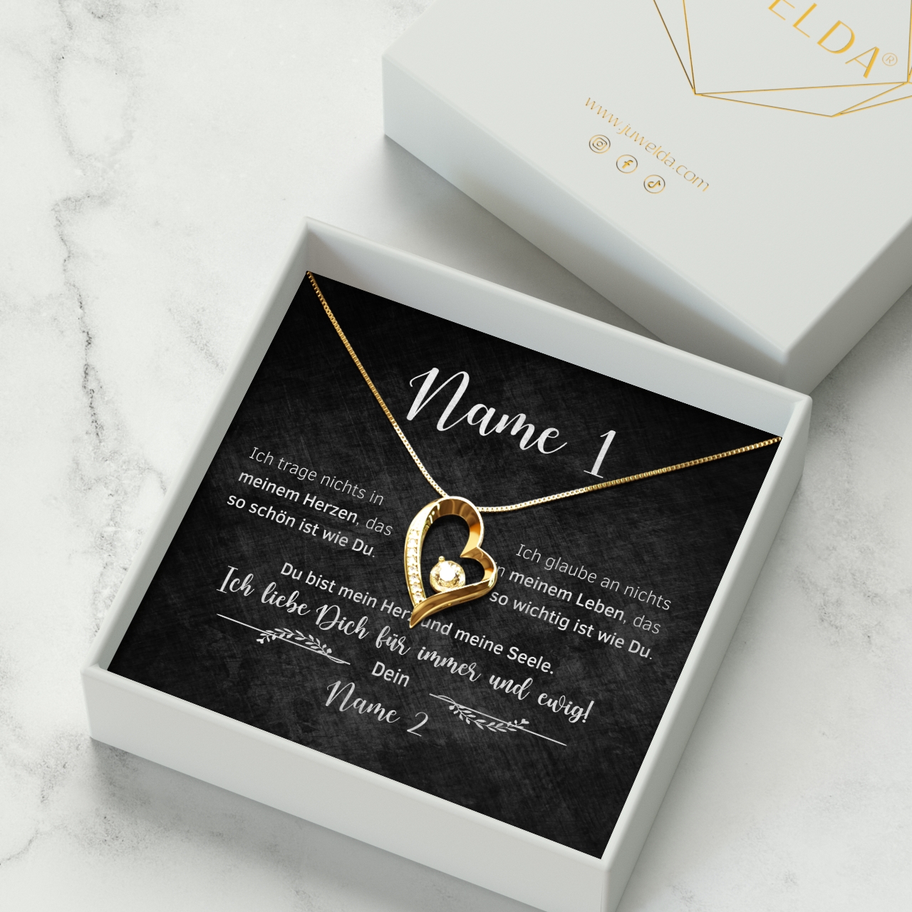 Du möchtest Deine Liebe für eine ganz besondere Person in Deinem Leben zum Ausdruck bringen? Mit einem Schmuckgeschenk und dieser schlichten, aber wunderschönen Grußkarte im personalisierten Design kannst Du dies tun. Die Karte lässt sich mit ein paar Klicks individuell mit Namen gestalten. Wir legen die Karte dann passend unter das von Dir ausgesuchte Schmuckstück für Deinen Partner. Das Geschenkset ist optimal zu allen Anlässen geeignet und ein echtes Highlight zum Jahrestag.
