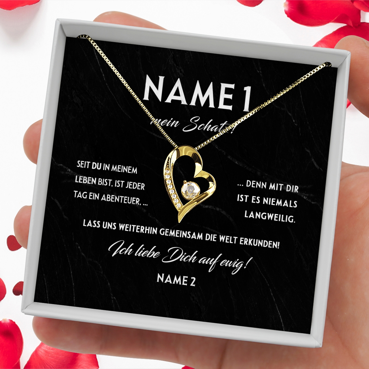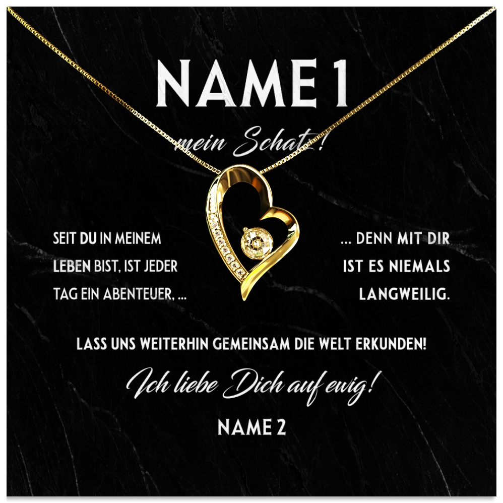 Wenn Du jemanden an Deiner Seite hast, mit dem das Leben besonders viel Spaß macht, ist es an der Zeit, Danke zu sagen und zu zeigen, wie viel diese Person Dir bedeutet. Mit einem Schmuckgeschenk und dieser personalisierbaren Grußkarten kannst Du dies ganz einfach tun. Denn das Set ist komplett vor Dir zusammengestellt und wird mit Namen individuell gestaltet. So verschenkst Du ein wahres Unikat an Deinen Partner.